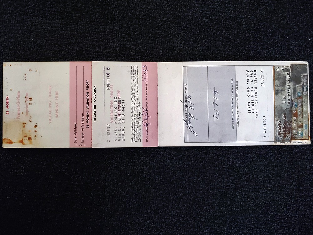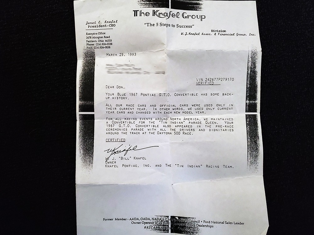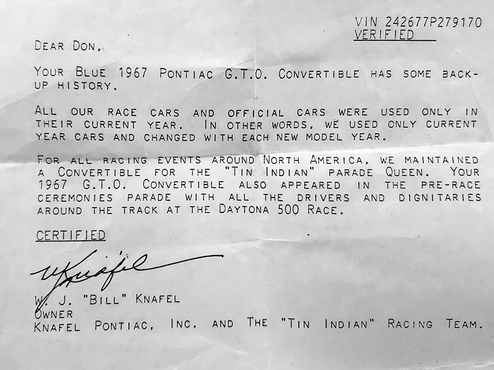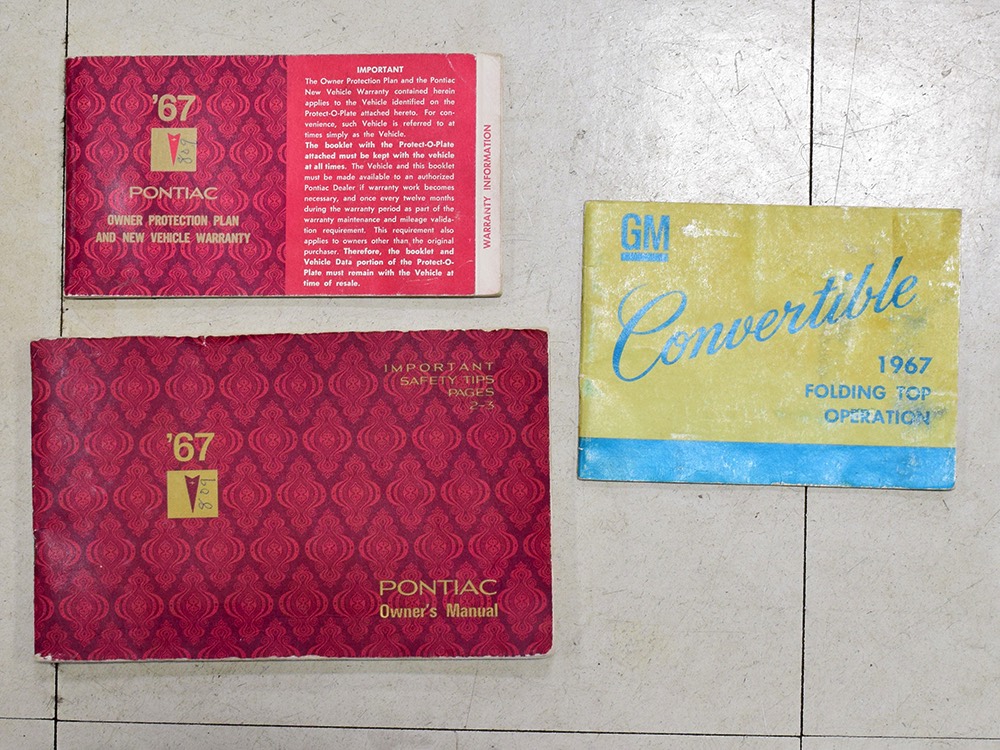 Documentation includes a full PHS package that verifies the specifications and numbers-matching status. It also includes the original manuals, Protect-O-Plate, top booklet, and a letter from Knafel Pontiac verifying that this was the car they used in the 1967 season as their parade vehicle.