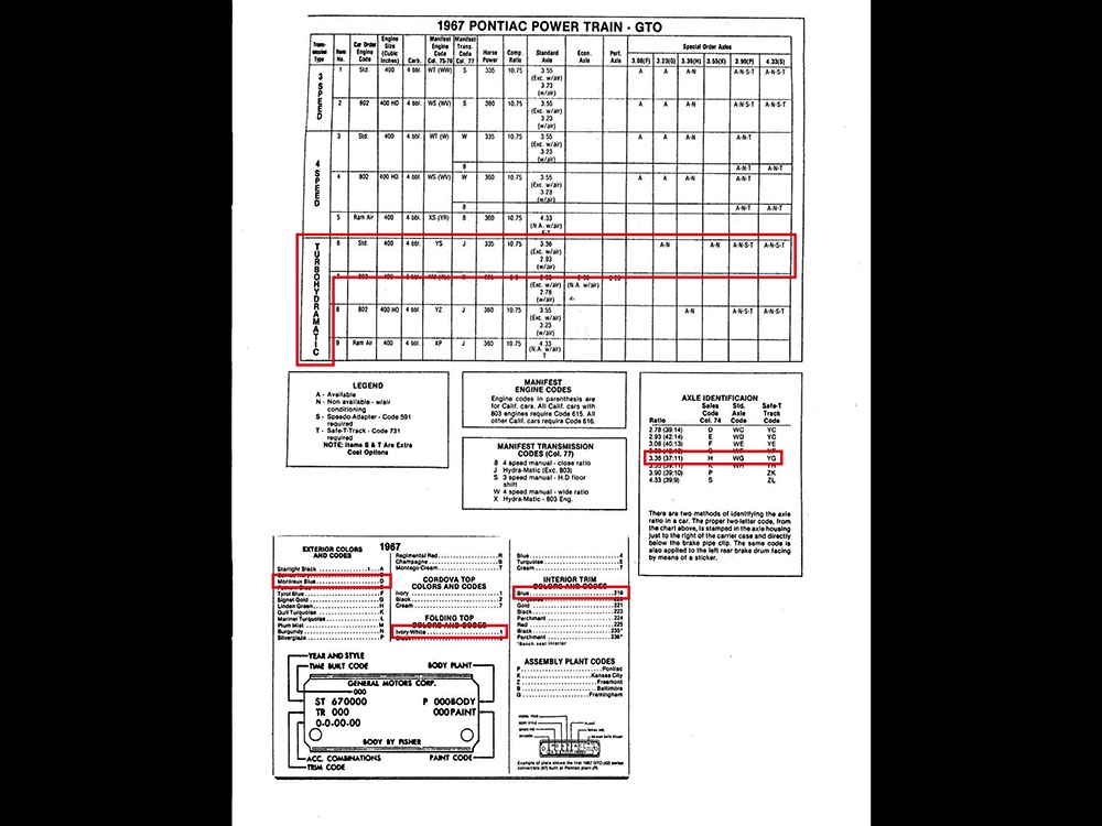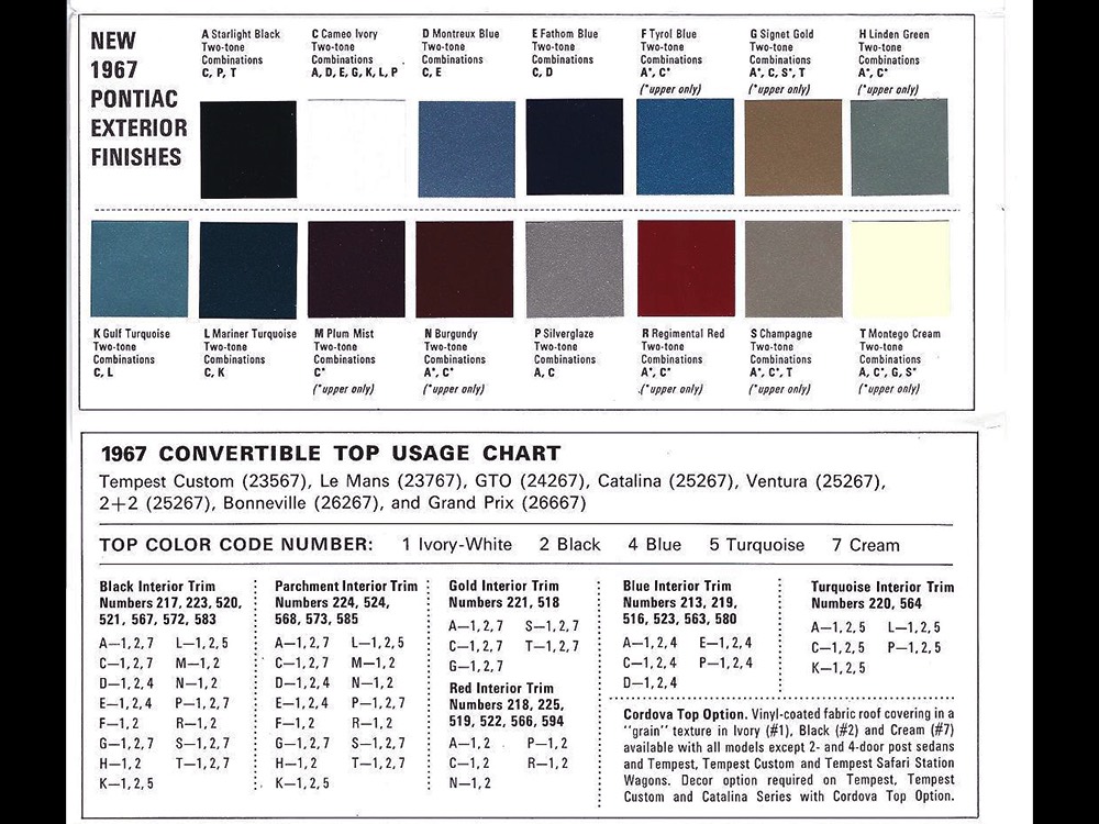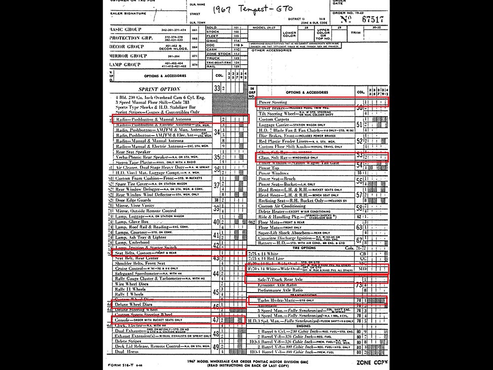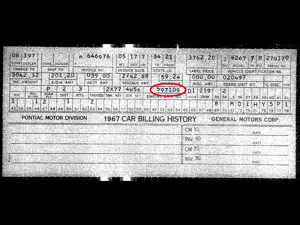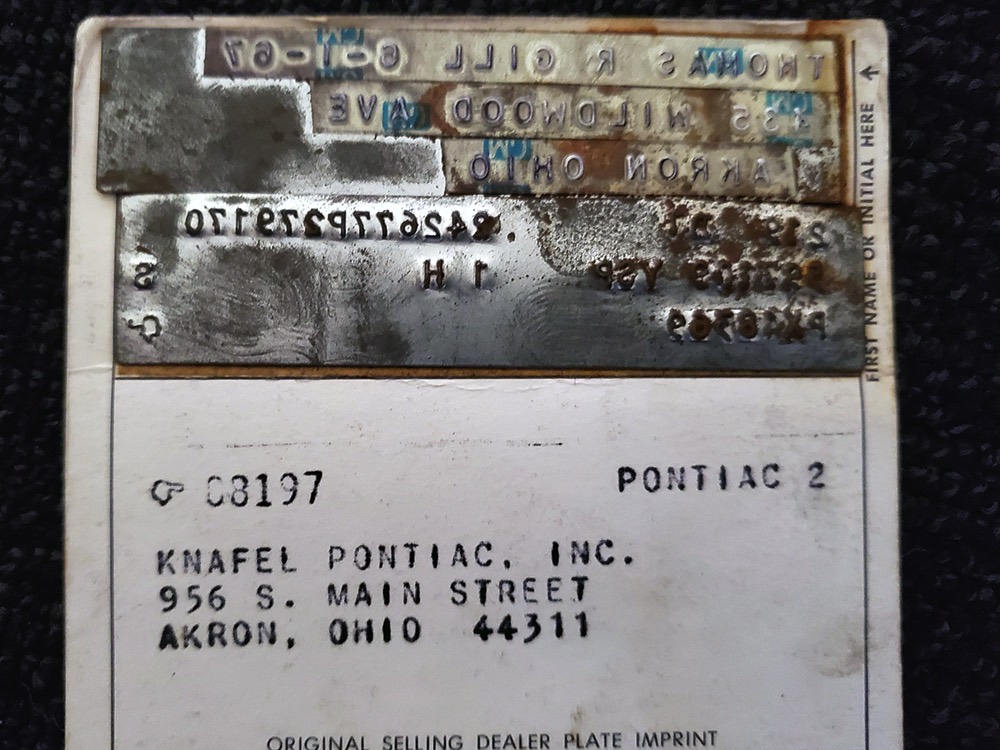 Documentation includes a full PHS package that verifies the specifications and numbers-matching status. It also includes the original manuals, Protect-O-Plate, top booklet, and a letter from Knafel Pontiac verifying that this was the car they used in the 1967 season as their parade vehicle.