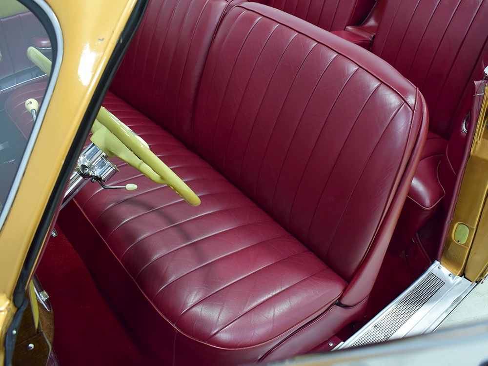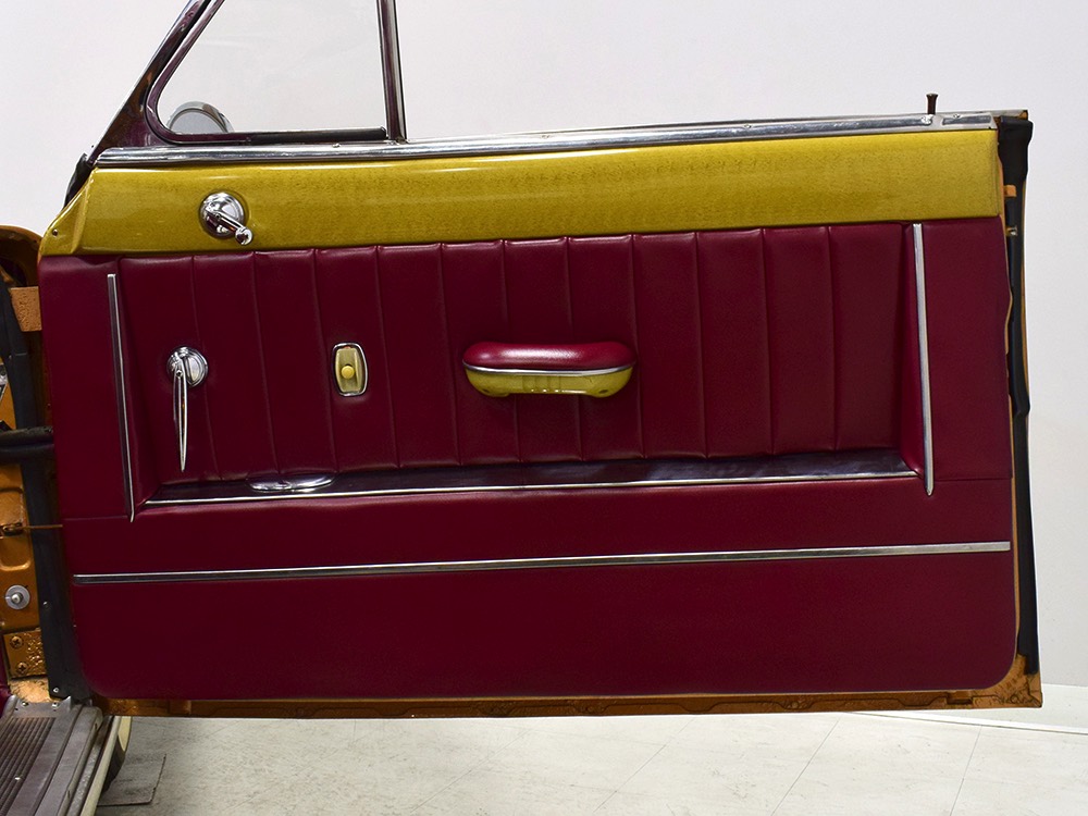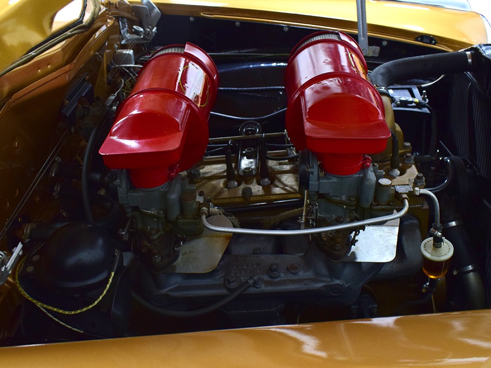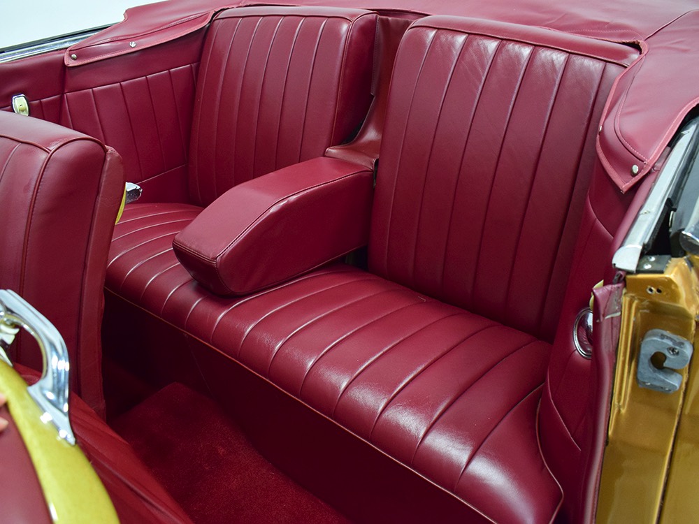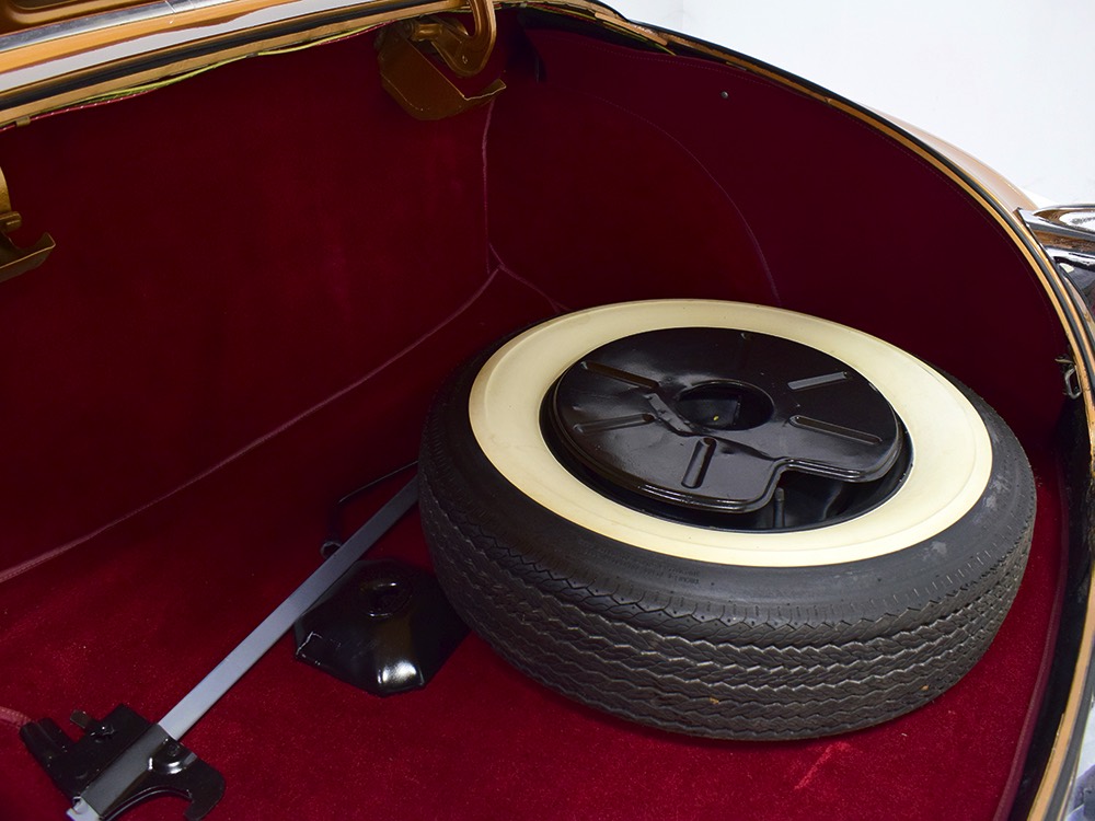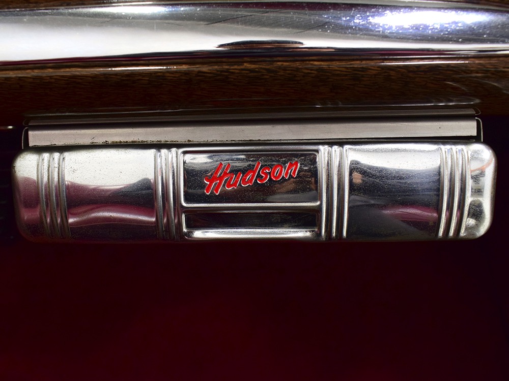 The lovely burgundy interior is expertly trimmed and quite luxurious—remember that Hudson was competing with Buick with this car, so it wasn't a cheap machine. The faux woodgraining on the dash is very convincing and all the gauges work, as does the radio. We recently serviced the power windows and top, so they're all working correctly as well, albeit slowly in this cold weather. The steering wheel and other plastics are in great shape, although there's some spalling on the horn button. The fog lights use their own switch on the dash that matches the headlight switch, and an accessory tissue dispenser is a nice touch. The tan canvas top is in great shape and stows under a matching burgundy boot that fits extremely well. The trunk is also trimmed in neatly bound carpets and includes a full-sized spare and jack assembly.