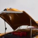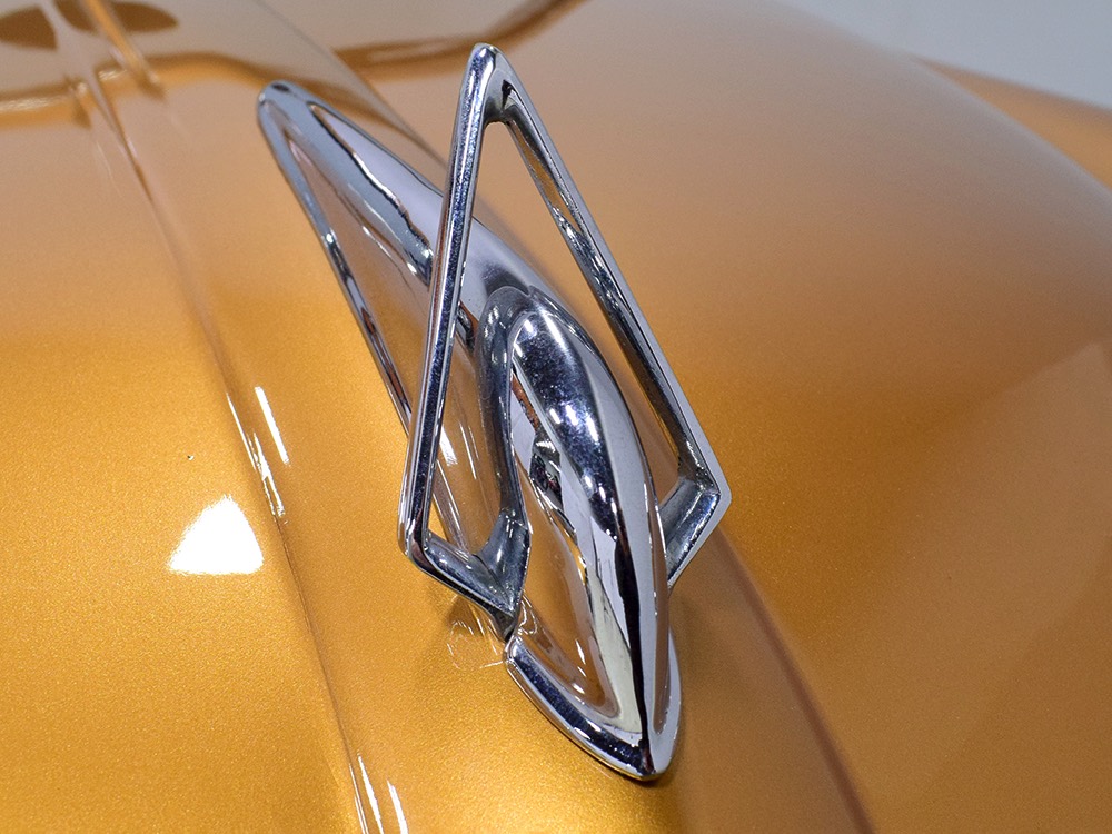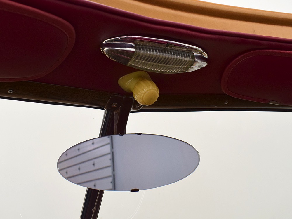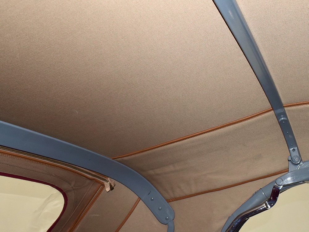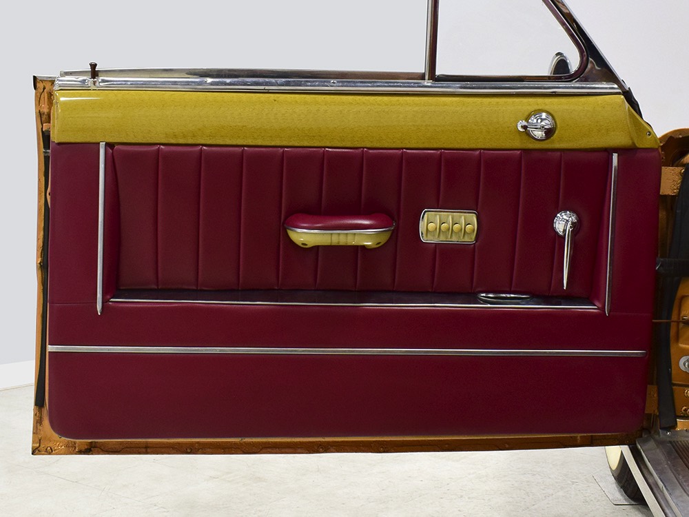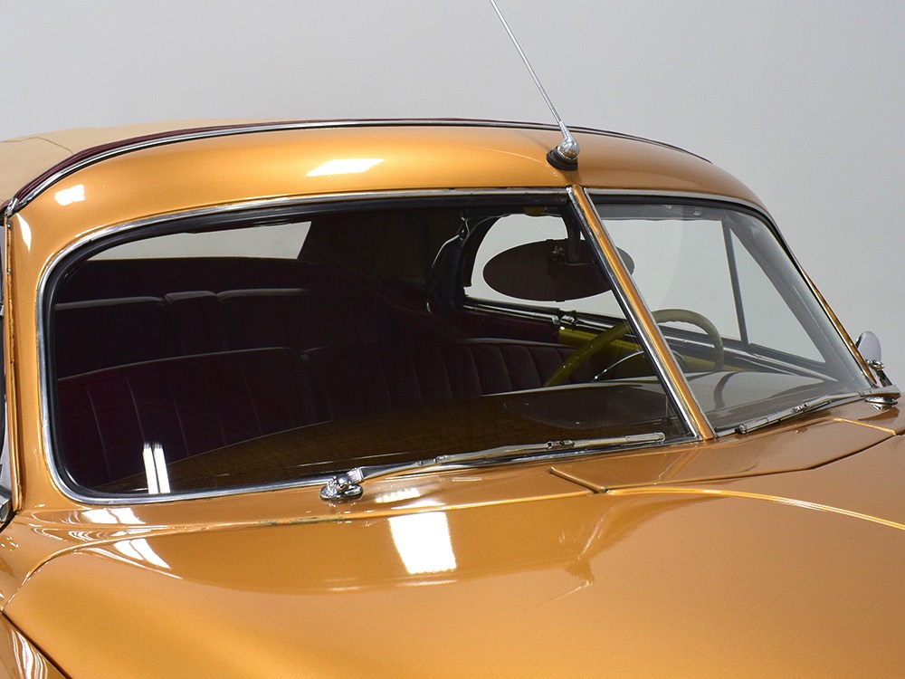 The lovely burgundy interior is expertly trimmed and quite luxurious—remember that Hudson was competing with Buick with this car, so it wasn't a cheap machine. The faux woodgraining on the dash is very convincing and all the gauges work, as does the radio. We recently serviced the power windows and top, so they're all working correctly as well, albeit slowly in this cold weather. The steering wheel and other plastics are in great shape, although there's some spalling on the horn button. The fog lights use their own switch on the dash that matches the headlight switch, and an accessory tissue dispenser is a nice touch. The tan canvas top is in great shape and stows under a matching burgundy boot that fits extremely well. The trunk is also trimmed in neatly bound carpets and includes a full-sized spare and jack assembly.