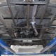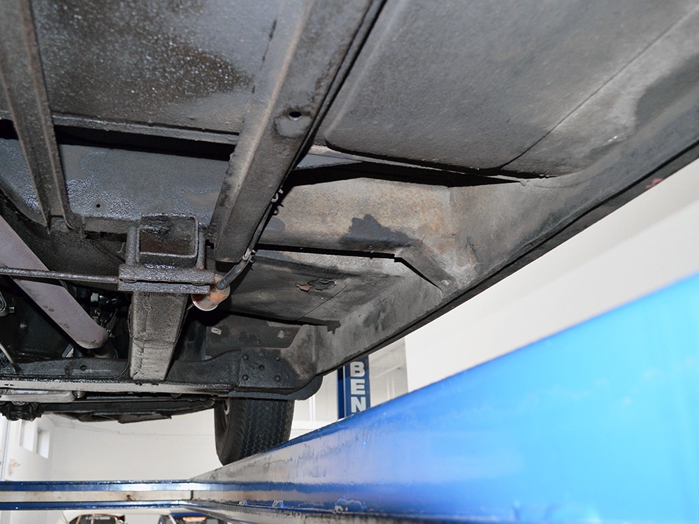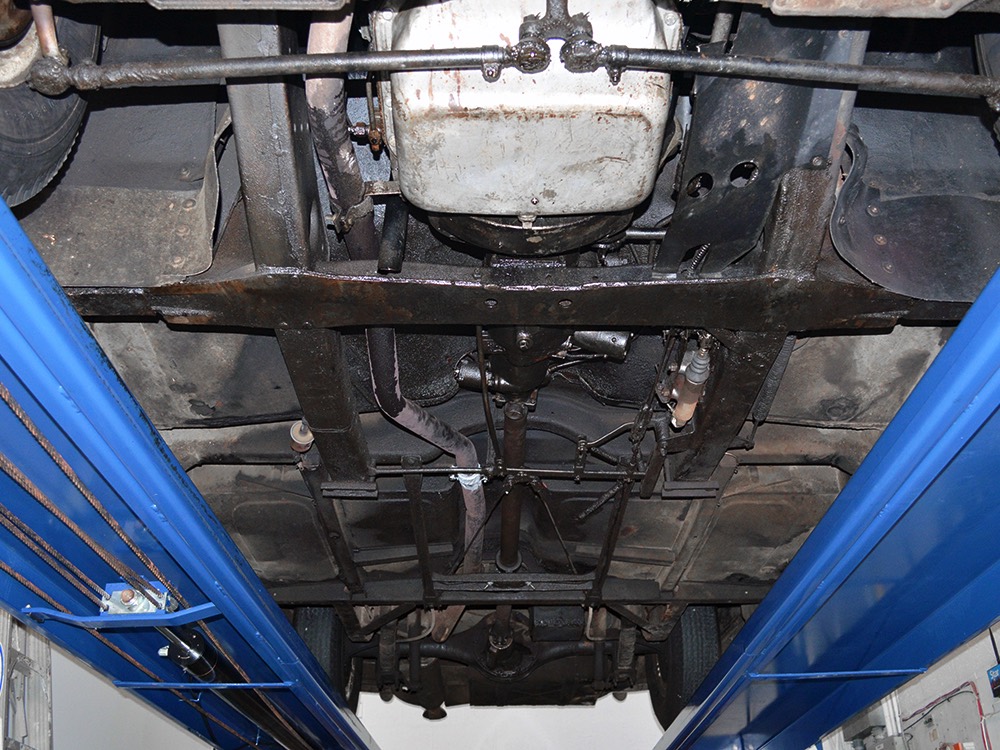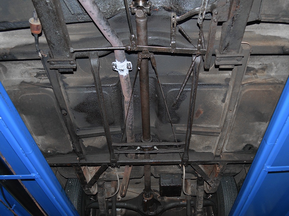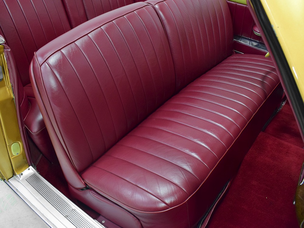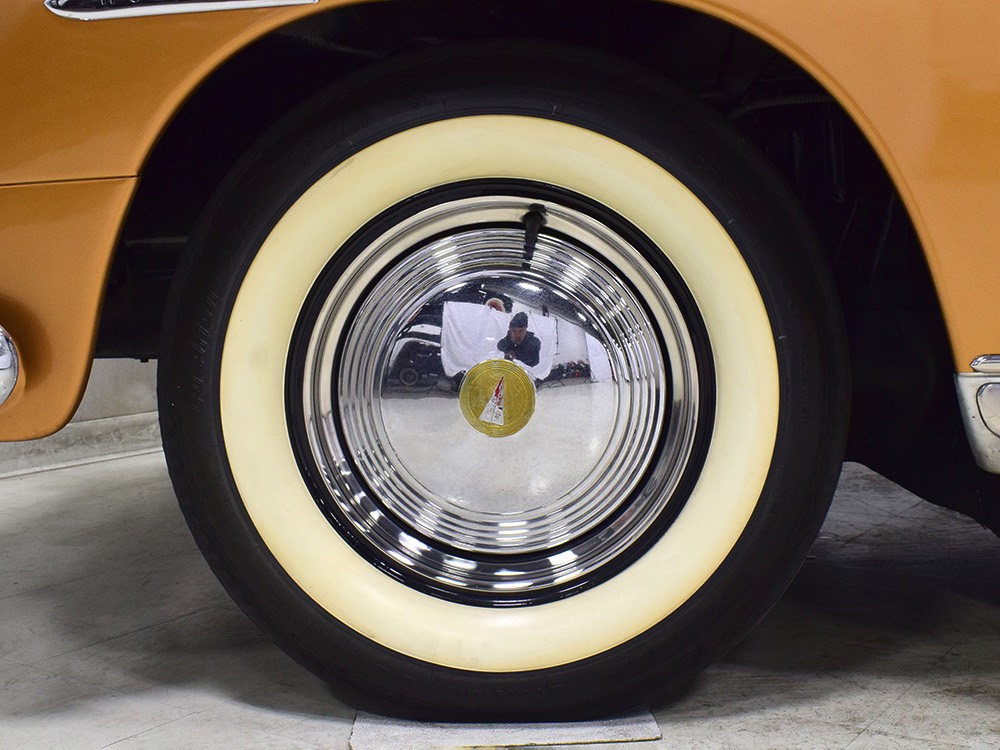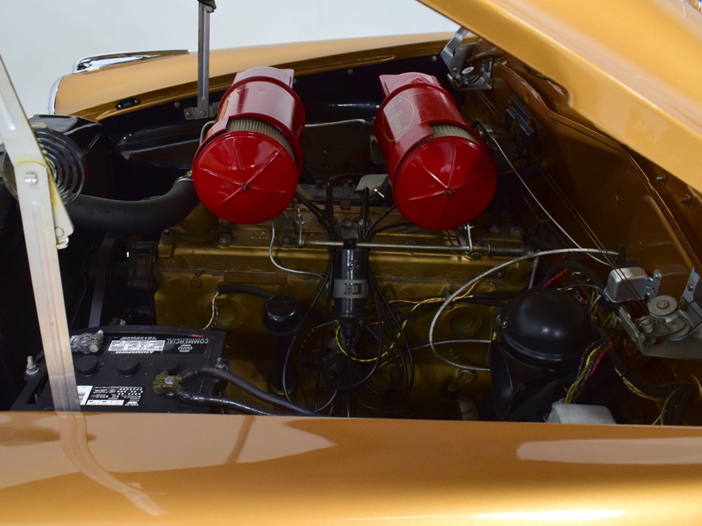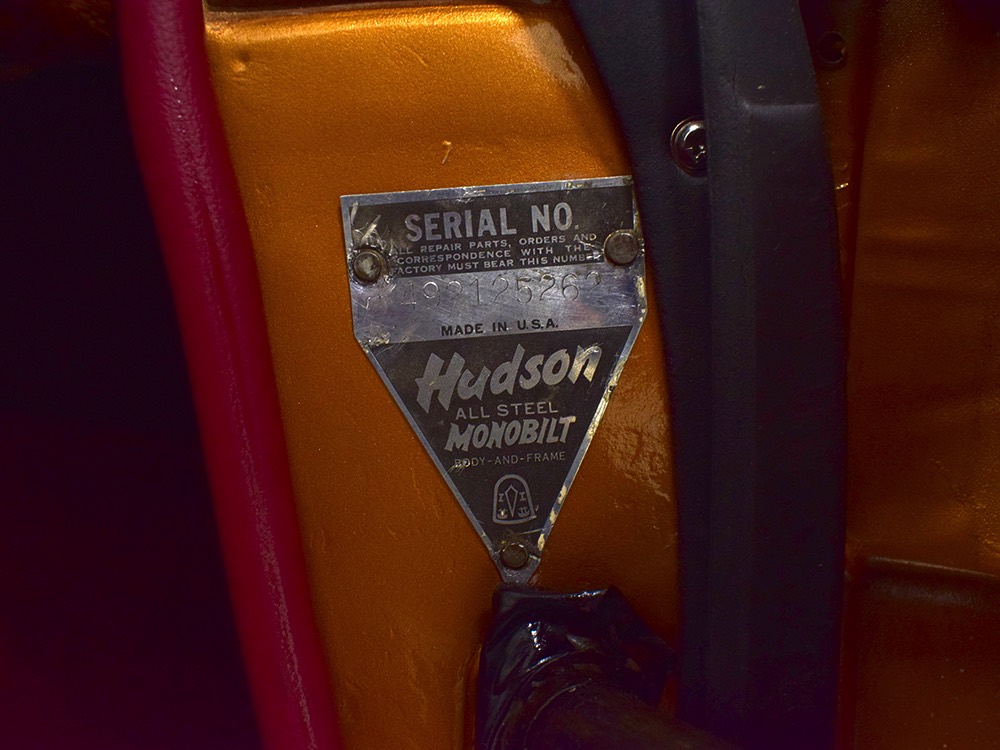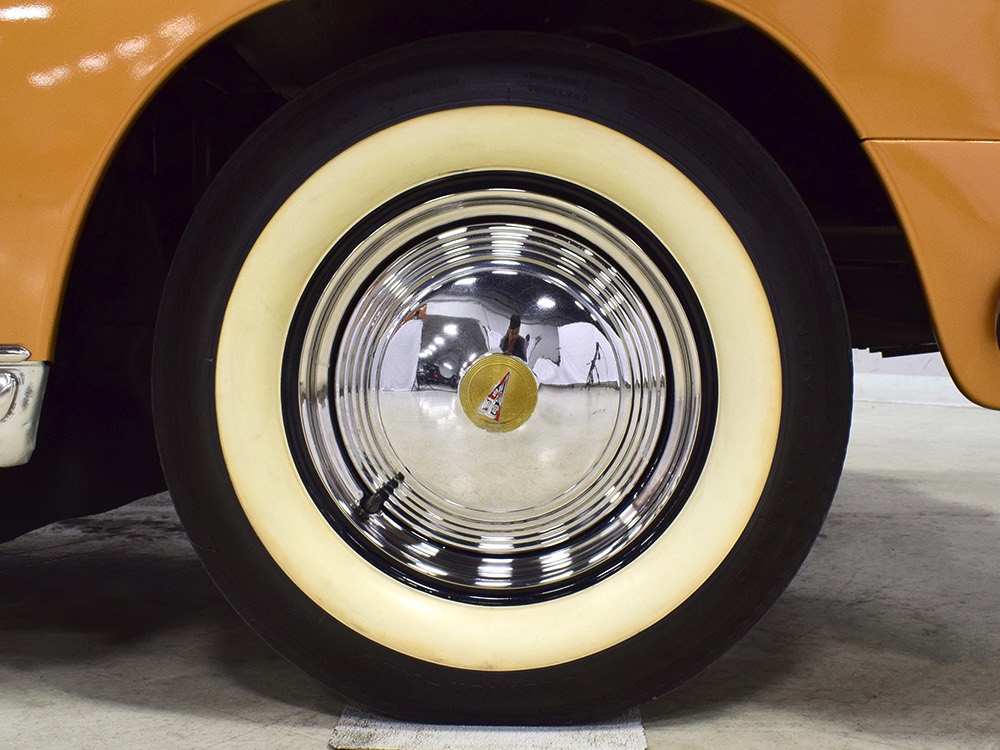 With a later 308 cubic inch inline-6 and Twin-H dual carburetors from a Hornet, this Commodore gets a nice boost in performance compared to the original six. It's correctly detailed with gold paint on the engine, bright red air cleaners, and a new wiring harness. It's also well tuned, started easily, idling smoothly, and pulling the big ragtop around with genuine enthusiasm. It's probably not as racy as it was in the lightweight Hornet, but it's certainly the fastest '49 Hudson you'll drive. Clutch action is light and smooth (no problems with the cork clutch), and the 3-speed manual gearbox shifts well. Overdrive makes this a genuine 70 MPH cruiser that should keep up with any traffic you'll encounter. The undercarriage isn't restored but it's solid and clean with no rust issues or patching—critical in the unit-body Hudson. Check out the unique structure under there, too, which an interesting study in early unit-body construction. Brakes are powerful, handling is surprisingly competent, and it has a great six-cylinder grumble on the road. Steel wheels with hubcaps carry fat G78-15 wide whites for a correct 1940s look.