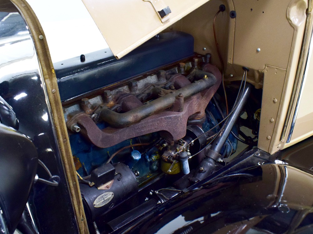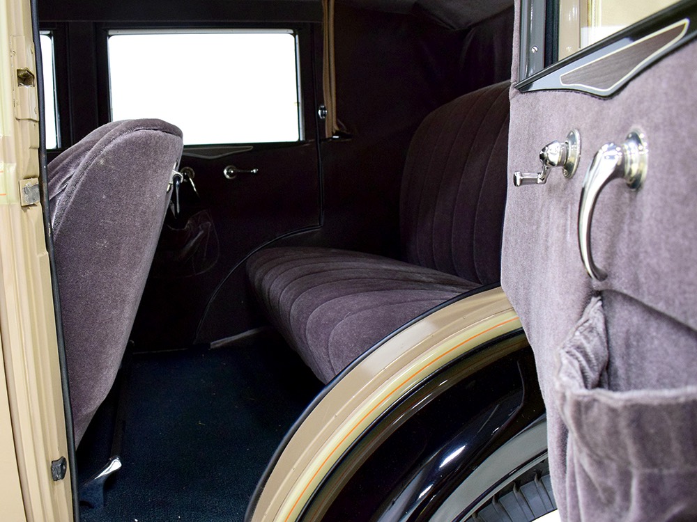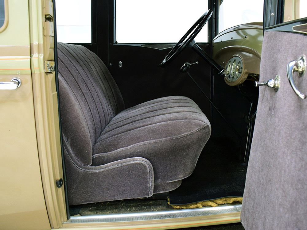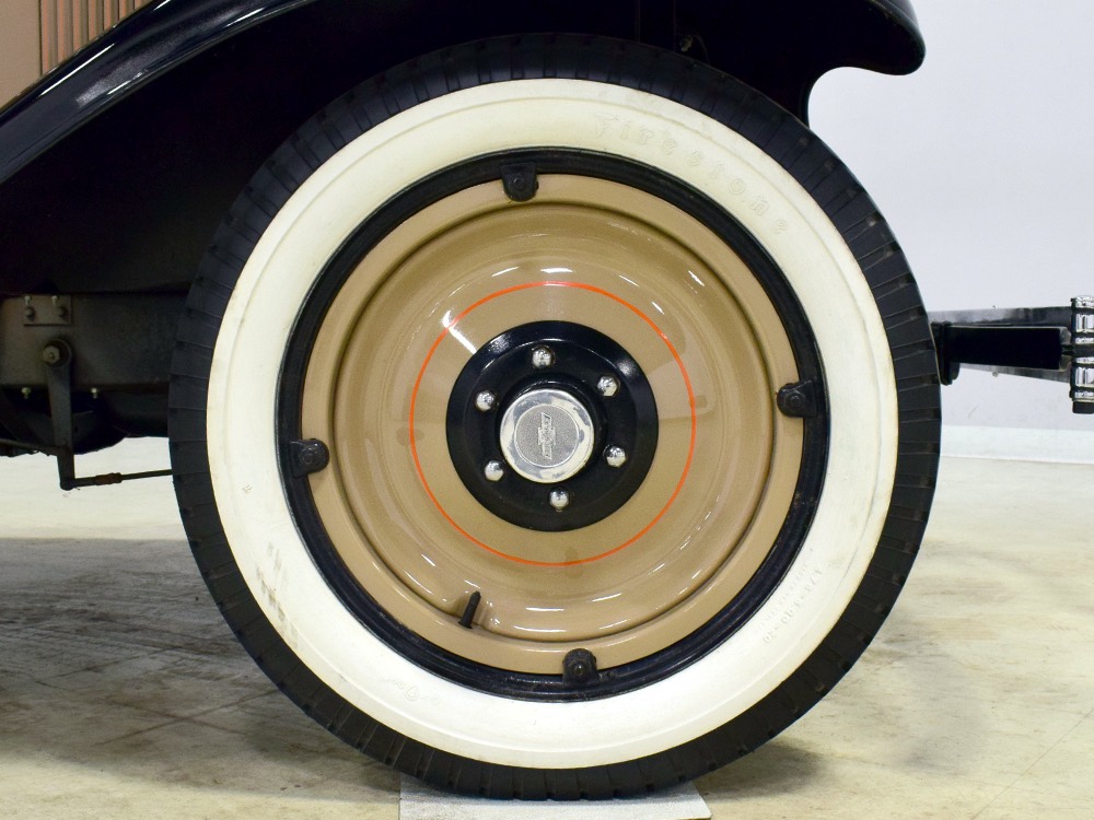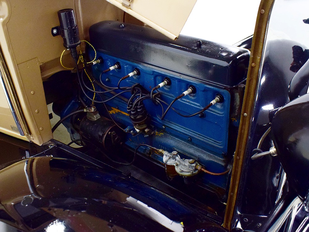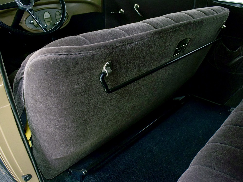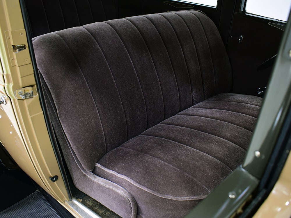Although our cameras have a hard time capturing the color properly (the lights make it look kind of purple), the interior is correct brown mohair front and back. The dashboard is the same simple setup used in other Chevrolets, with all the gauges and controls in a center gauge panel and they all seem to work correctly. The front seat features a rubber mat on top of a thick layer of insulation to help control noise and heat, while the rear seat is fully carpeted. The controls are standard, with a 3-speed manual transmission on the floor, although synchromesh was limited to Cadillacs in 1929 so brush up on your double-clutching. A full headliner makes it feel like a standard sedan inside, but you’ll quickly spot the latches holding the rear half of the top above the back seat, and it folds easily to add an open-air experience. There’s also a crank-open windshield, all of which make this Chevy a pretty nice place to spend some time.