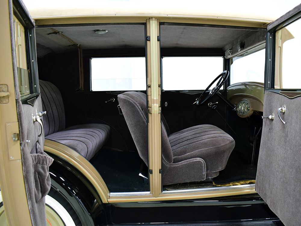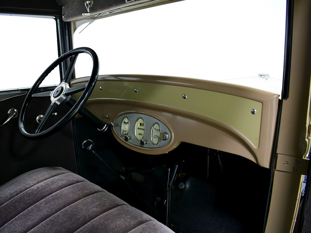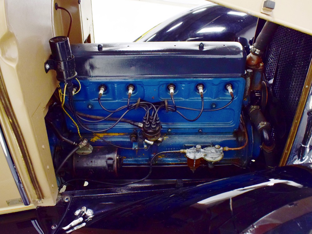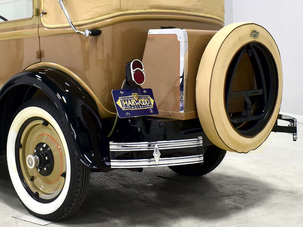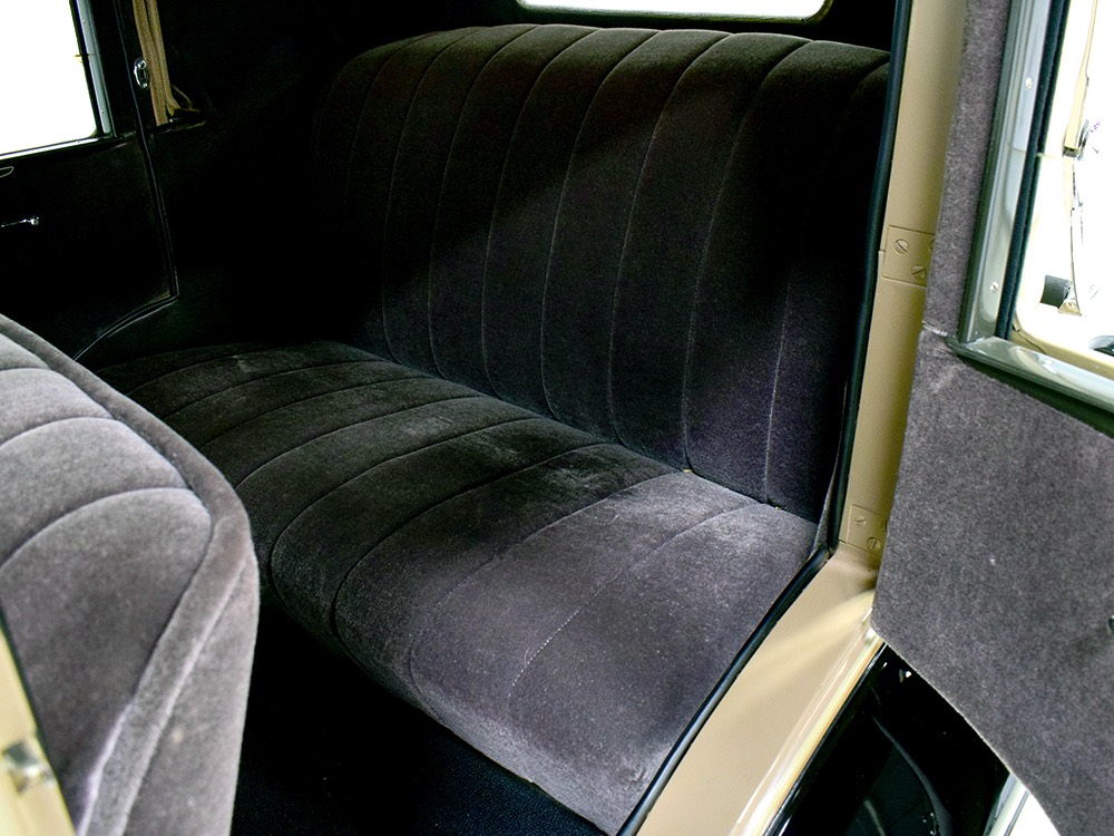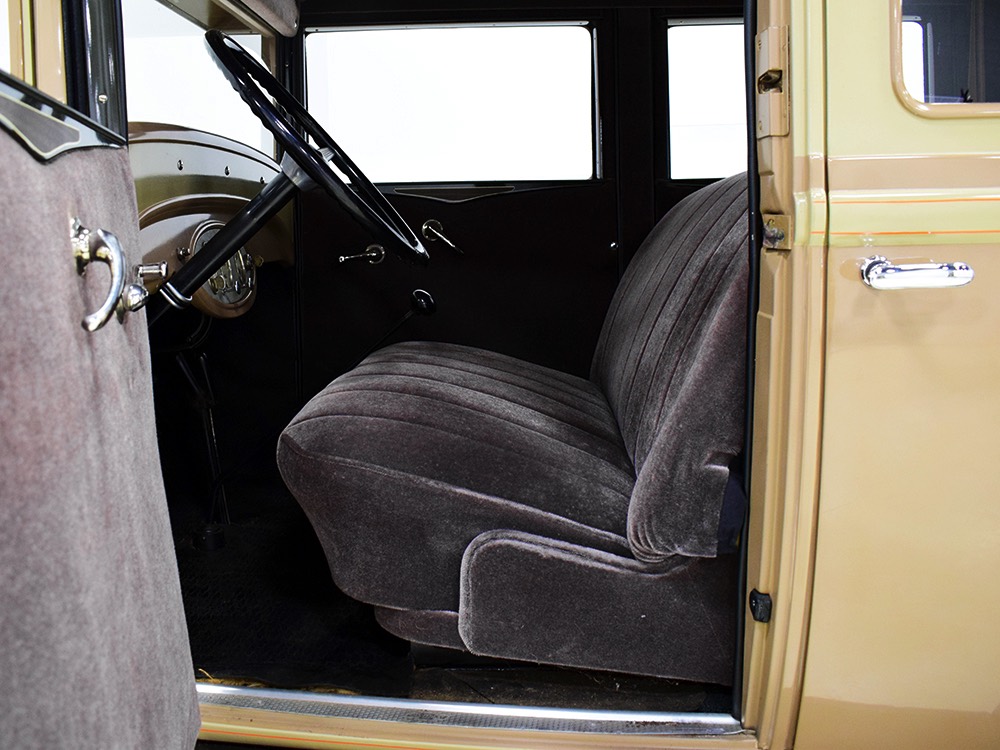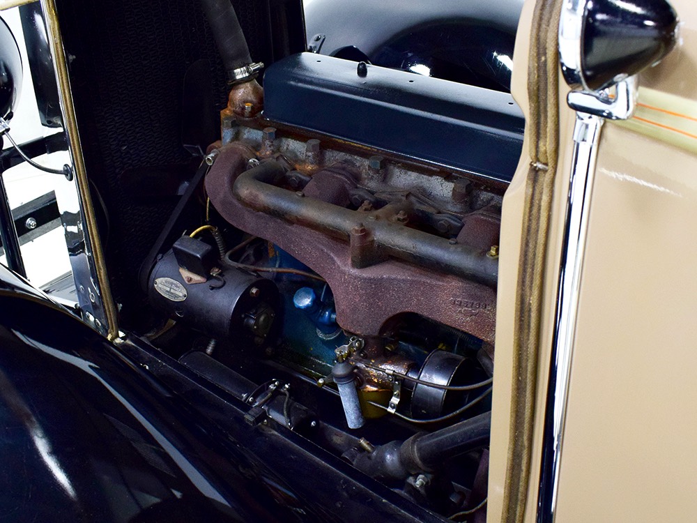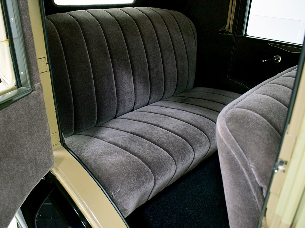 Although our cameras have a hard time capturing the color properly (the lights make it look kind of purple), the interior is correct brown mohair front and back. The dashboard is the same simple setup used in other Chevrolets, with all the gauges and controls in a center gauge panel and they all seem to work correctly. The front seat features a rubber mat on top of a thick layer of insulation to help control noise and heat, while the rear seat is fully carpeted. The controls are standard, with a 3-speed manual transmission on the floor, although synchromesh was limited to Cadillacs in 1929 so brush up on your double-clutching. A full headliner makes it feel like a standard sedan inside, but you’ll quickly spot the latches holding the rear half of the top above the back seat, and it folds easily to add an open-air experience. There’s also a crank-open windshield, all of which make this Chevy a pretty nice place to spend some time.