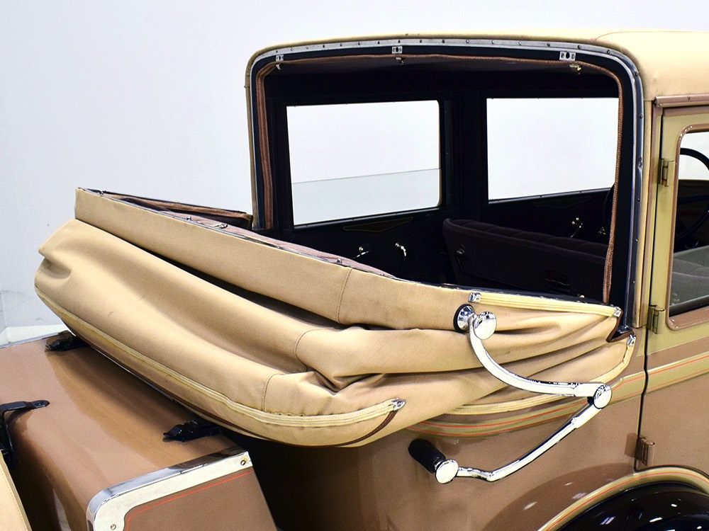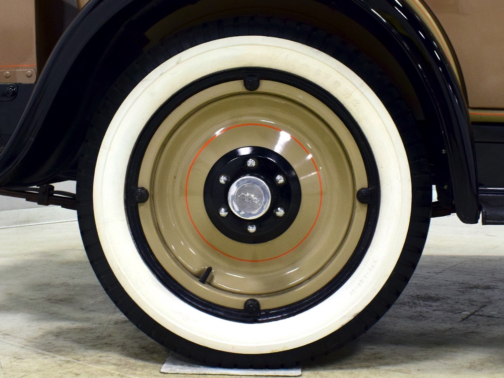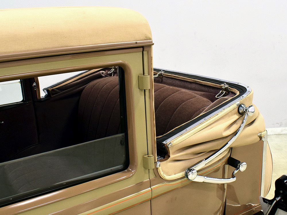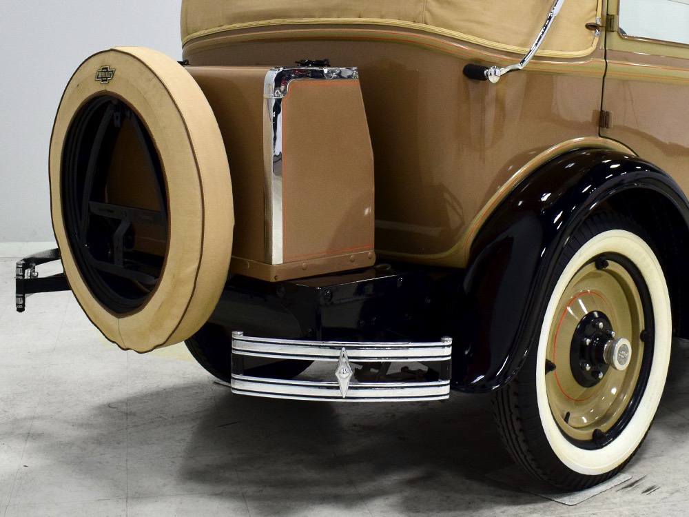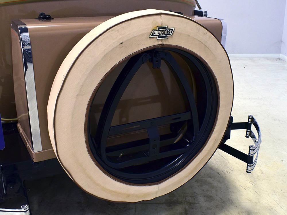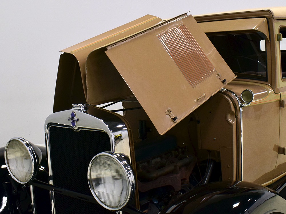 Wearing an older restoration, this Landau sedan remains in excellent condition throughout. For the past several years it has worked weekends attending weddings and posing for photos with happy couples, which means it’s in top mechanical health and looks fantastic. Landau sedans only came in one color combination, Crockett Brown with Mistino Gray moldings and Omaha Orange pinstripes, and it adds to the Landau’s upscale look. At a glance, you’d never really notice the folding rear roof, and there’s plenty of familial resemblance to big brother Cadillac, including the shape of the grille, landau bars, and the visor over the windshield. It remains in excellent condition with a nice shine to the paint, correct pinstripe patterns, and bright chrome that adds just the right upscale accent. There are a few minor signs of age and use, but nothing that detracts from the overall presentation. It carries an accessory trunk with rear-mounted spare, and the trunk folds out to create a fairly substantial cargo bay, making this Chevy a great choice for pre-war touring.