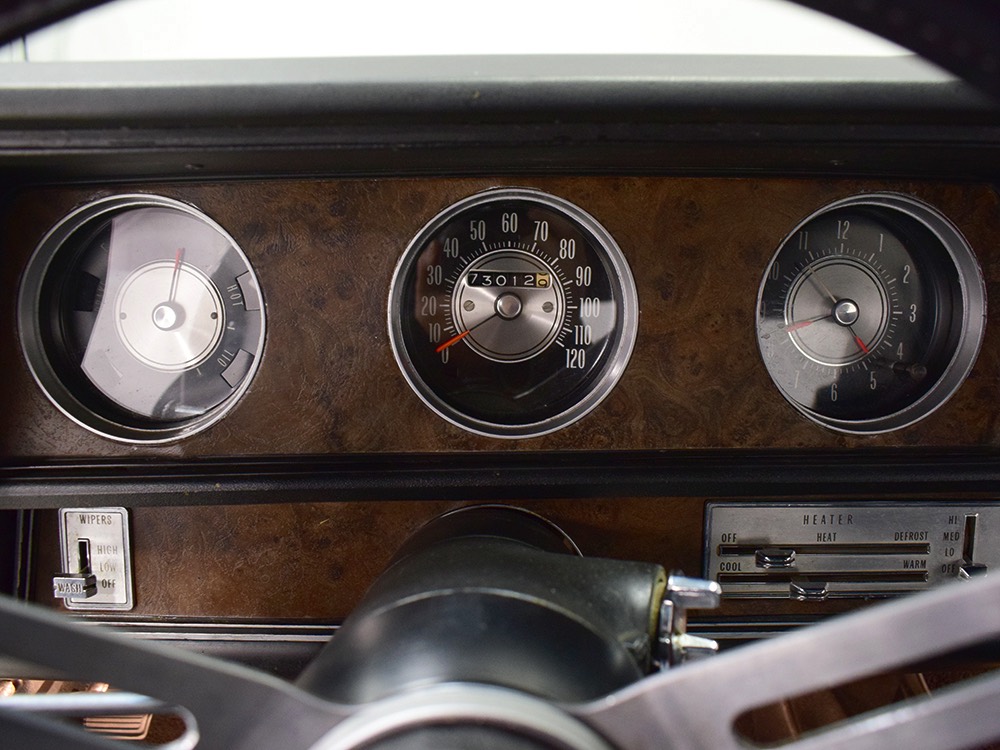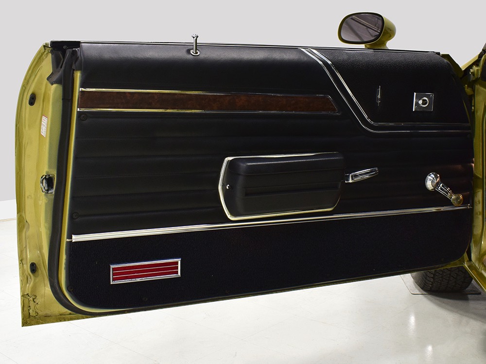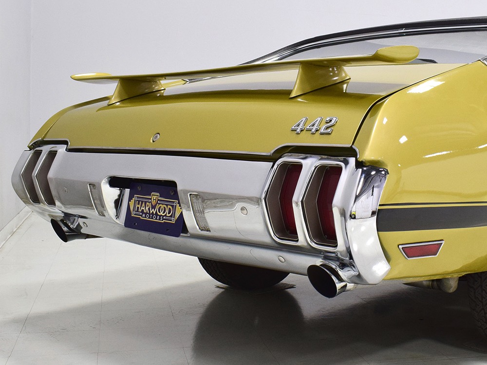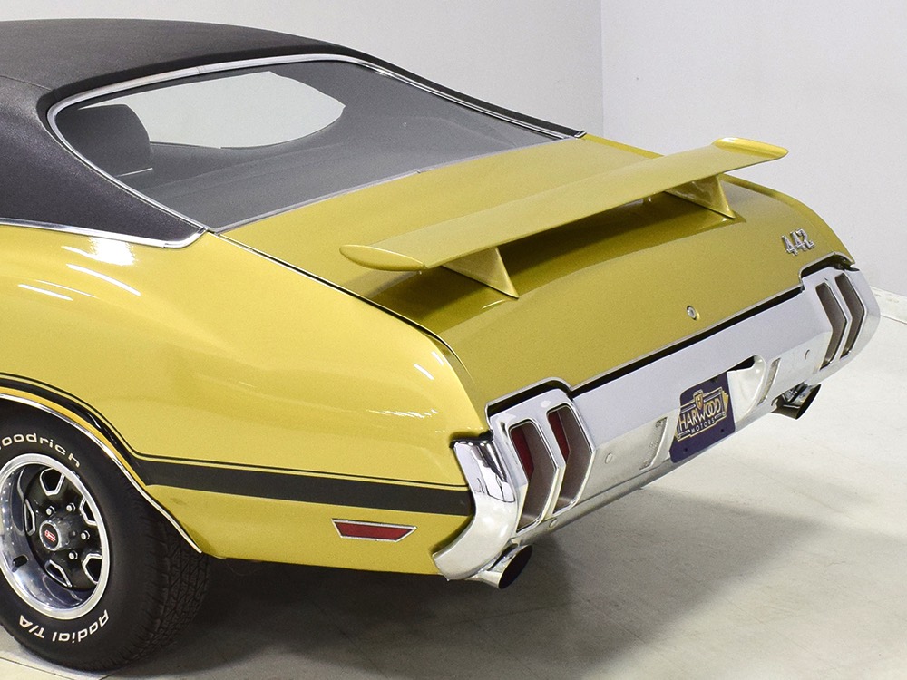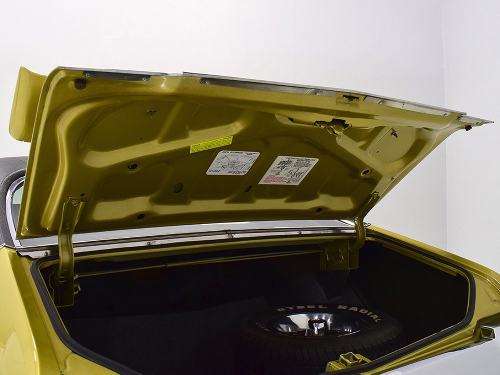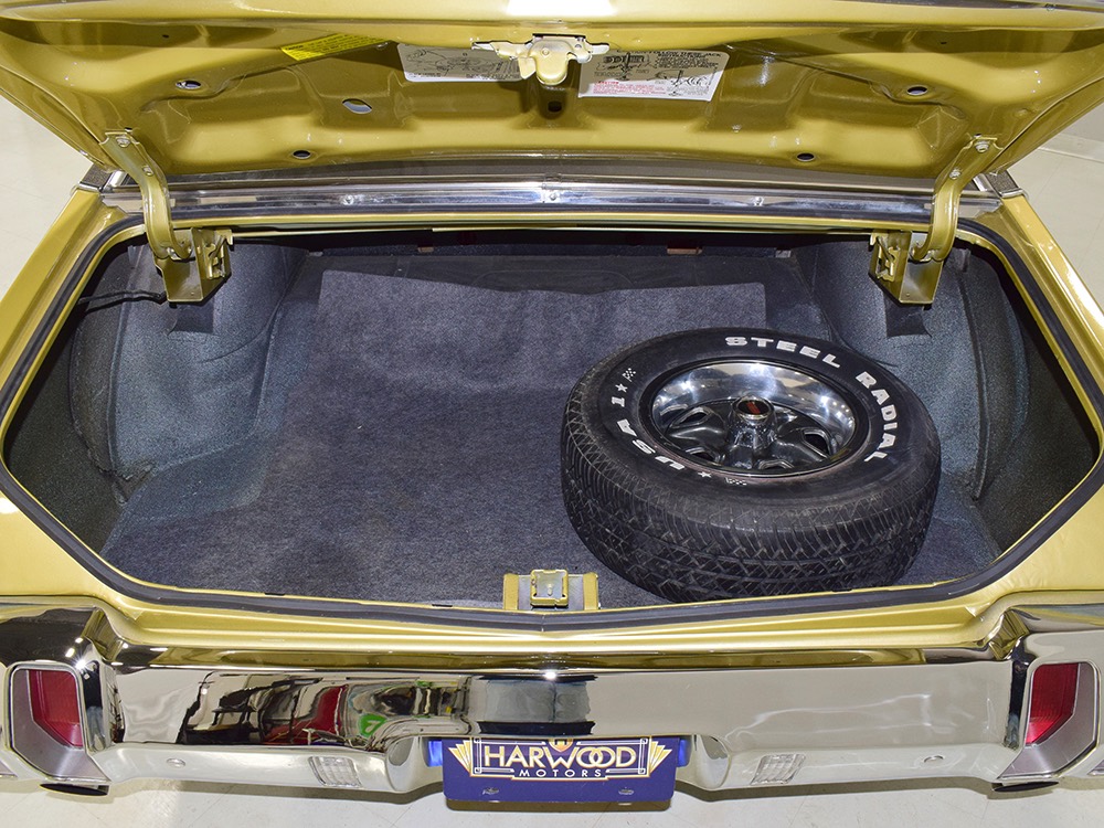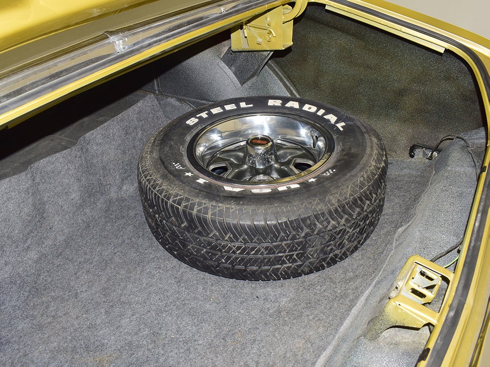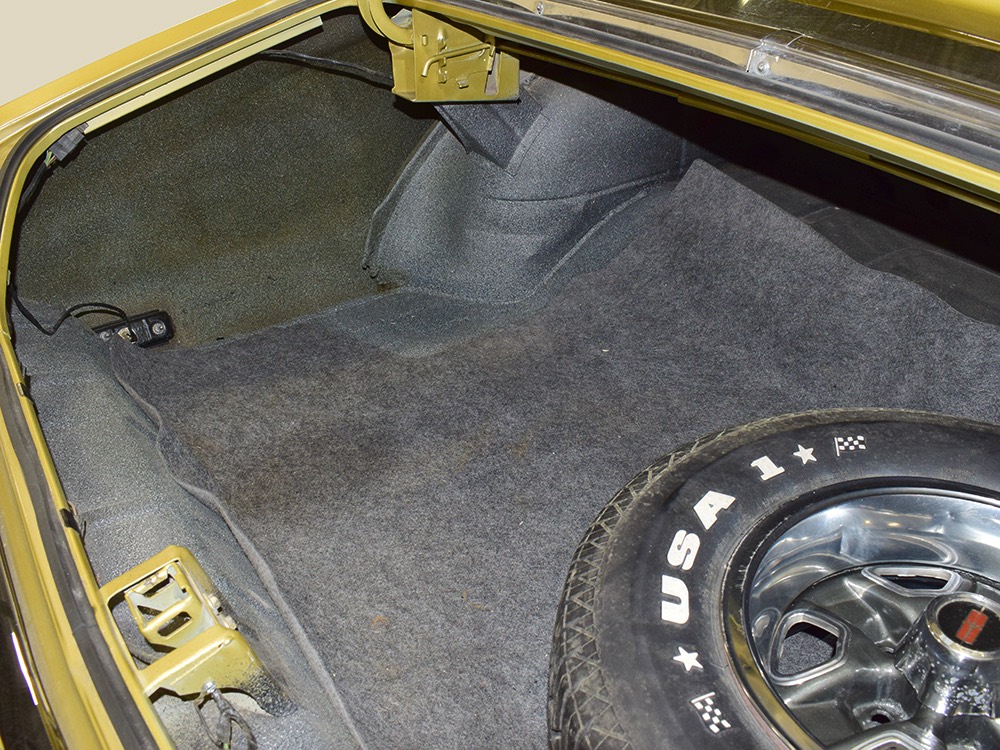 The black vinyl interior is very nicely trimmed and accurately replicates the textured vinyl used on the 442s. It’s an upscale look that contrasts nicely with the stripes and rear wing, suggesting that you got a little extra luxury with your Oldsmobile muscle. The burled walnut instrument panel adds to that effect, and the brushed stainless steel gauge faces certainly look upscale. A console with a 4-speed is a great find in a car like this, and less than 25% of the 1970 442s were built with 4-speeds, making it a relatively rare bird. Of course it carries a Hurst shifter—is there a closer relationship than that of Hurst and Olds? There’s also a factory AM radio, but this car is light on options, which suggests that the original owner cared mostly about the important stuff: going fast. The headliner is a little wrinkly, but the flash makes it look worse than it is and in person it’s quite presentable, so don’t think too hard about it. It also includes a fully finished trunk with matching SSII wheel and correct spatter-finish paint.
