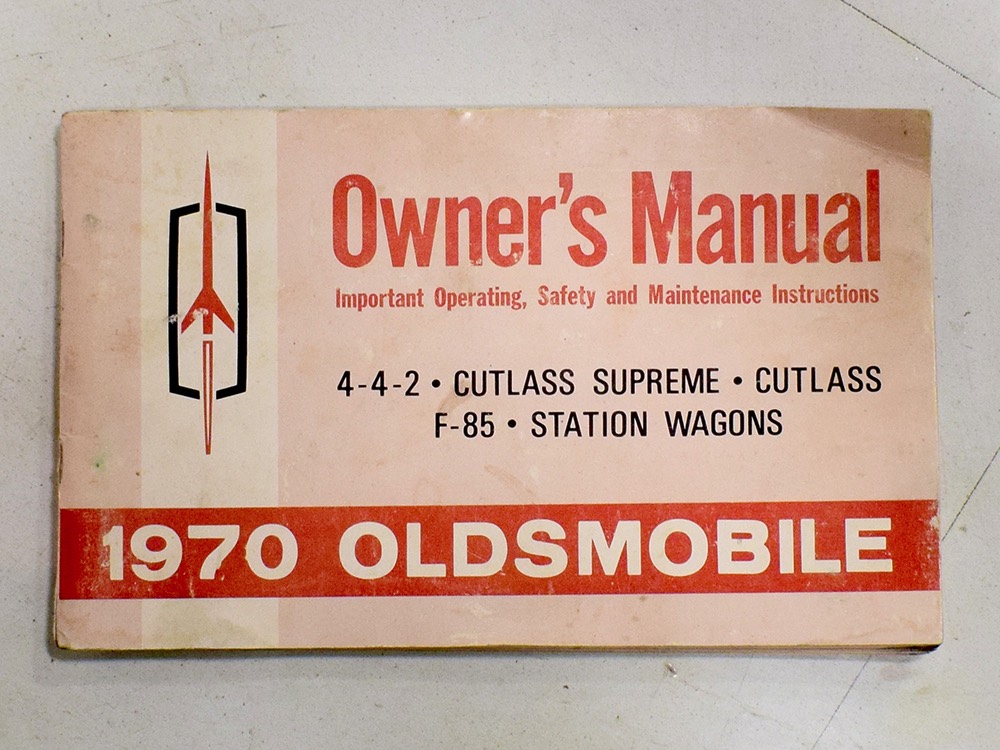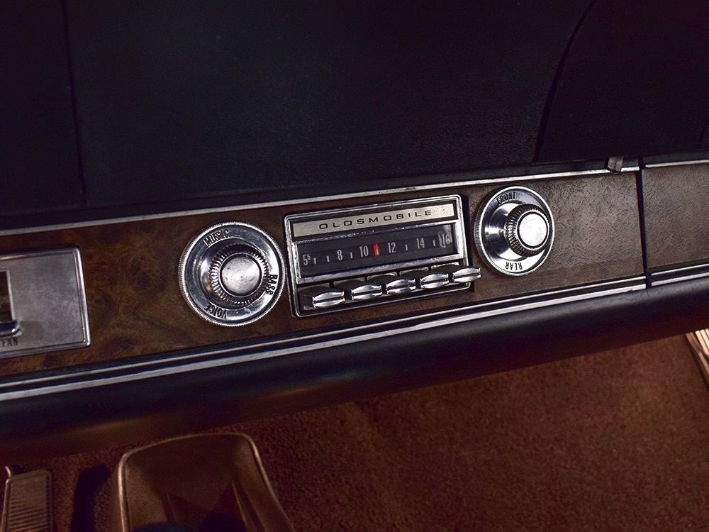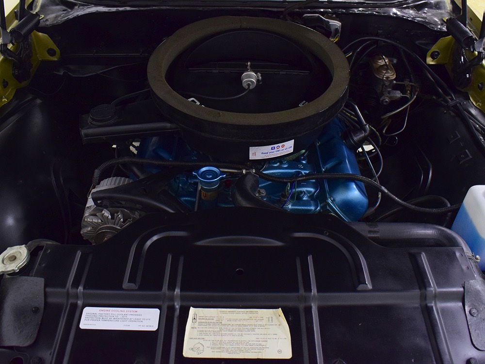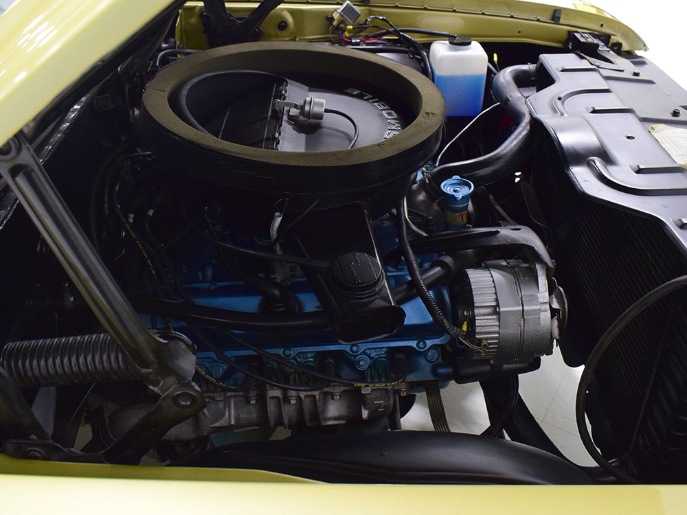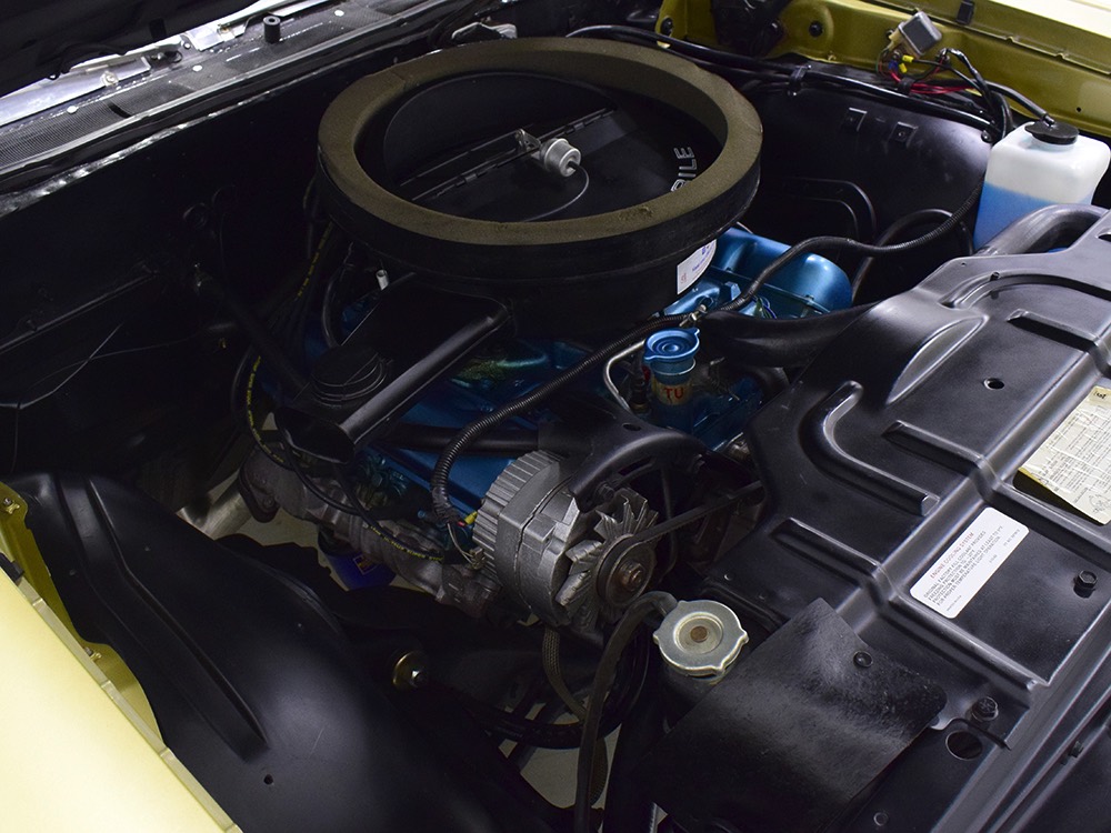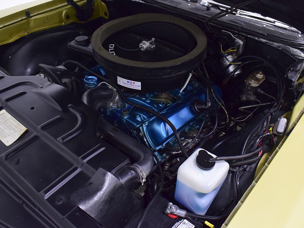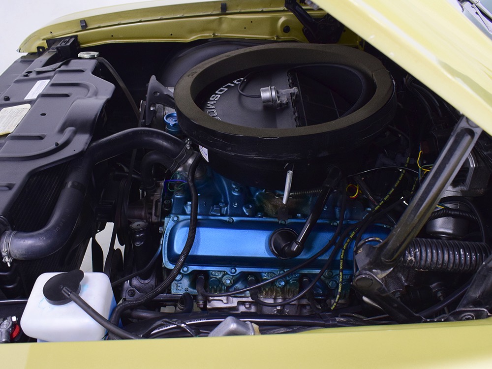 The 455 cubic inch V8 is stamped with the last seven digits of the VIN and is correct for this car. The engine bay is dominated by the ram air setup atop the carburetor, which does indeed snap closed when the engine fires, so it’s working correctly. Corporate blue engine enamel replaced the usual gold in 1970, and offers a nice contrast to the satin black inner fenders and firewall. The big V8 starts easily, idles smoothly, and with a mountain of torque on tap, it moves the relatively lightweight Cutlass without much effort at all—this sucker is fast! The block is a correct 396021 F casting, the heads are E castings, and even the alternator is the right unit. It remains completely stock, so no questionable modifications and it even runs the original carburetor and exhaust manifolds.