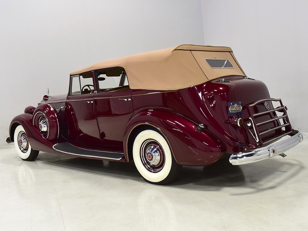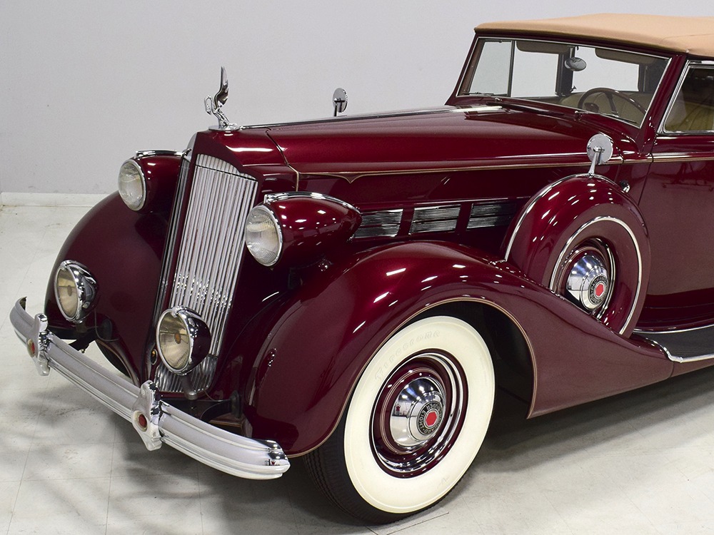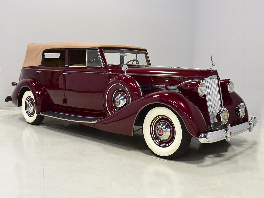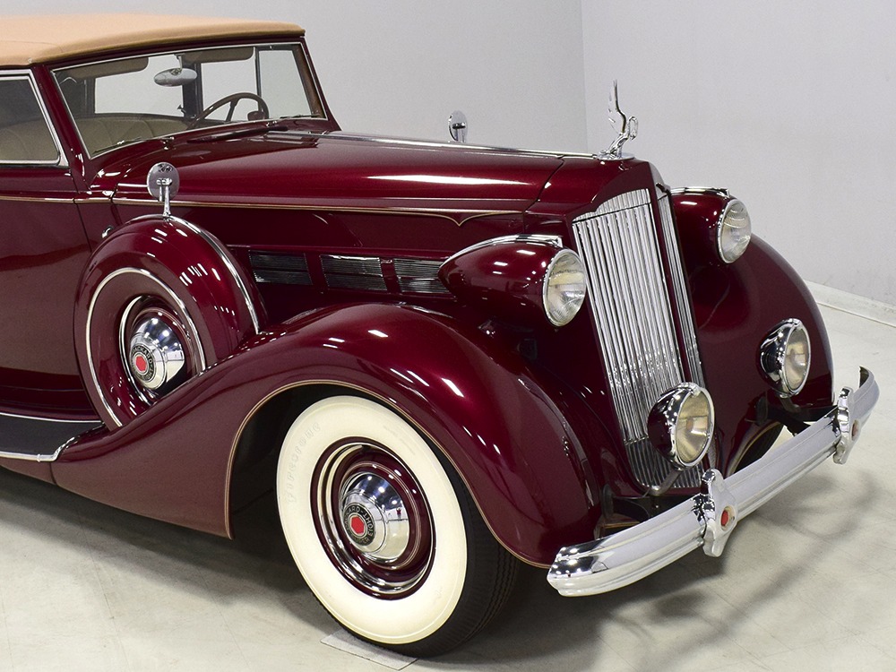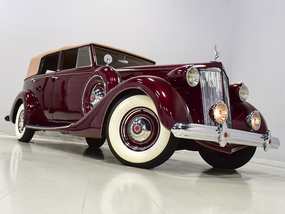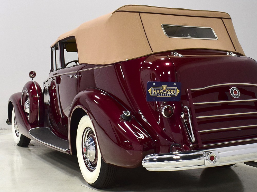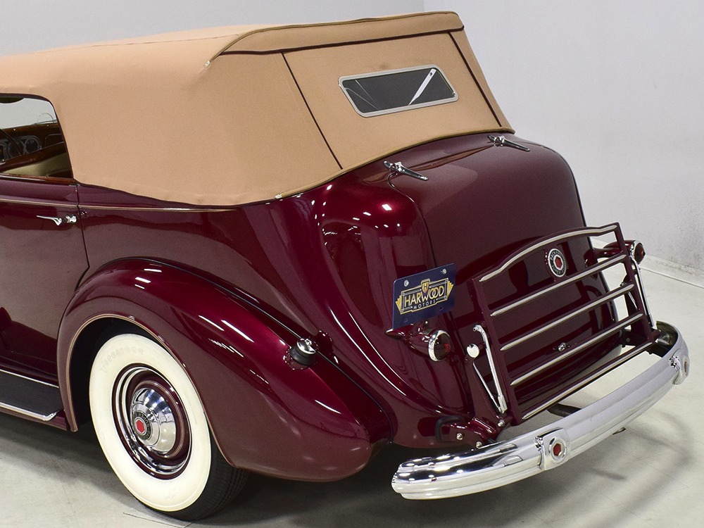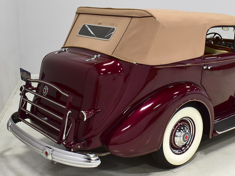 According to records compiled by the most recent owner, this beautiful 1937 Packard 1502 convertible sedan has a fascinating history behind it. Originally sold through the legendary Earle C. Anthony distributorship in Los Angeles (yes, the data plate is a reproduction, but this car also carries an original Earle C. Anthony maintenance tag on the firewall), it is rumored that this car has spent time in India and Italy before being repatriated in the early 2000s. In 2007 the car was stripped to bare metal with panel alignment by Clayton Restorations and fresh Pomeranian Red paint was applied by Cedar Hawks. A new leather interior and fresh top were installed by Duncan & Sons Upholstery with the top alone costing $5000. In 2019, the car was delivered to D&D Classic Auto in Dayton, Ohio and another $132,000 in restoration work was performed, including repainting and striping all six wheels, installing six new Firestone whitewall tires, correctly fitting the metal sidemount covers, and detailing the engine with correct Packard olive green paint. Additional work included refinishing much of the chrome, rebuilding the clock, rebuilding the carburetor, re-coring the radiator, repairing the thermostatic radiator shutters, re-casting the steering wheel, rebuilding the power brake booster, and much more. The goal was a roadworthy tour car that could show well in club events and in that regard, they succeeded. The car is just gorgeous in person!