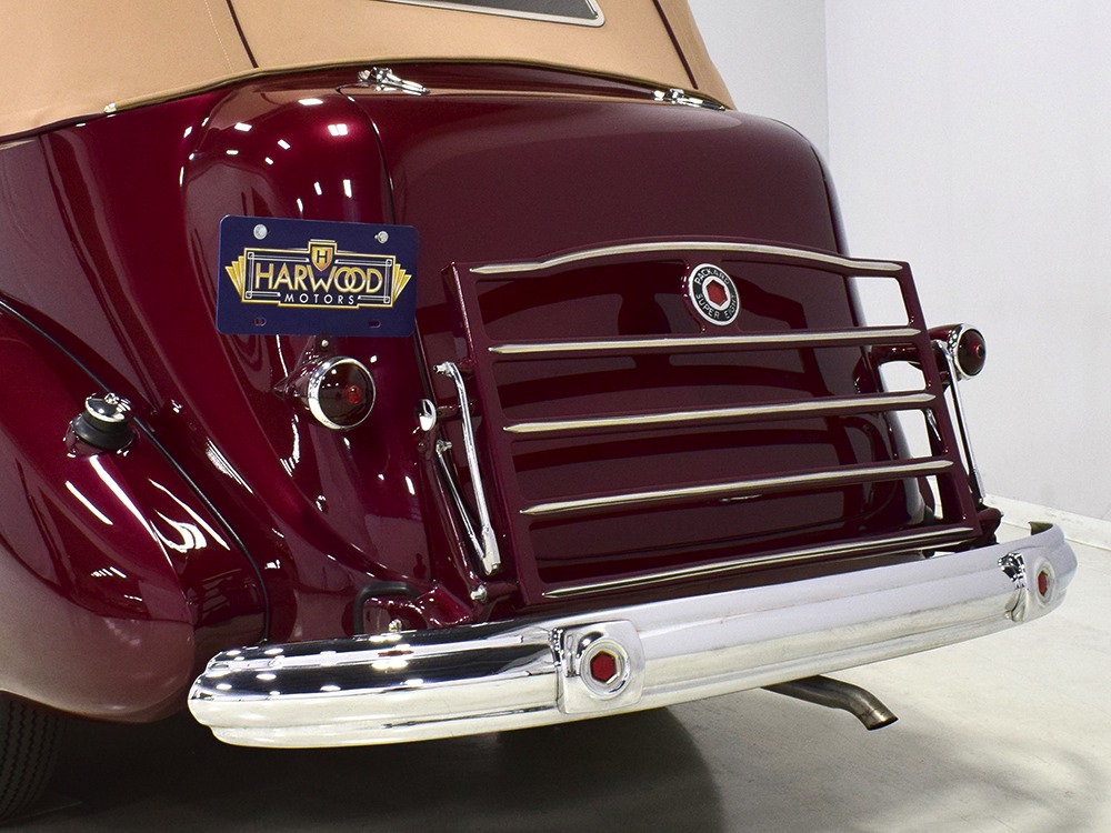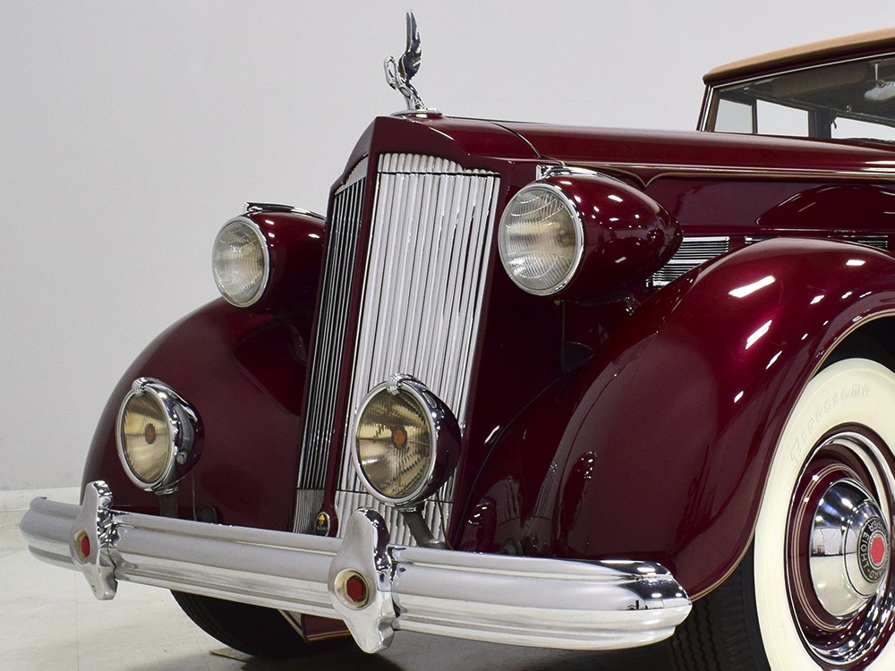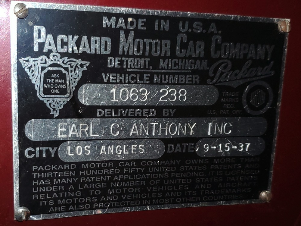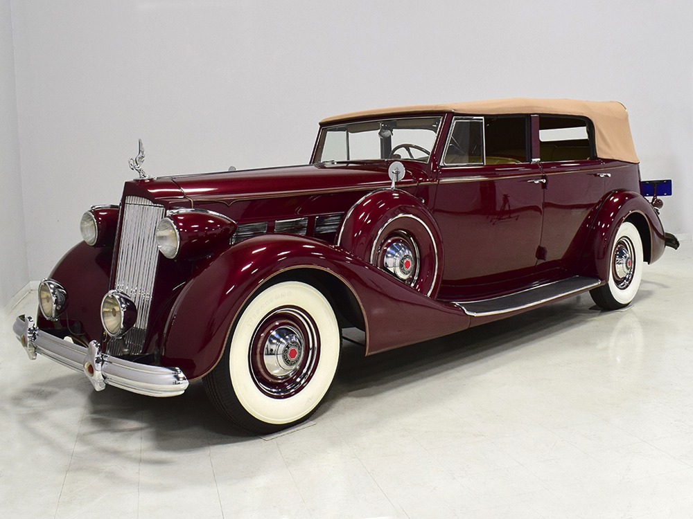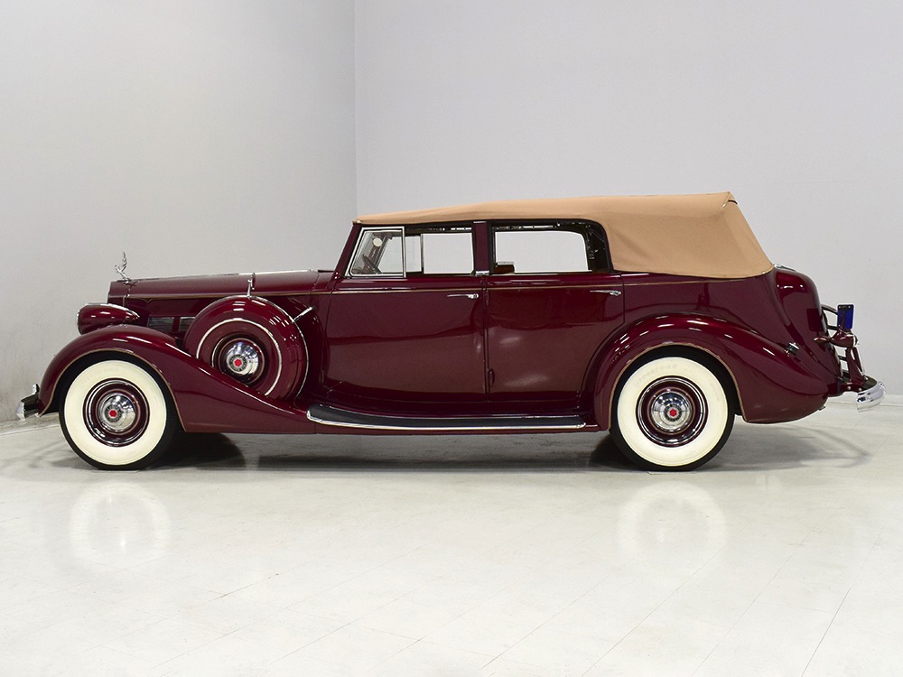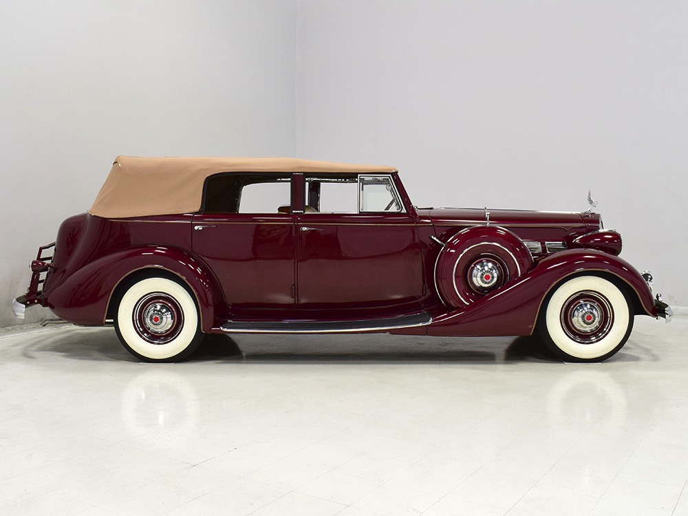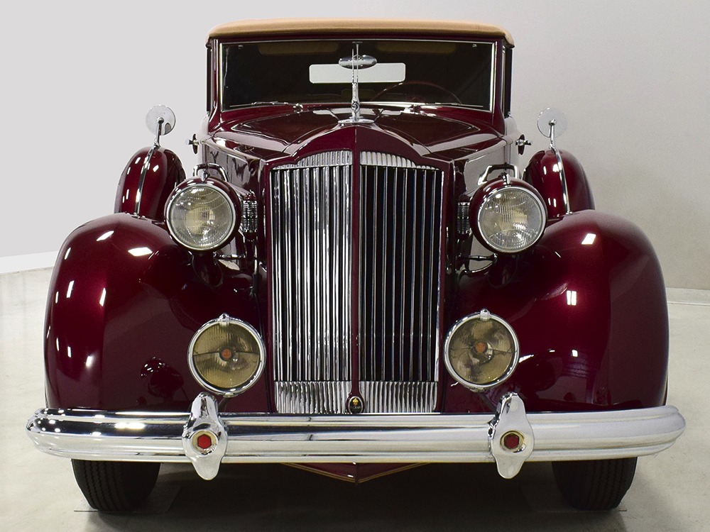 According to records compiled by the most recent owner, this beautiful 1937 Packard 1502 convertible sedan has a fascinating history behind it. Originally sold through the legendary Earle C. Anthony distributorship in Los Angeles (yes, the data plate is a reproduction, but this car also carries an original Earle C. Anthony maintenance tag on the firewall), it is rumored that this car has spent time in India and Italy before being repatriated in the early 2000s. In 2007 the car was stripped to bare metal with panel alignment by Clayton Restorations and fresh Pomeranian Red paint was applied by Cedar Hawks. A new leather interior and fresh top were installed by Duncan & Sons Upholstery with the top alone costing $5000. In 2019, the car was delivered to D&D Classic Auto in Dayton, Ohio and another $132,000 in restoration work was performed, including repainting and striping all six wheels, installing six new Firestone whitewall tires, correctly fitting the metal sidemount covers, and detailing the engine with correct Packard olive green paint. Additional work included refinishing much of the chrome, rebuilding the clock, rebuilding the carburetor, re-coring the radiator, repairing the thermostatic radiator shutters, re-casting the steering wheel, rebuilding the power brake booster, and much more. The goal was a roadworthy tour car that could show well in club events and in that regard, they succeeded. The car is just gorgeous in person!