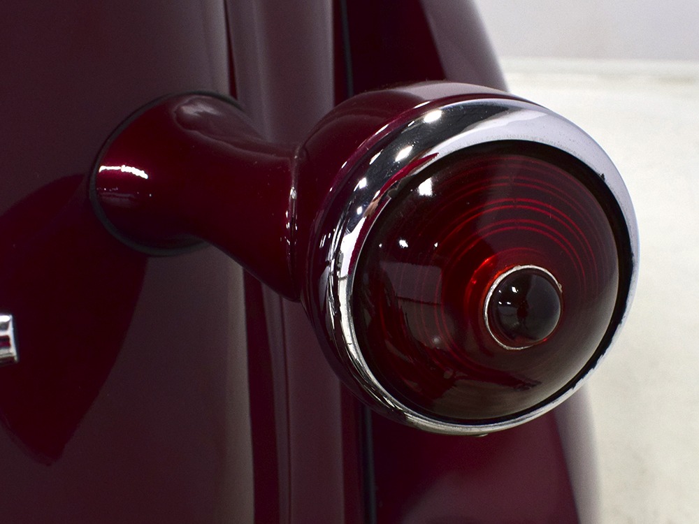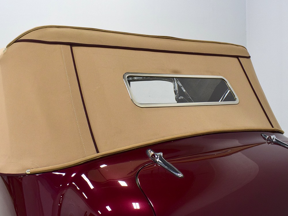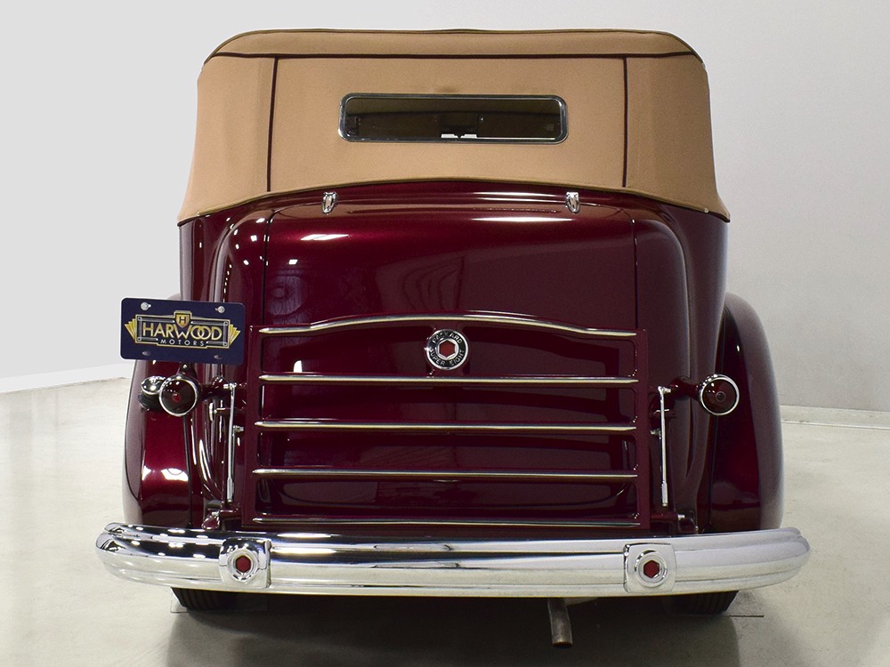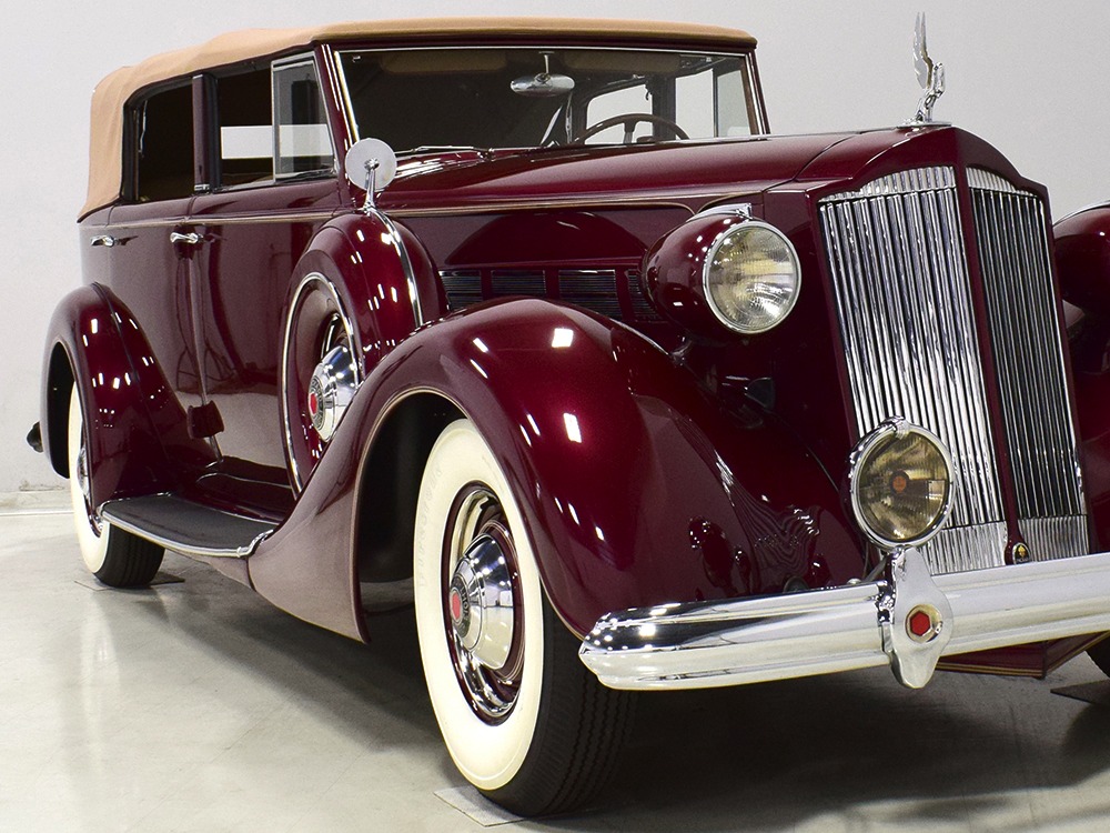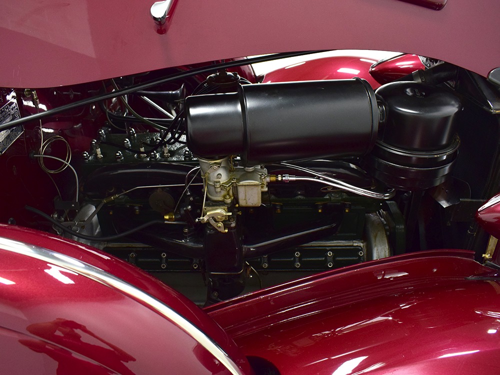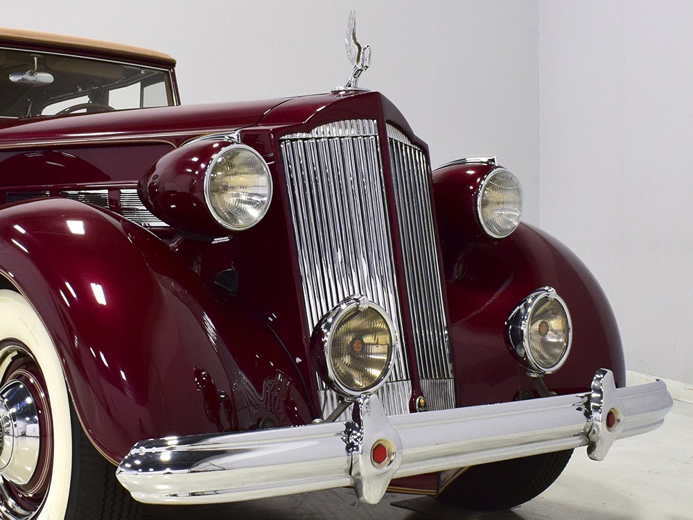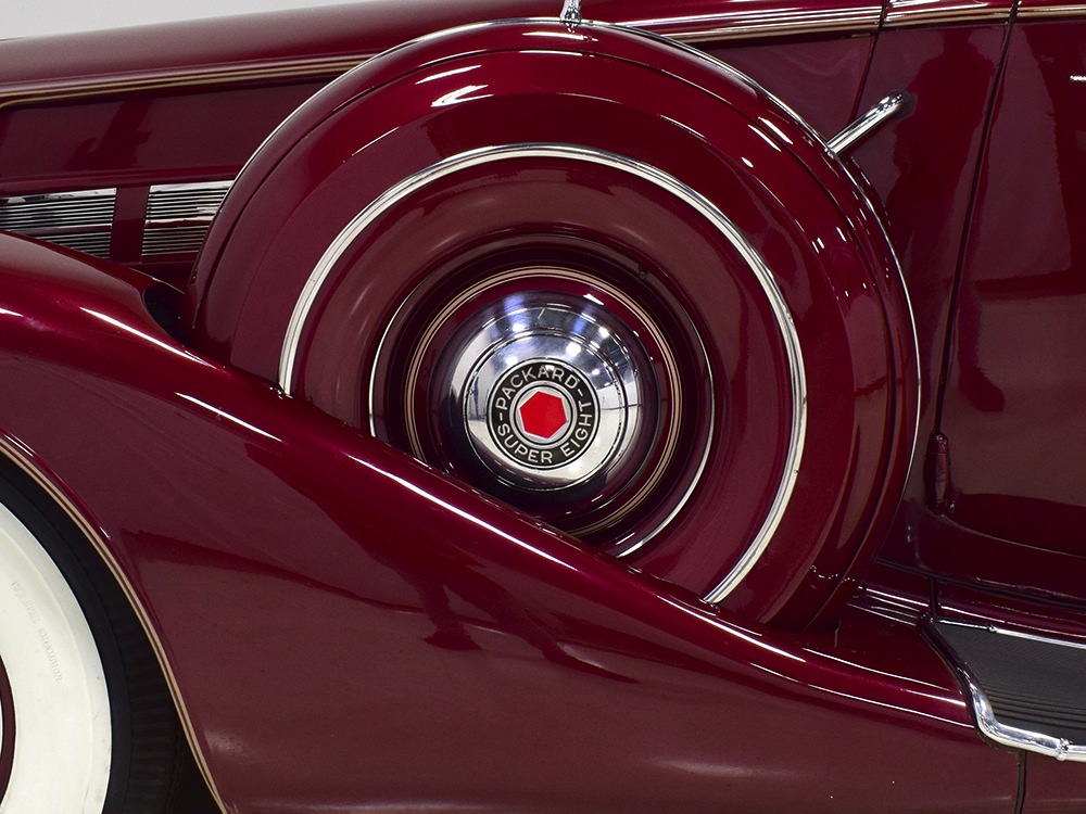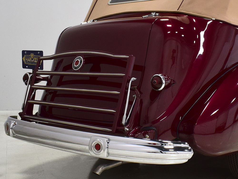 According to records compiled by the most recent owner, this beautiful 1937 Packard 1502 convertible sedan has a fascinating history behind it. Originally sold through the legendary Earle C. Anthony distributorship in Los Angeles (yes, the data plate is a reproduction, but this car also carries an original Earle C. Anthony maintenance tag on the firewall), it is rumored that this car has spent time in India and Italy before being repatriated in the early 2000s. In 2007 the car was stripped to bare metal with panel alignment by Clayton Restorations and fresh Pomeranian Red paint was applied by Cedar Hawks. A new leather interior and fresh top were installed by Duncan & Sons Upholstery with the top alone costing $5000. In 2019, the car was delivered to D&D Classic Auto in Dayton, Ohio and another $132,000 in restoration work was performed, including repainting and striping all six wheels, installing six new Firestone whitewall tires, correctly fitting the metal sidemount covers, and detailing the engine with correct Packard olive green paint. Additional work included refinishing much of the chrome, rebuilding the clock, rebuilding the carburetor, re-coring the radiator, repairing the thermostatic radiator shutters, re-casting the steering wheel, rebuilding the power brake booster, and much more. The goal was a roadworthy tour car that could show well in club events and in that regard, they succeeded. The car is just gorgeous in person!
