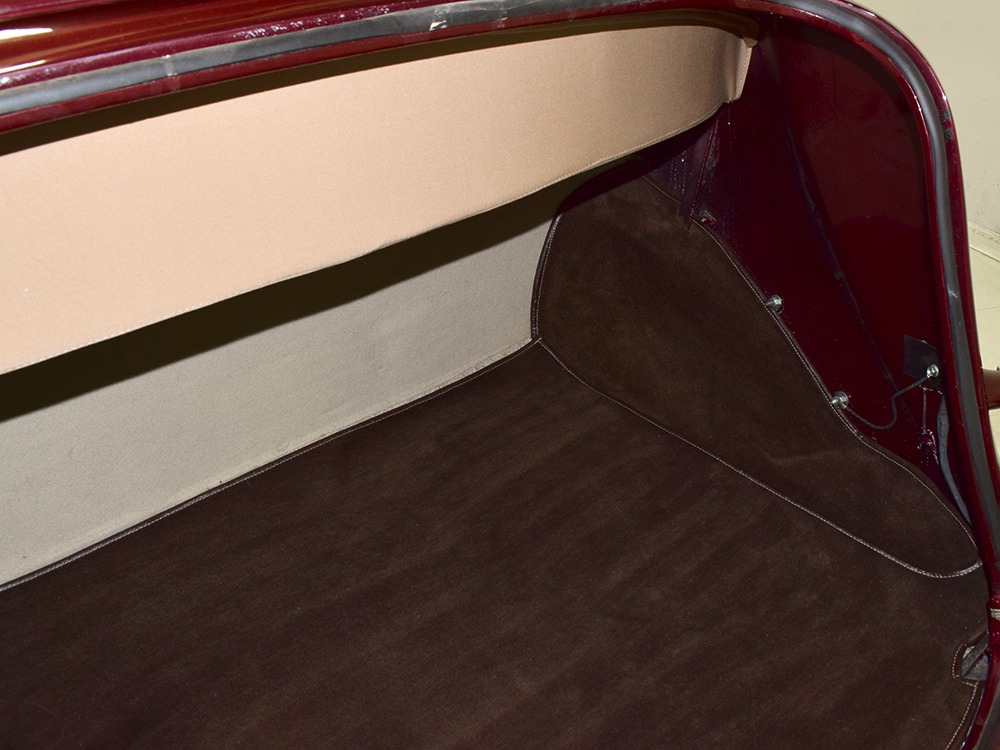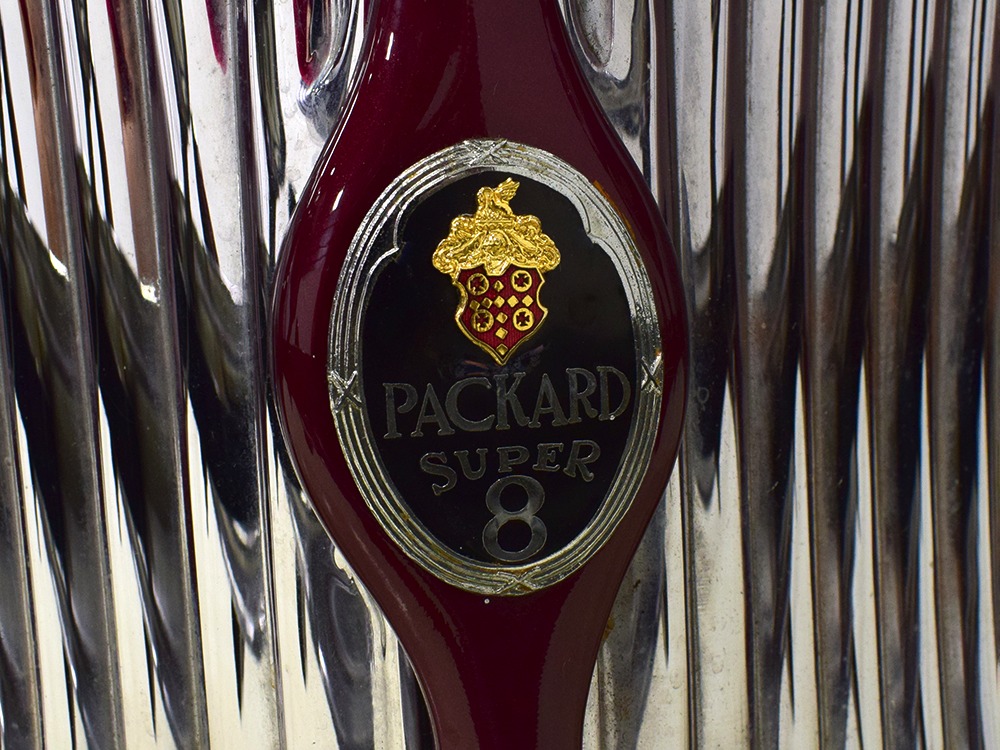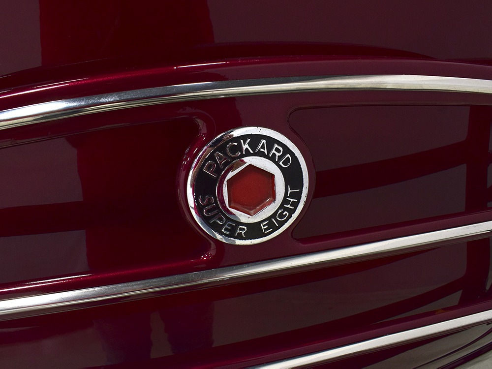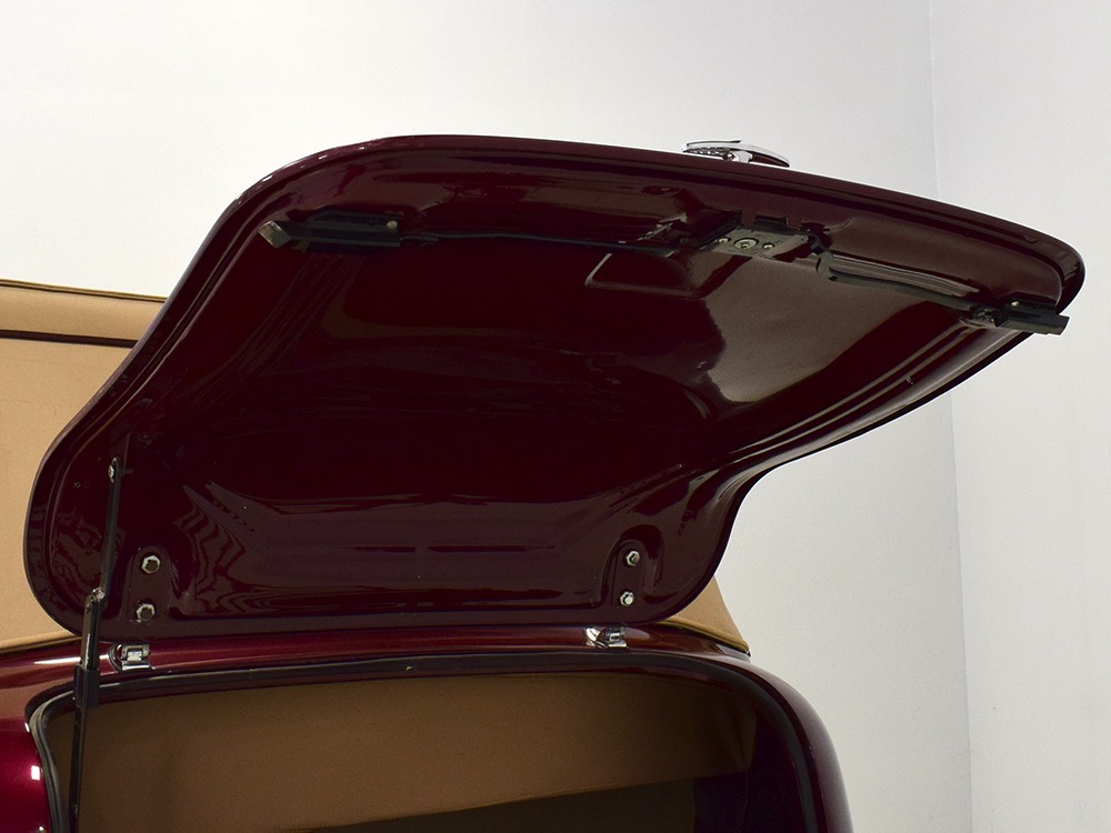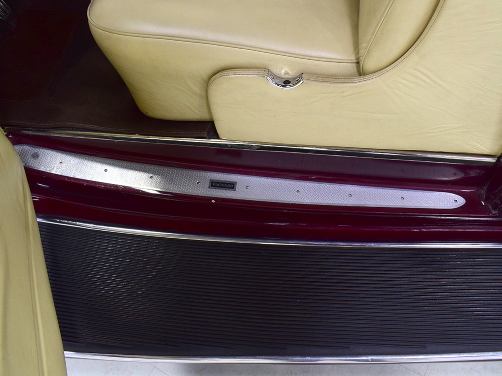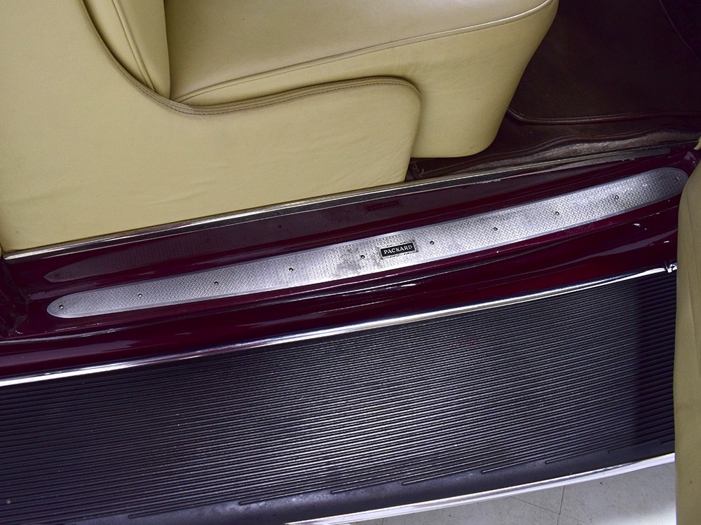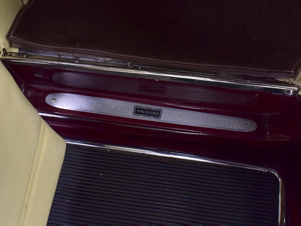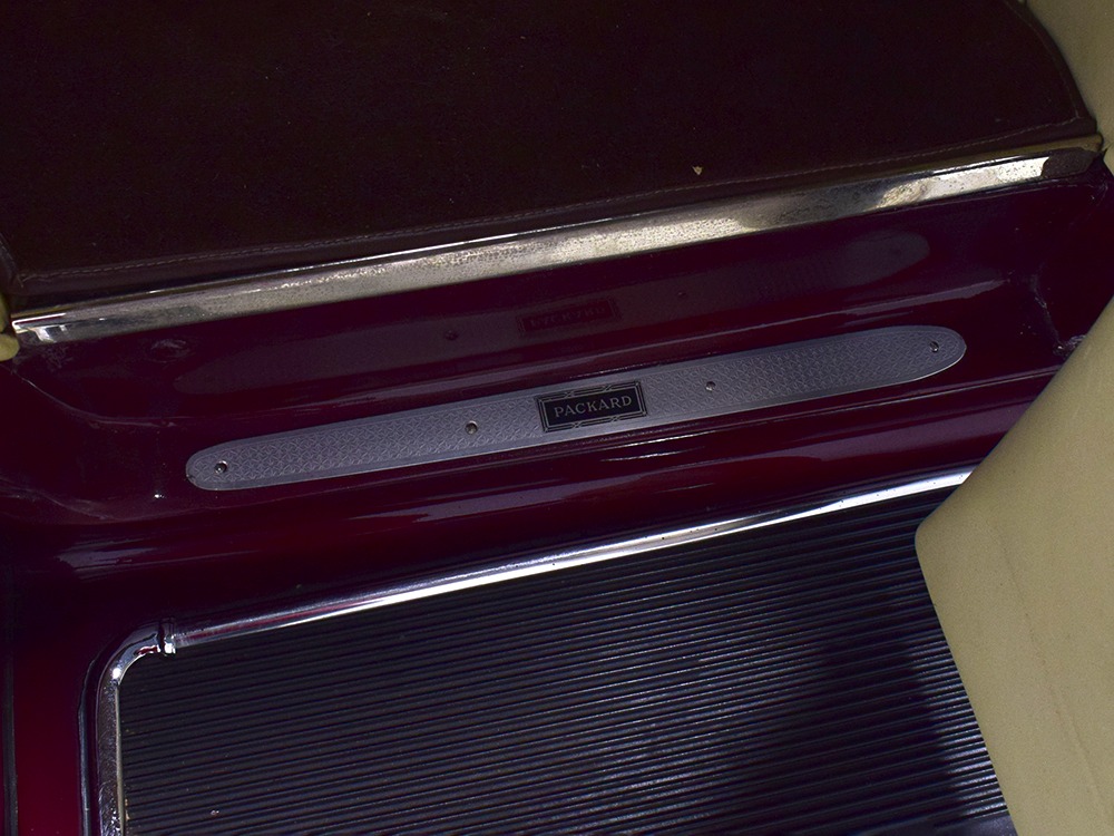 The interior wears eight hides of glove soft light tan leather that were supplied by a previous owner, with the bill for just the labor coming in at over $9000. The gauges were all rebuilt and are operational, as is the clock. Dark brown carpets provide some contrast and the burled woodgraining on the dash and garnish moldings is beautifully done. The newly cast steering wheel is correct with the only real demerit being some tarnishing on the chrome horn button (which has been clear-coated so it cannot be polished without first being stripped). Turn signals were added during the most recent service at D&D. The upholstery is virtually unmarked and has the kind of sumptuous luxury for which Packard was justifiably famous—this certainly feels like a very expensive, high-end car from behind the wheel. Thanks to the massive wheelbase, rear seat accommodations are spacious and it includes a storage compartment built into the back of the front seat back. The top fits beautifully and a new wooden top bow was fabricated by D&D to replace one that had been damaged in the past. The trunk is fully upholstered to match and there are no signs of corrosion issues underneath the carpet. This car obviously lived in a warm, dry climate most of its life.