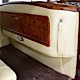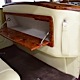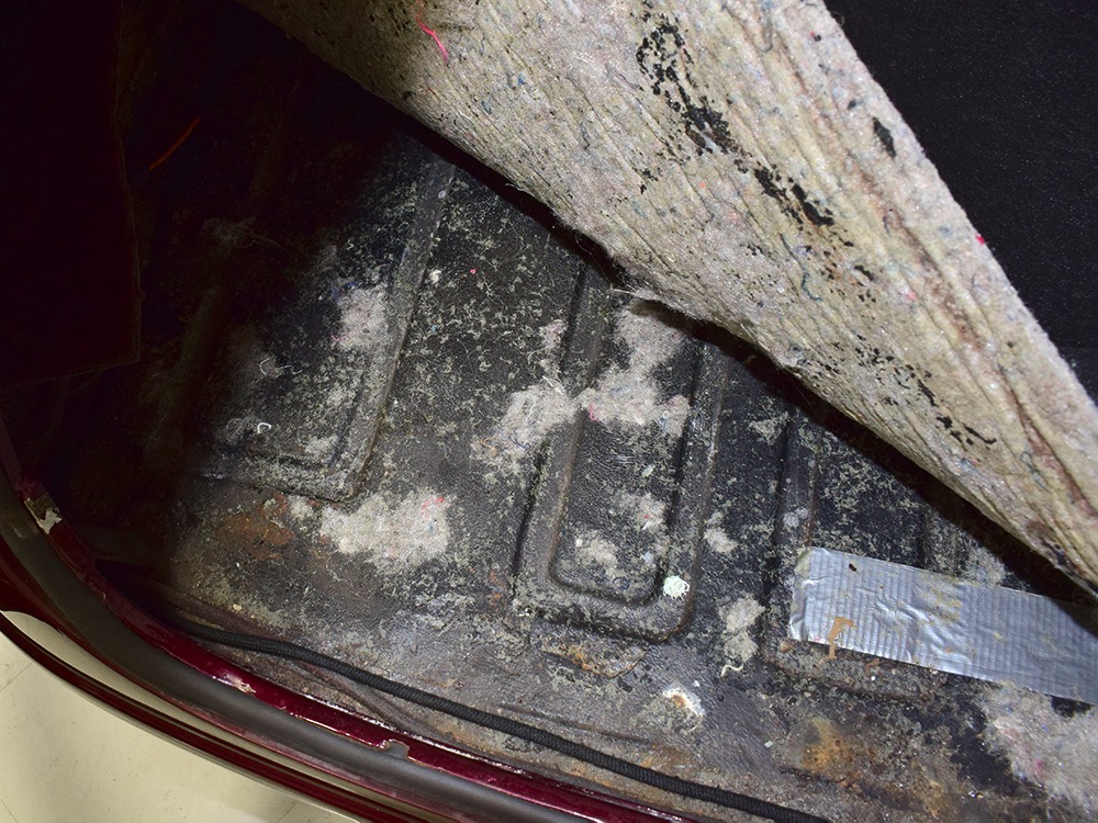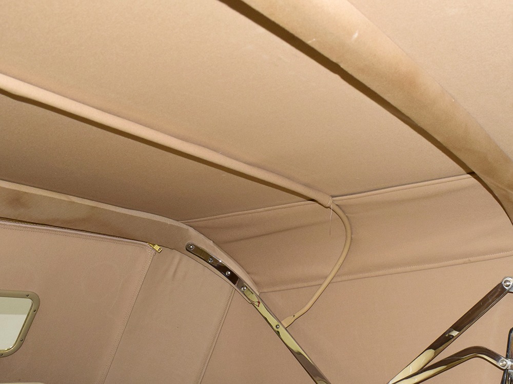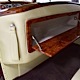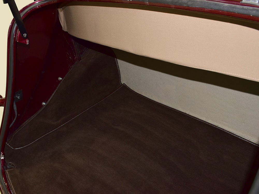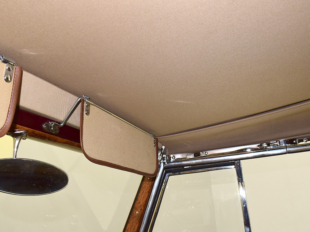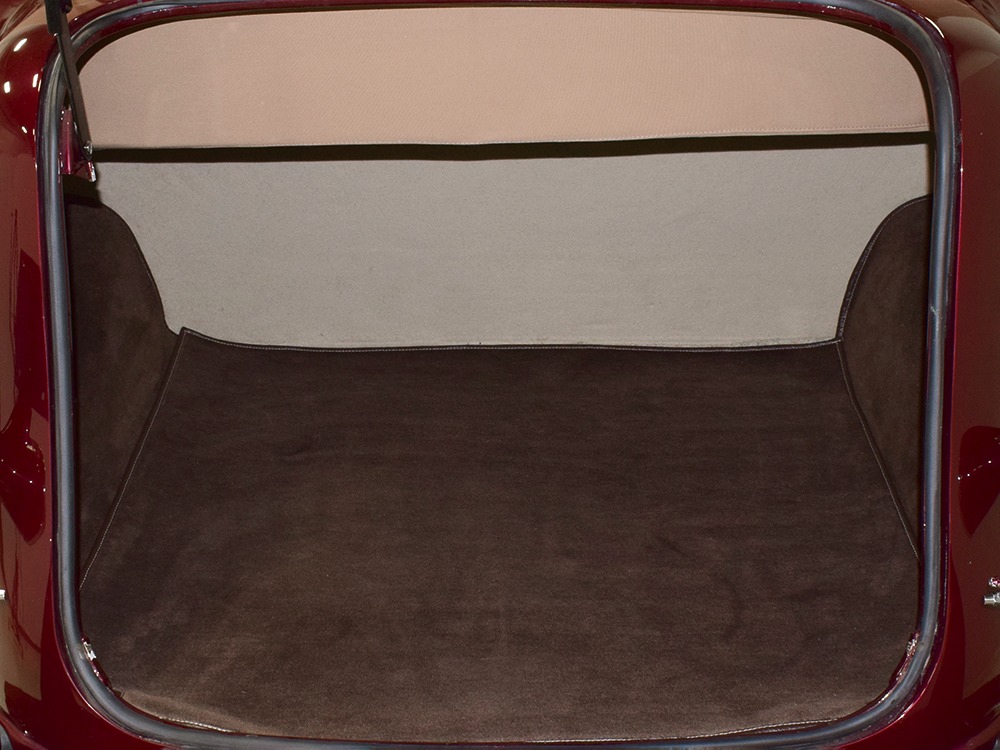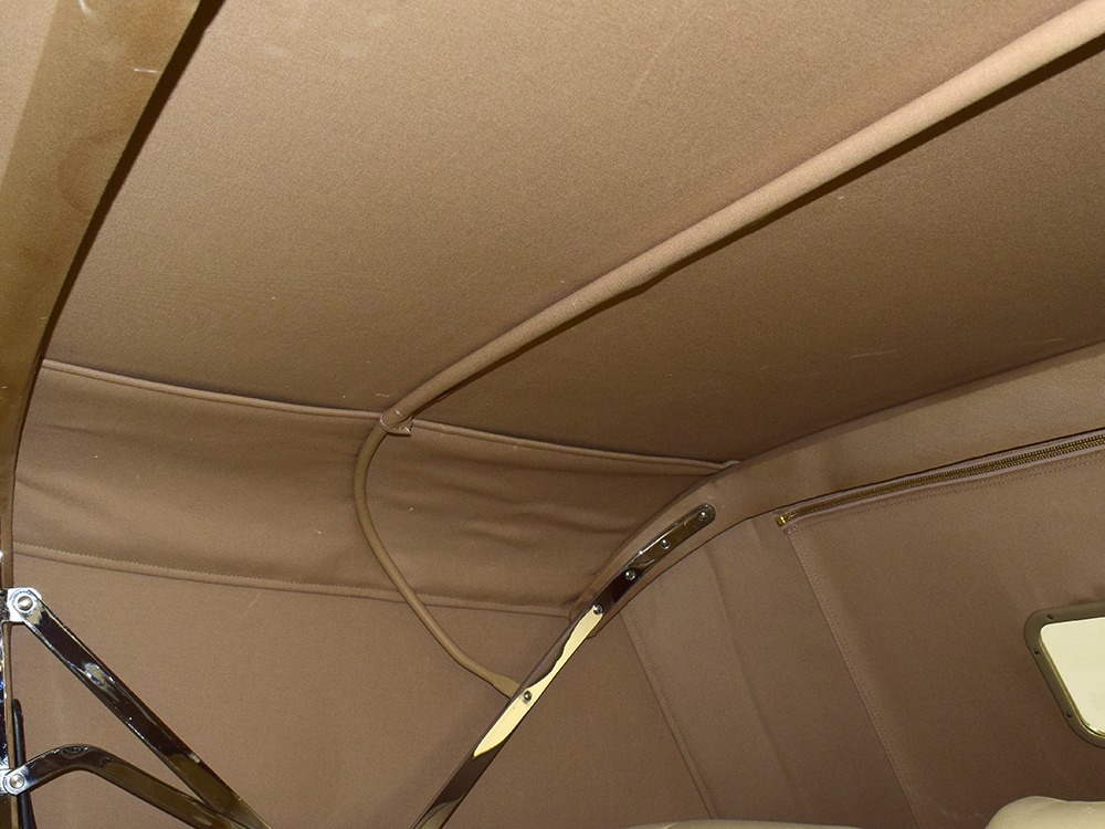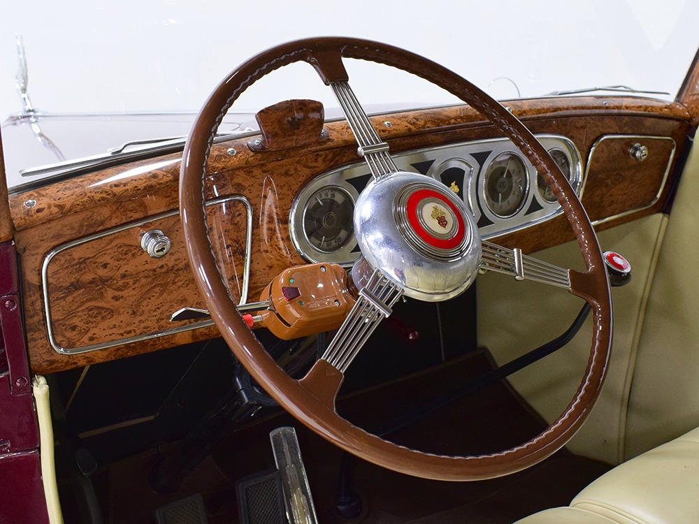 The interior wears eight hides of glove soft light tan leather that were supplied by a previous owner, with the bill for just the labor coming in at over $9000. The gauges were all rebuilt and are operational, as is the clock. Dark brown carpets provide some contrast and the burled woodgraining on the dash and garnish moldings is beautifully done. The newly cast steering wheel is correct with the only real demerit being some tarnishing on the chrome horn button (which has been clear-coated so it cannot be polished without first being stripped). Turn signals were added during the most recent service at D&D. The upholstery is virtually unmarked and has the kind of sumptuous luxury for which Packard was justifiably famous—this certainly feels like a very expensive, high-end car from behind the wheel. Thanks to the massive wheelbase, rear seat accommodations are spacious and it includes a storage compartment built into the back of the front seat back. The top fits beautifully and a new wooden top bow was fabricated by D&D to replace one that had been damaged in the past. The trunk is fully upholstered to match and there are no signs of corrosion issues underneath the carpet. This car obviously lived in a warm, dry climate most of its life.
