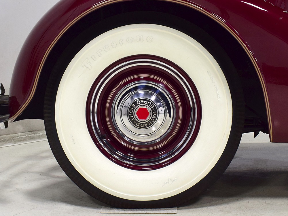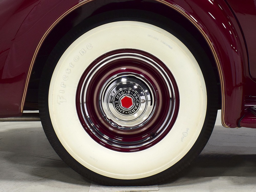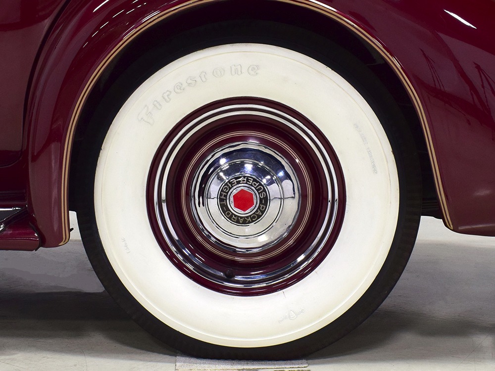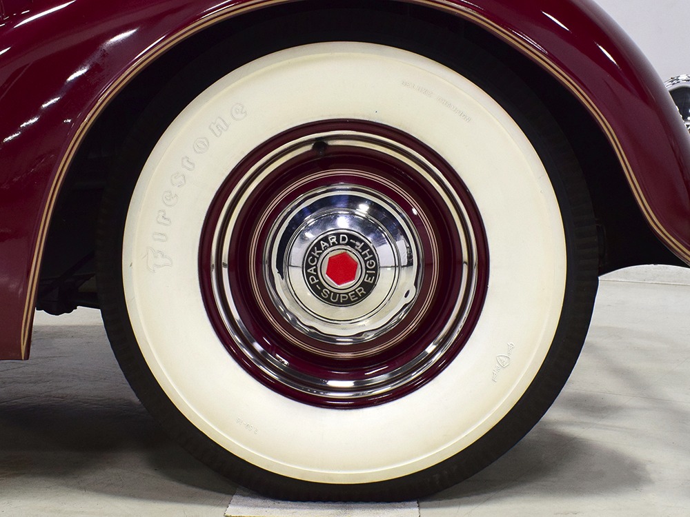 The 320 cubic inch Packard straight-8 really needs no introduction. Impeccably smooth and torquey, it moved some of the greatest sheetmetal of the 1930s. This engine was built sometime prior to the paint and upholstery work and was freshened by D&D with a head-off service and new, correct Packard Green engine enamel. New acorn nuts were installed on the head, the carburetor was rebuilt, the water pump, generator and starter were rebuilt and detailed, and there’s a new wiring harness from Potomac Packard. The car starts easily, idles smoothly, and pulls itself down the road with the kind of effortless ease you’d expect, although it remains a very large automobile. It is content to cruise at 55 MPH, making it an excellent tour vehicle, and a new exhaust system gives it just the right hushed burble at idle. The 3-speed manual transmission offers smooth shifts and easy clutch action with no chatter and the rebuilt brakes are powerful. Steering is light, although the bias-ply tires make it wander just a bit on rutted surfaces, which is typical. There’s also an NOS gas tank in back and six new 7.50-16 Firestone wide whitewall tires, as original.