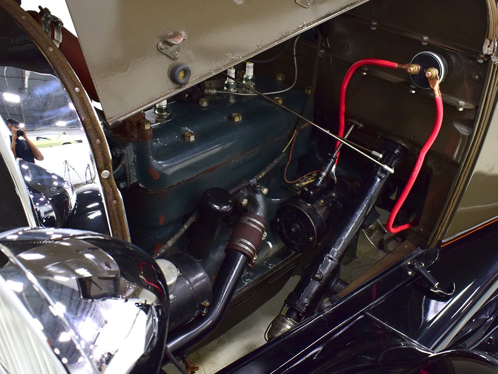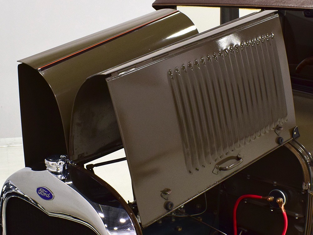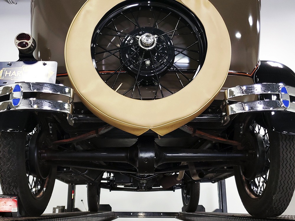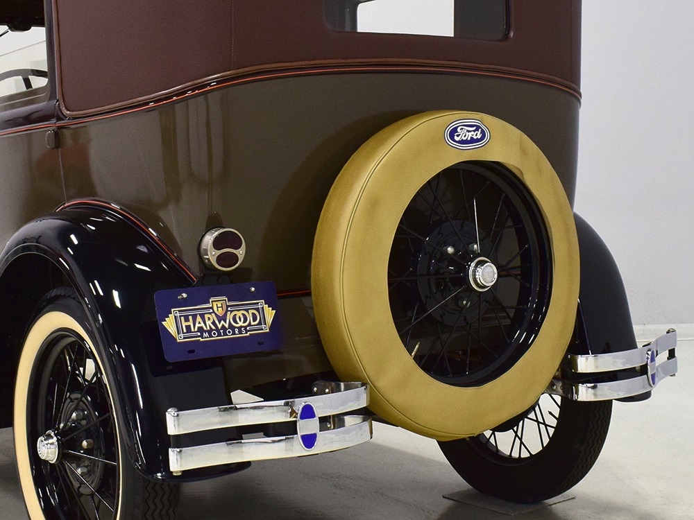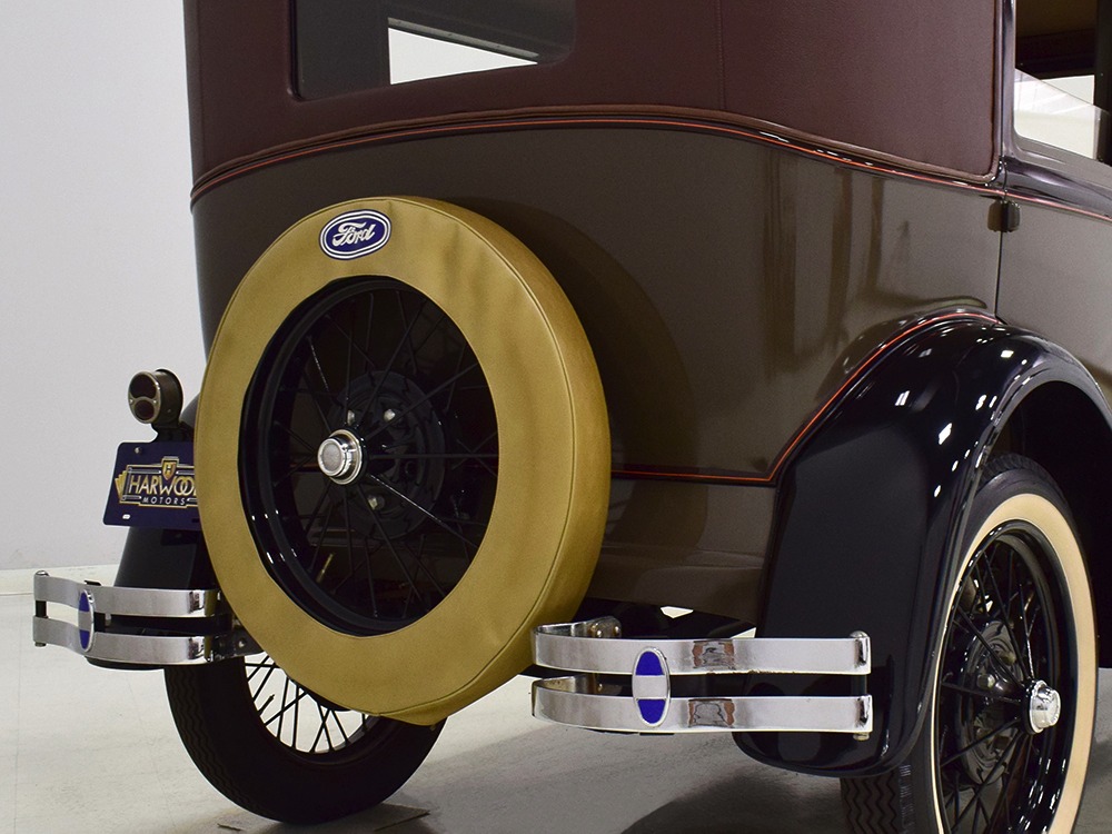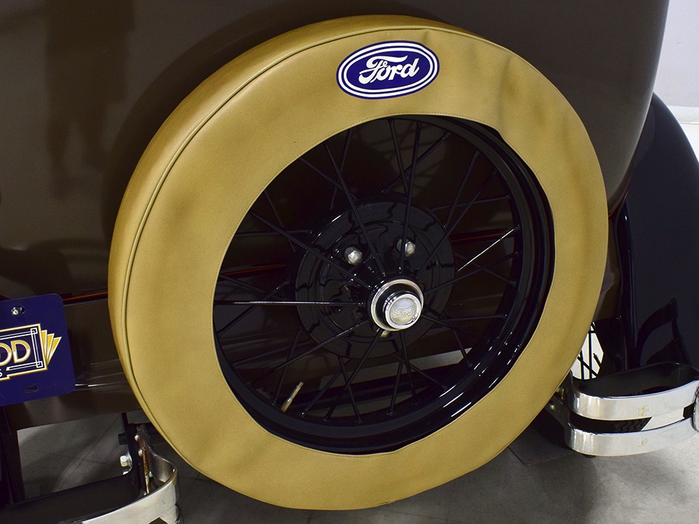 The “leatherback” sedan was the first 4-door built by Ford when the Model A was introduced. It gets its nickname from the padded roof and blind quarters, giving it a very distinctive look. It was intended to be luxurious and comfortable, an upscale model to help grow Ford’s market share. This particular 1928 Model A is finished in a beautiful color combination of Rose Beige and Seal Brown, which were the catalog colors. The restoration was extremely well done, finished sometime around 2005, with great attention to detail that makes it show beautifully. The doors fit correctly and snap shut with ease, the hood latches down so that the belt moldings are correctly aligned, and the orange pinstripe adds an upscale look. Black fenders were standard equipment, of course, and the pebble-grain artificial leather covering on the top is correct. All the brightwork was refinished in chrome instead of nickel for ease of maintenance, and you can’t argue with the result because it still looks great 15 years later. A single drum taillight is another indicator of an early 1928 production date and the rear-mounted spare wears a Ford script cover. This is a very pretty Model A.