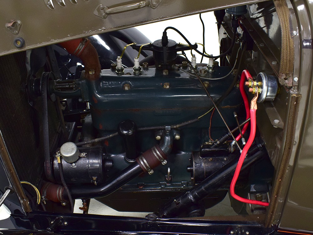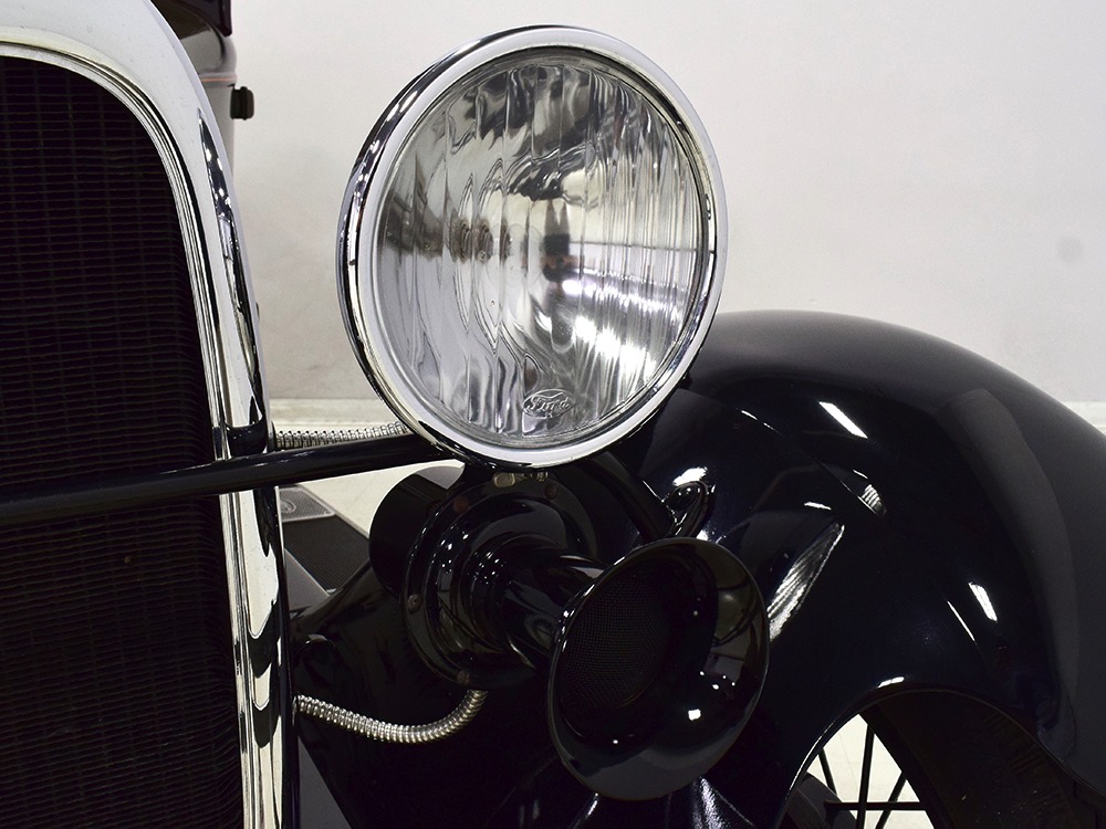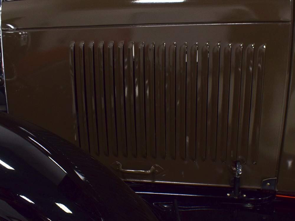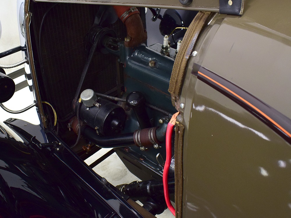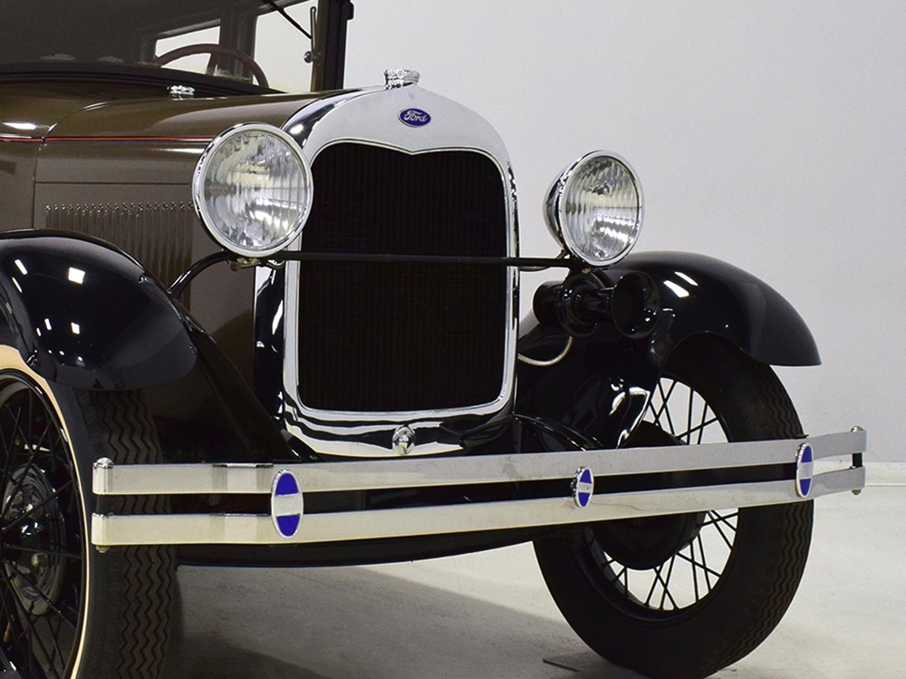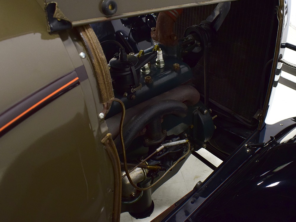 The “leatherback” sedan was the first 4-door built by Ford when the Model A was introduced. It gets its nickname from the padded roof and blind quarters, giving it a very distinctive look. It was intended to be luxurious and comfortable, an upscale model to help grow Ford’s market share. This particular 1928 Model A is finished in a beautiful color combination of Rose Beige and Seal Brown, which were the catalog colors. The restoration was extremely well done, finished sometime around 2005, with great attention to detail that makes it show beautifully. The doors fit correctly and snap shut with ease, the hood latches down so that the belt moldings are correctly aligned, and the orange pinstripe adds an upscale look. Black fenders were standard equipment, of course, and the pebble-grain artificial leather covering on the top is correct. All the brightwork was refinished in chrome instead of nickel for ease of maintenance, and you can’t argue with the result because it still looks great 15 years later. A single drum taillight is another indicator of an early 1928 production date and the rear-mounted spare wears a Ford script cover. This is a very pretty Model A.