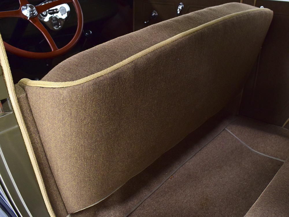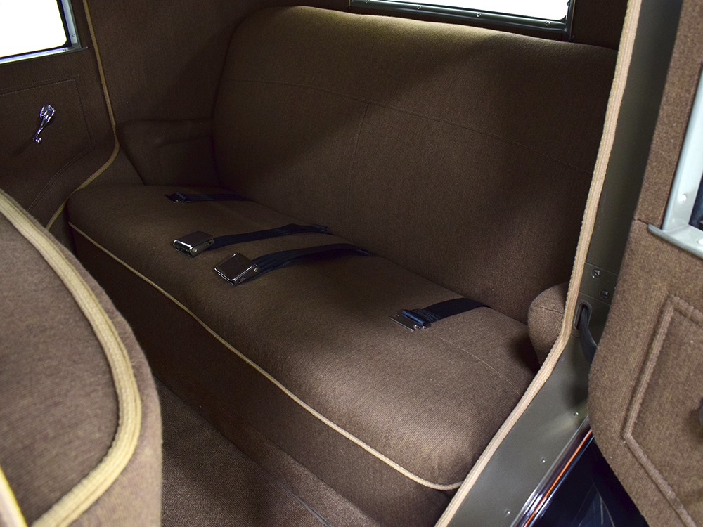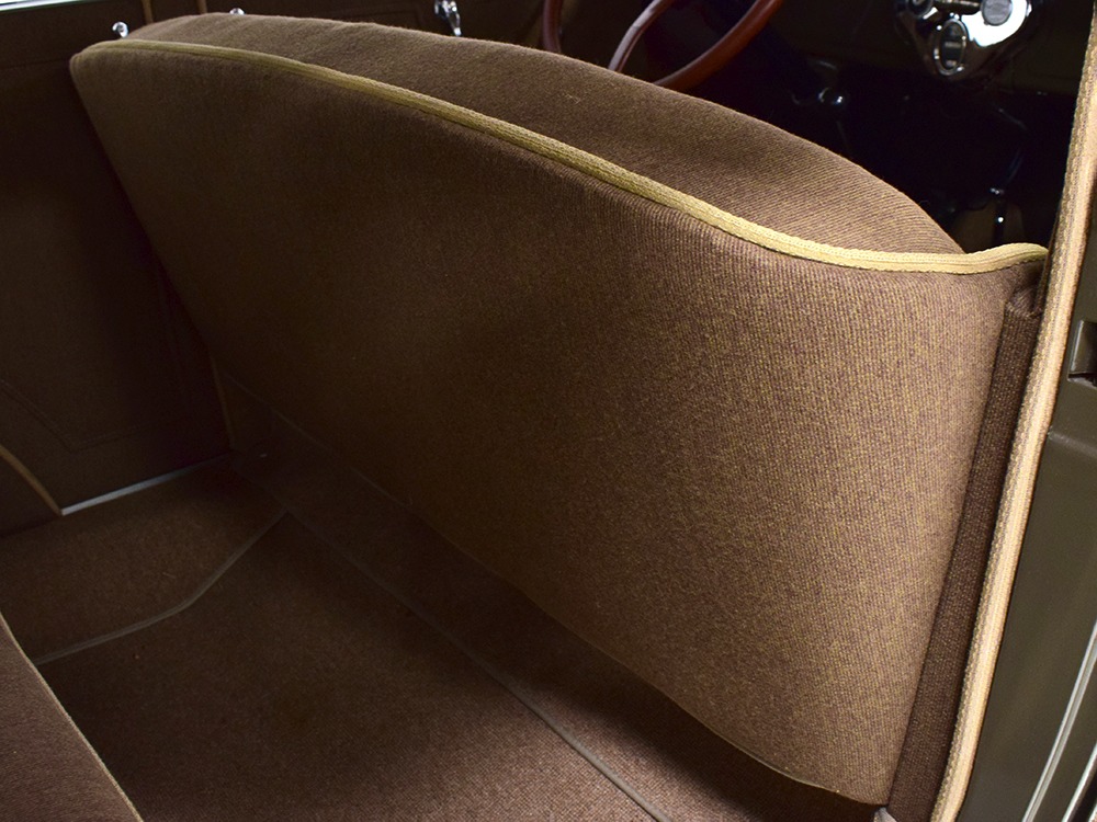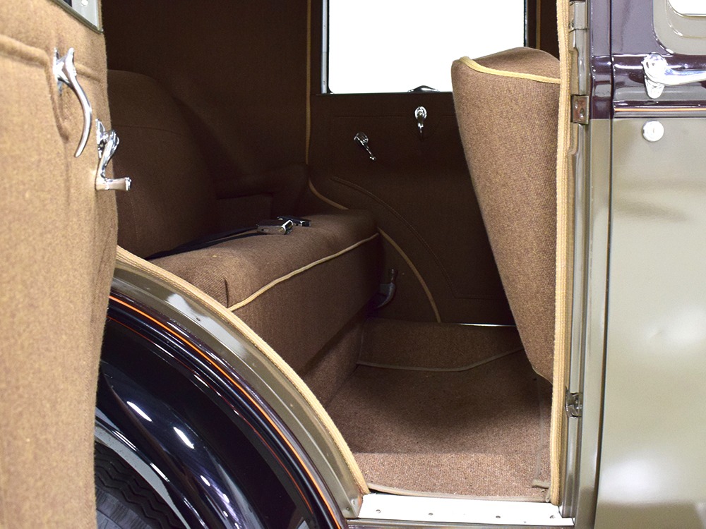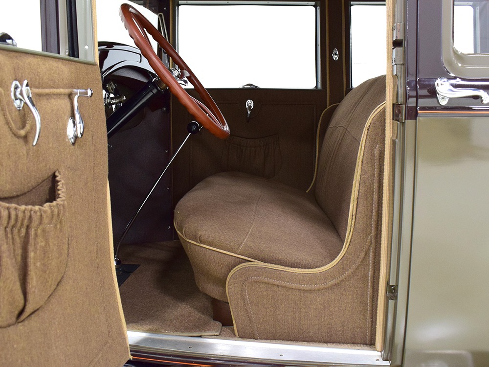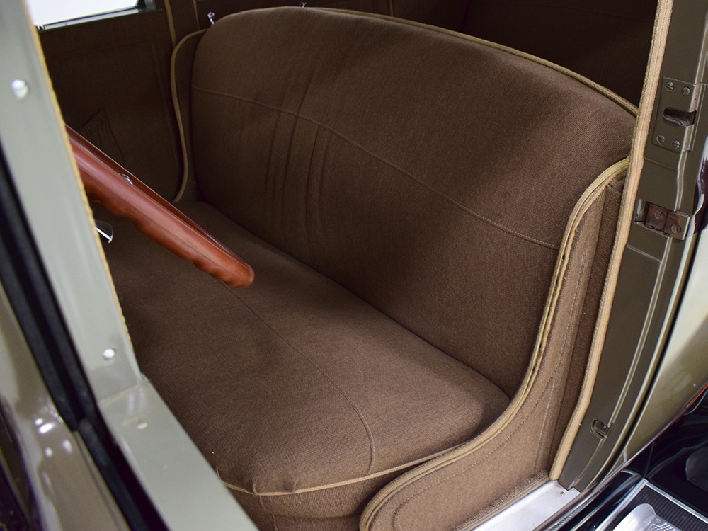 Expensive-looking materials and expert tailoring make the interior feel luxurious all out of proportion to the Model A’s reasonable price. Correct Bedford cord upholstery is trimmed in tan whipcord with map pockets and right hardware on each of the doors. The controls are standard Model A and easy to master, and as a closed car, this sedan offers full carpets fore and aft that help control noise and heat. The red rubber steering wheel is another early production feature, along with the trigger-style handbrake lever, while the windshield tilts open for added ventilation. In back, seating is comfortable with seat belts added for safety, and there’s a silk shade on the rear window just like on the more expensive cars. The wool headliner is as beautifully trimmed as the rest of the interior, giving it a very upscale feel from inside.