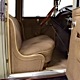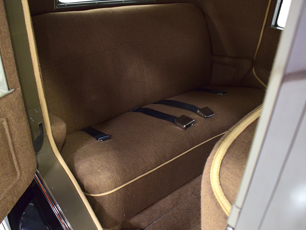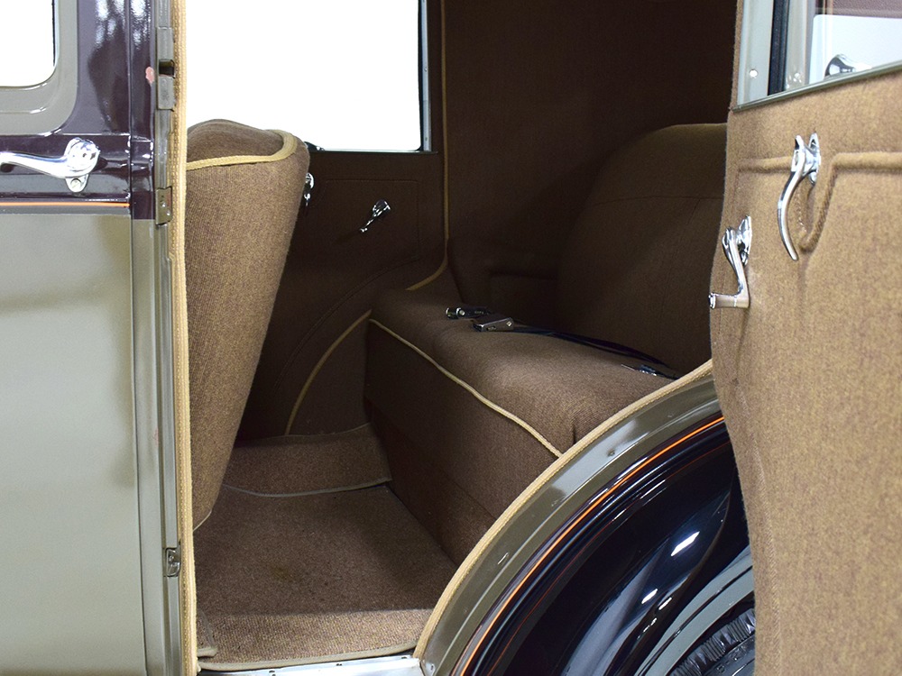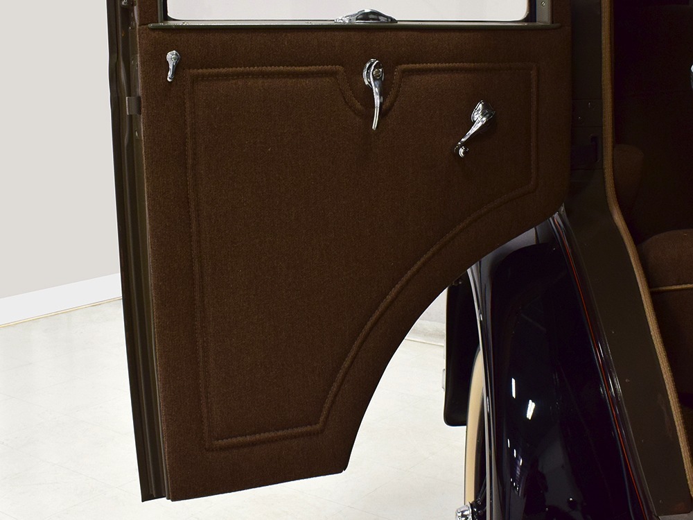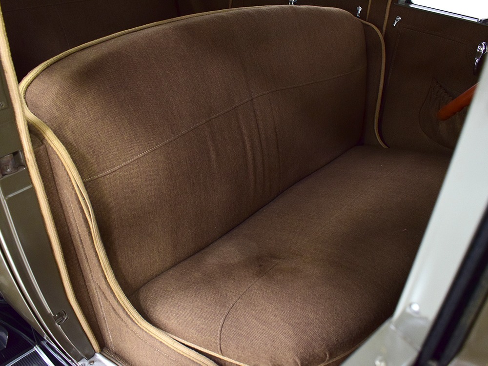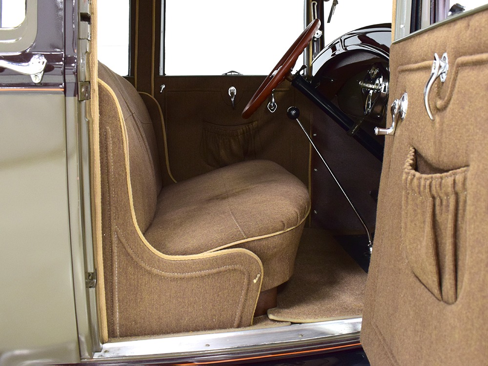 Expensive-looking materials and expert tailoring make the interior feel luxurious all out of proportion to the Model A’s reasonable price. Correct Bedford cord upholstery is trimmed in tan whipcord with map pockets and right hardware on each of the doors. The controls are standard Model A and easy to master, and as a closed car, this sedan offers full carpets fore and aft that help control noise and heat. The red rubber steering wheel is another early production feature, along with the trigger-style handbrake lever, while the windshield tilts open for added ventilation. In back, seating is comfortable with seat belts added for safety, and there’s a silk shade on the rear window just like on the more expensive cars. The wool headliner is as beautifully trimmed as the rest of the interior, giving it a very upscale feel from inside.