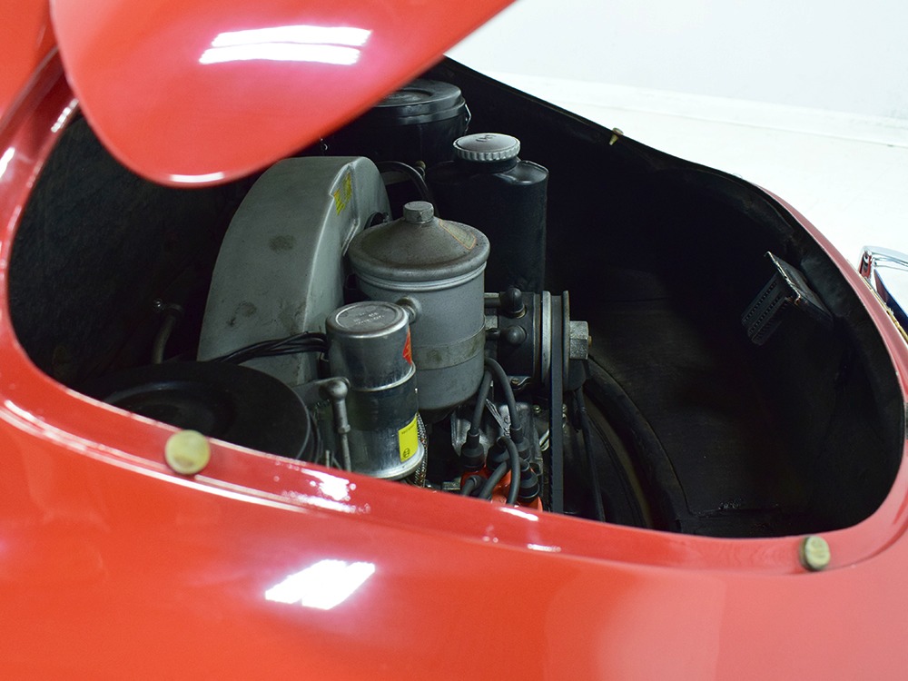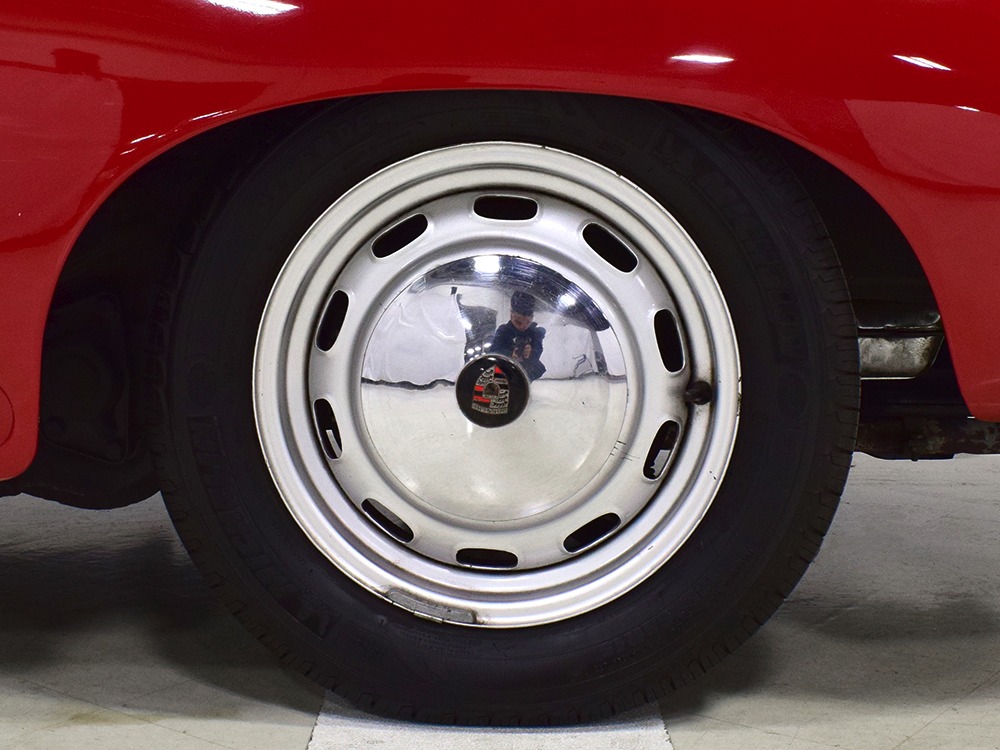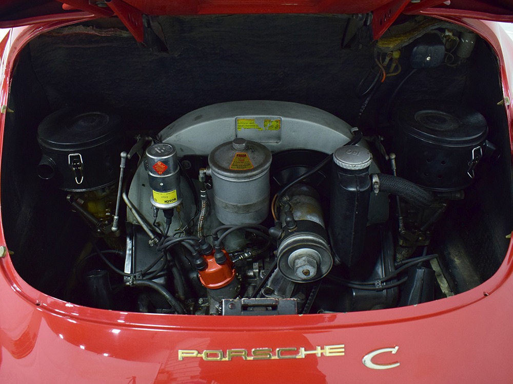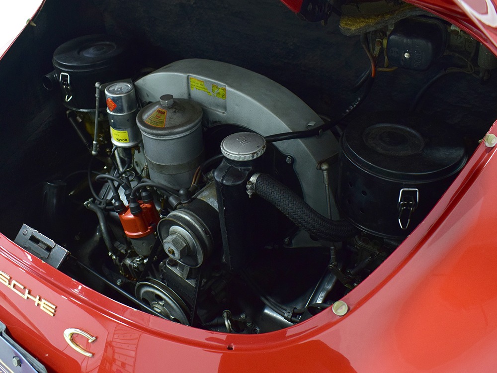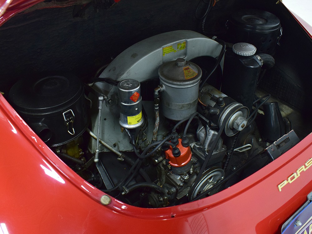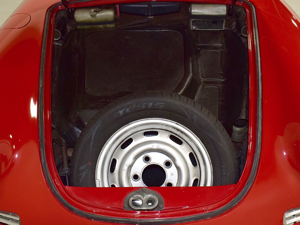 The interior was replaced during that same refurbishment and it remains an easy place to spend some time. The seat covers, carpets, and door panels were all replaced with correct reproduction pieces and it even has a set of sisal floor mats, a popular accessory. The steering wheel is original and protected with a leather wrap, while the dash is full of handsome and simple VDO gauges that are all operational. Only the clock is offline. We believe the headliner is original and that should suggest just how nice this car was before the restoration started. Lap belts were added in the name of safety and the 356 is a remarkably practical small car thanks to the fold-down rear seats that’ll handle children in a pinch or a good deal of luggage for a road trip. There’s also the forward trunk, which features a full-sized spare and jack assembly.