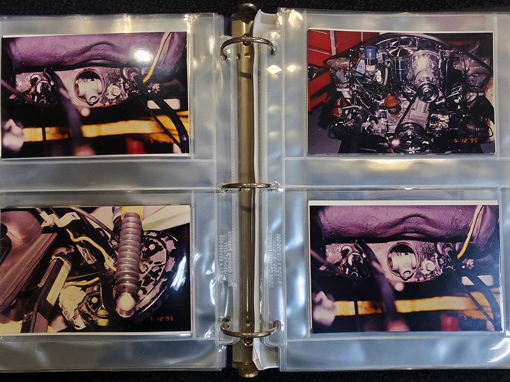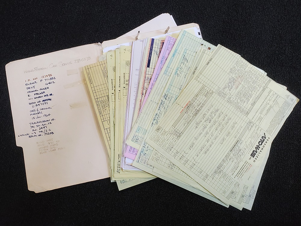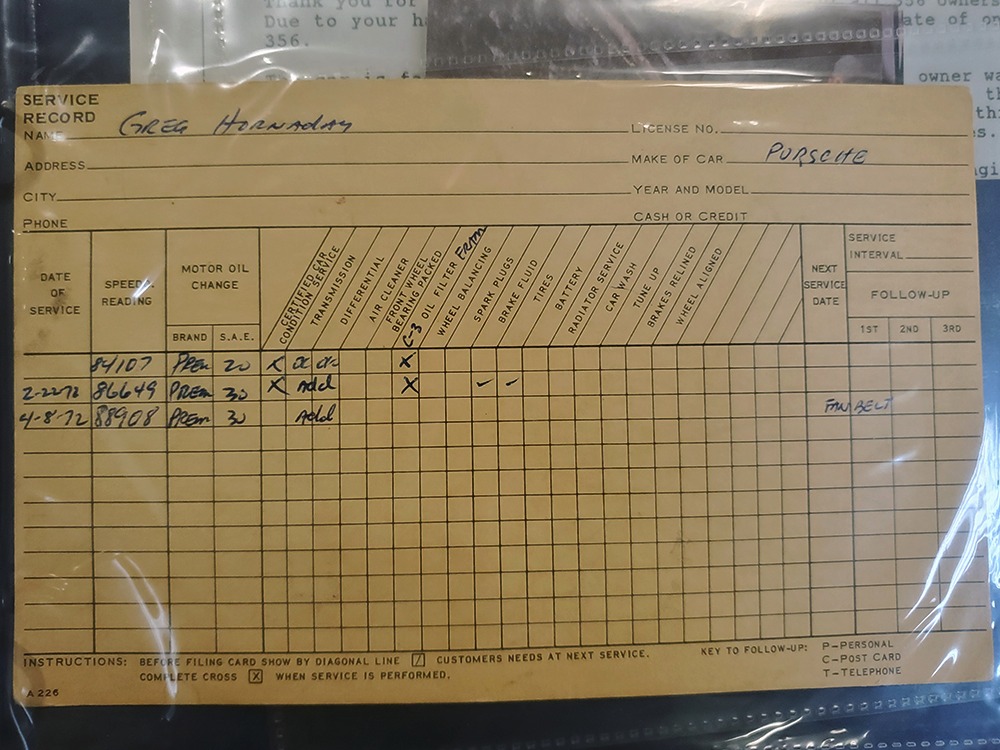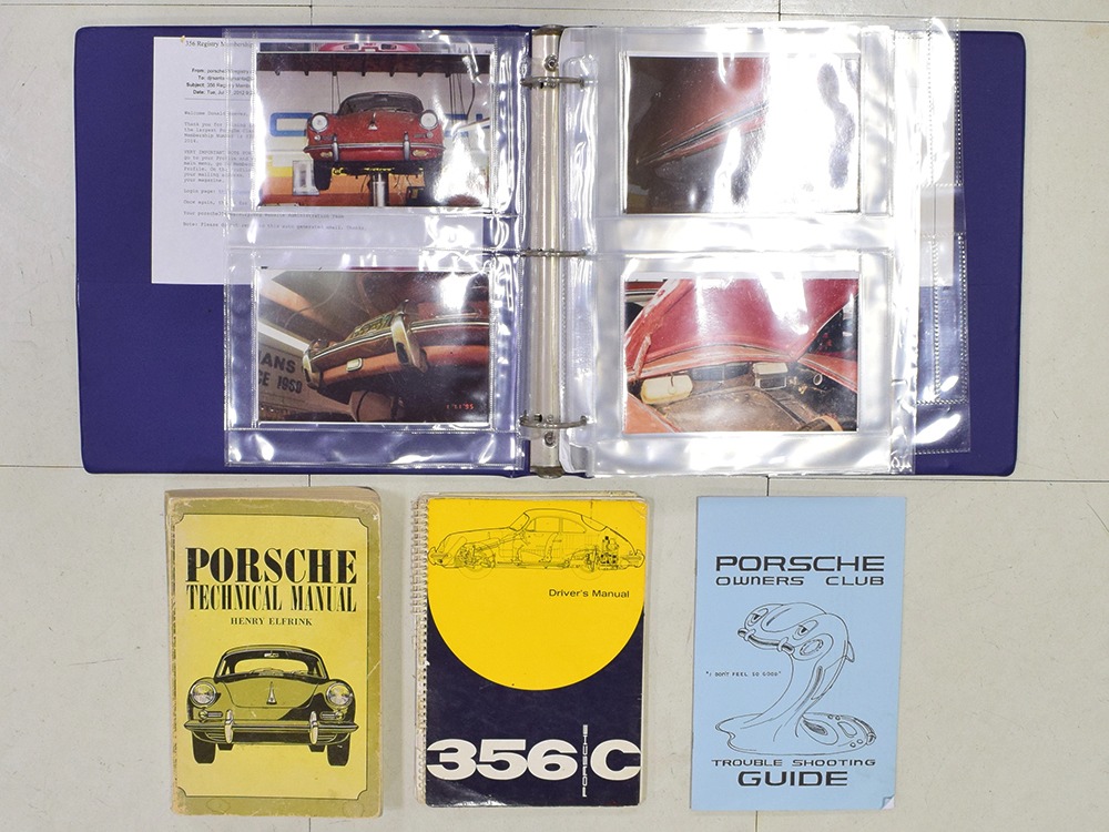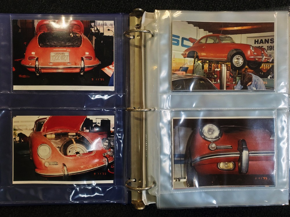 Extras include the original owner’s manual, Porsche Certificate of Authenticity, restoration receipts, photos, decades of maintenance records, service notebooks, and a chrome luggage rack.
