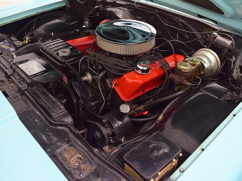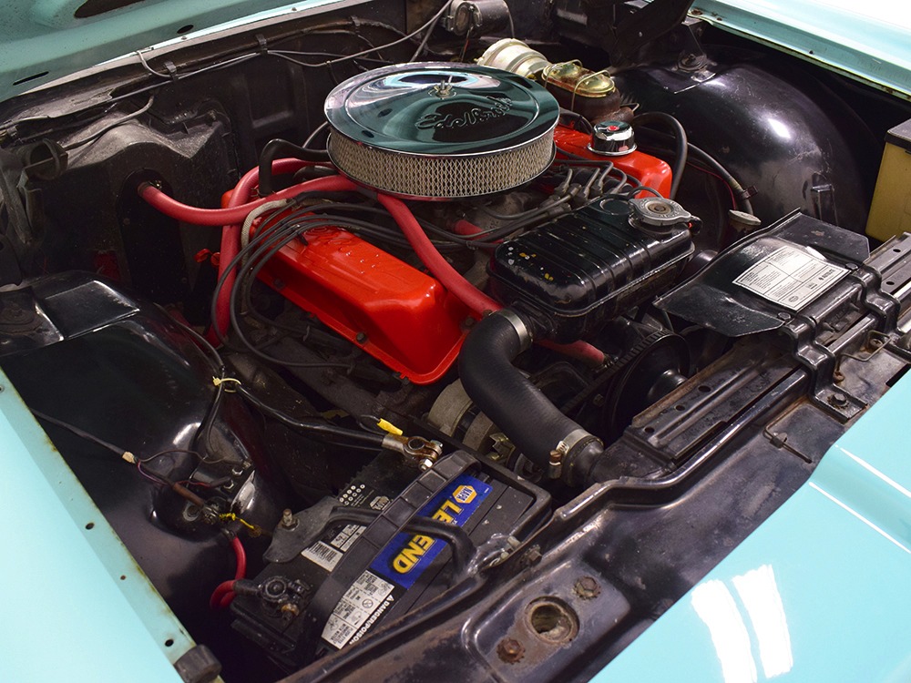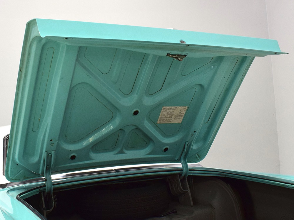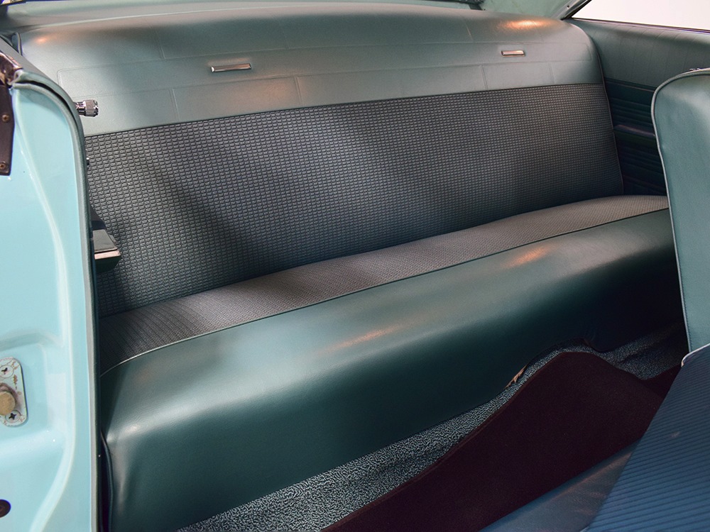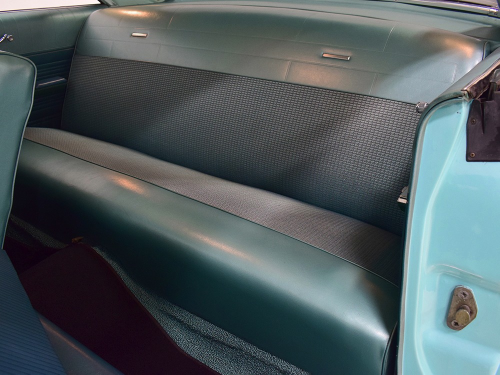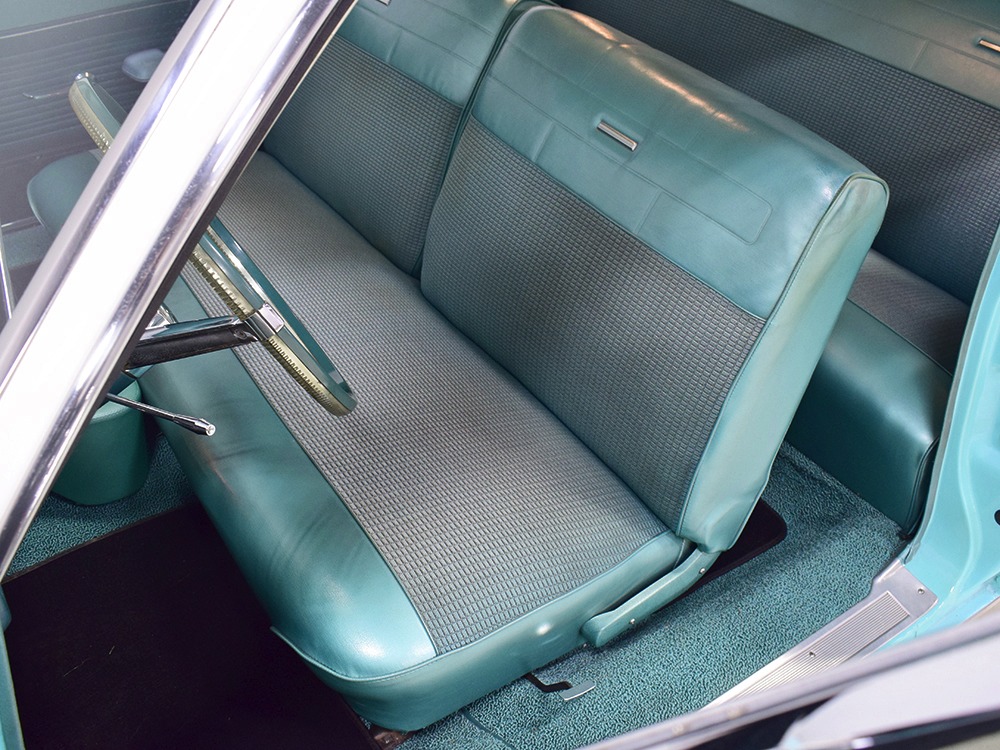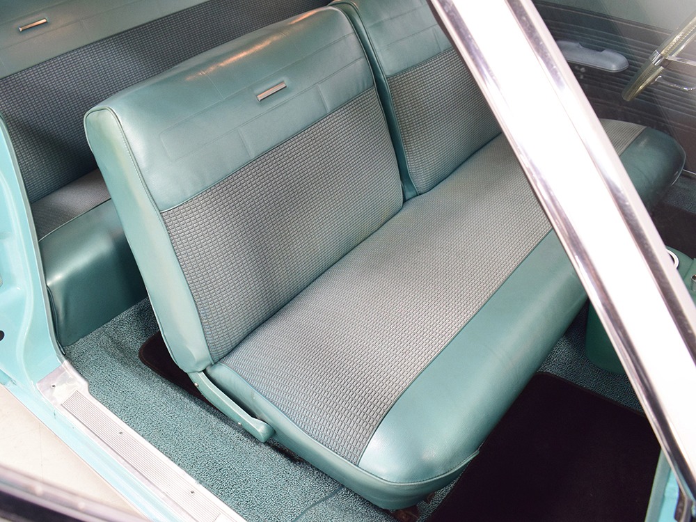 The interior appears to be largely original, with perhaps new carpets installed at some point. The wide bench seat wears matching aqua upholstery that’s pure 1960s cool and comfortable on warmer days. The plastic steering wheel frames a chrome instrument panel with a full array of round gauges that add a sporty vibe. A relatively rare AM/FM radio provides a period look, but the real entertainment comes from an aftermarket JVC head unit mounted on the center console. The door panels are excellent, as is the headliner, and the full-sized back seat looks almost completely unused. Of course, there’s also a massive trunk, which is outfitted with the original mat set and a full-sized spare tire.