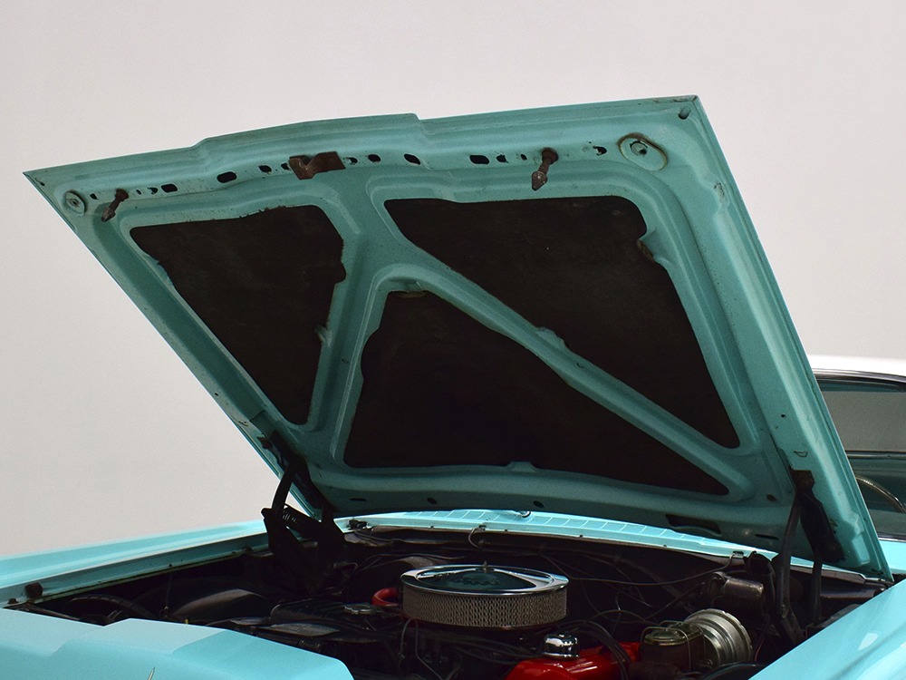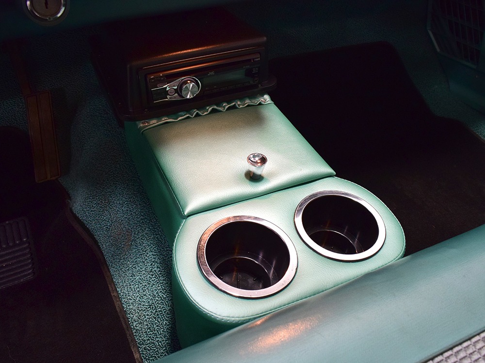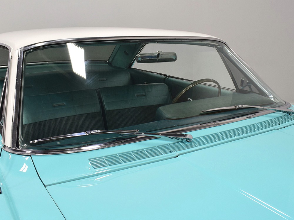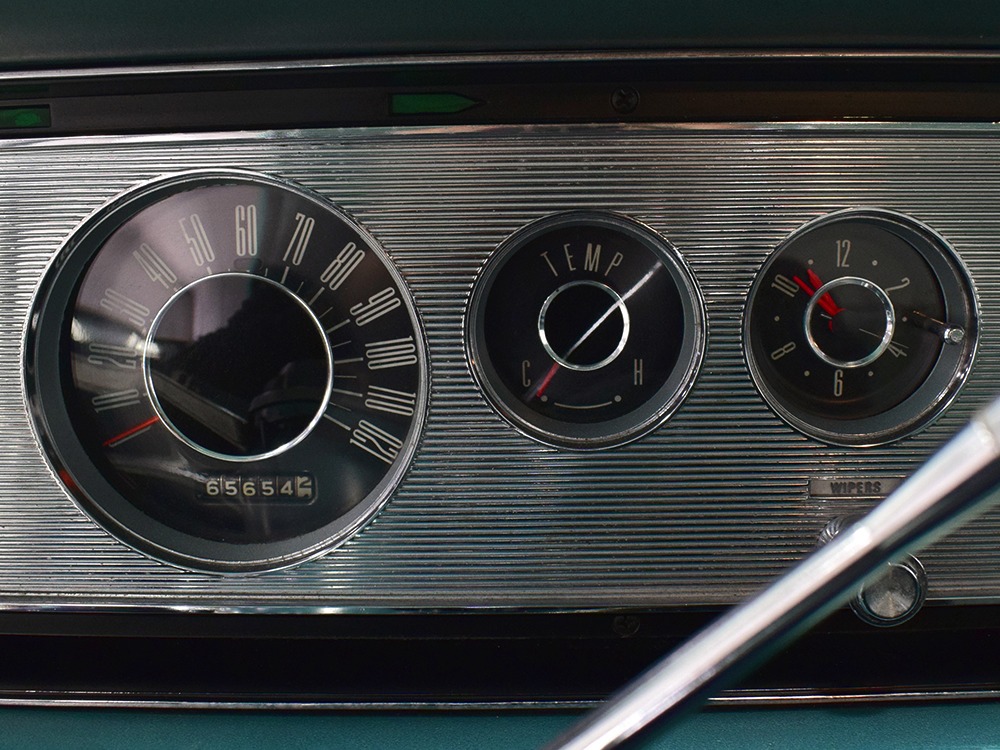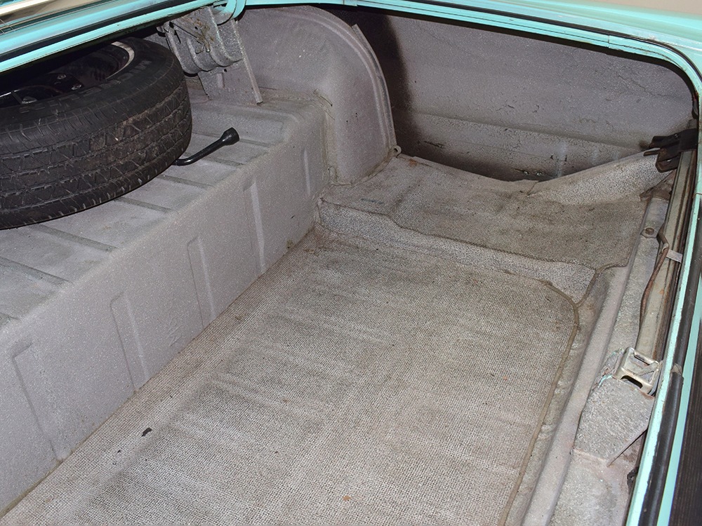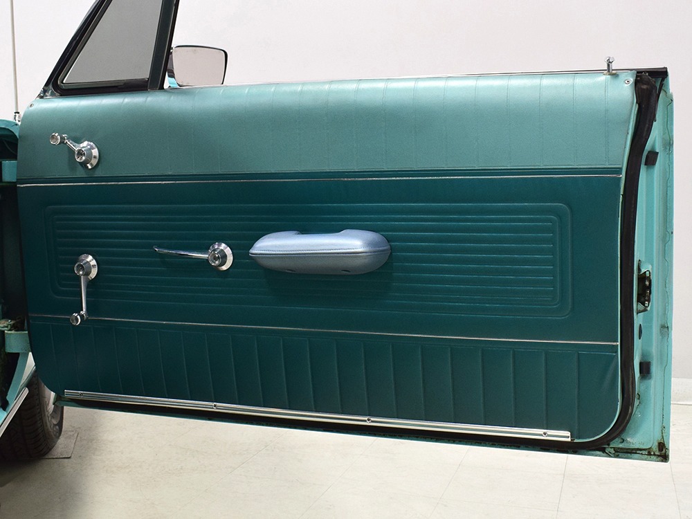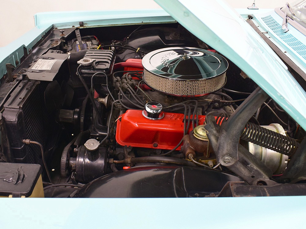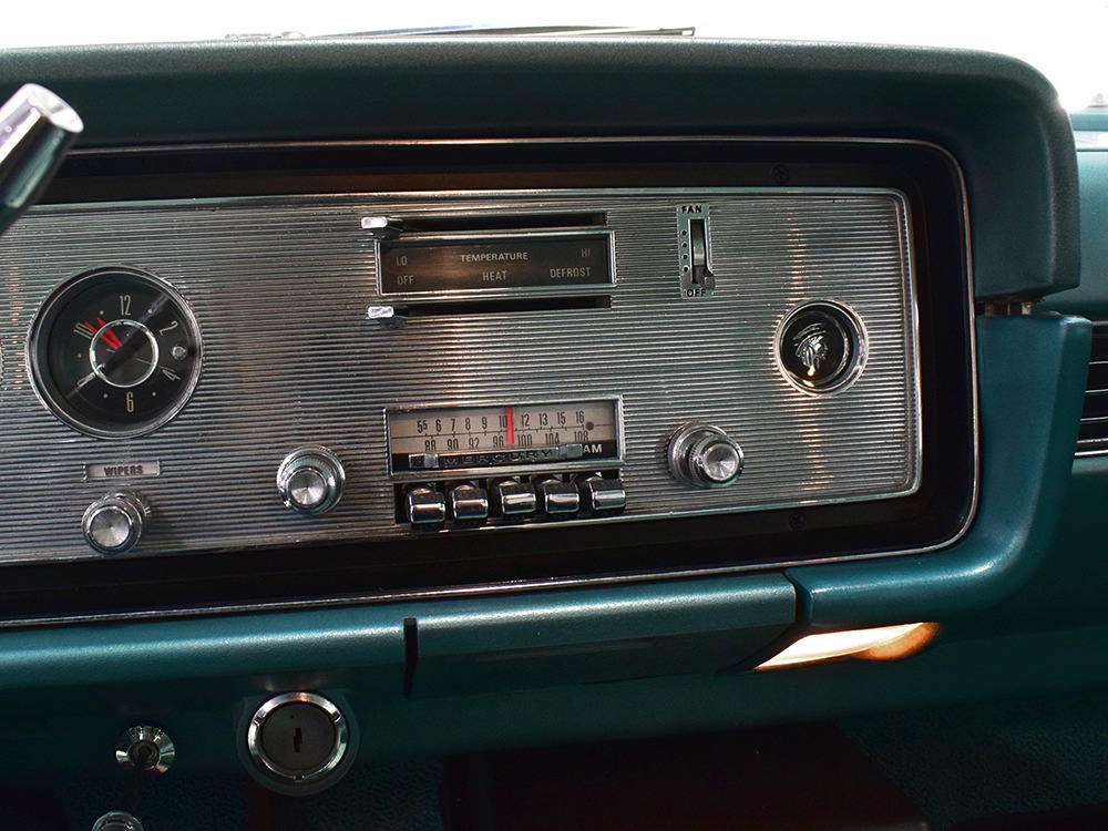 The interior appears to be largely original, with perhaps new carpets installed at some point. The wide bench seat wears matching aqua upholstery that’s pure 1960s cool and comfortable on warmer days. The plastic steering wheel frames a chrome instrument panel with a full array of round gauges that add a sporty vibe. A relatively rare AM/FM radio provides a period look, but the real entertainment comes from an aftermarket JVC head unit mounted on the center console. The door panels are excellent, as is the headliner, and the full-sized back seat looks almost completely unused. Of course, there’s also a massive trunk, which is outfitted with the original mat set and a full-sized spare tire.