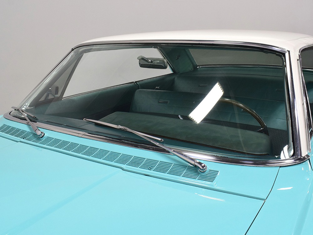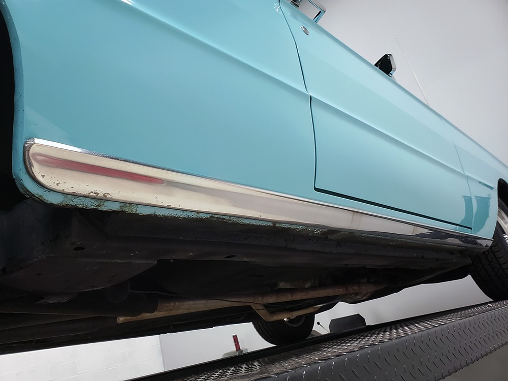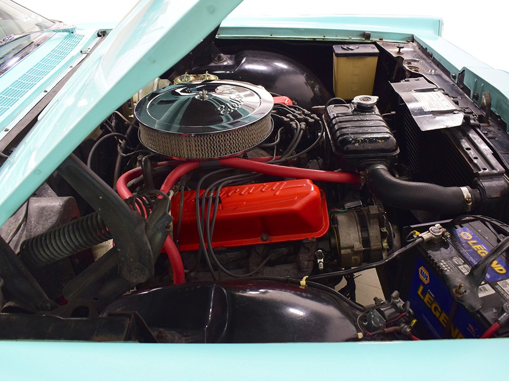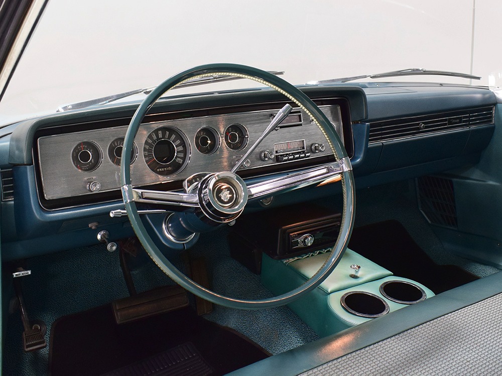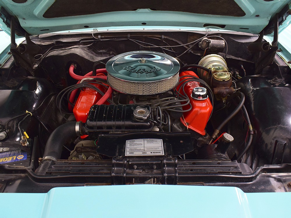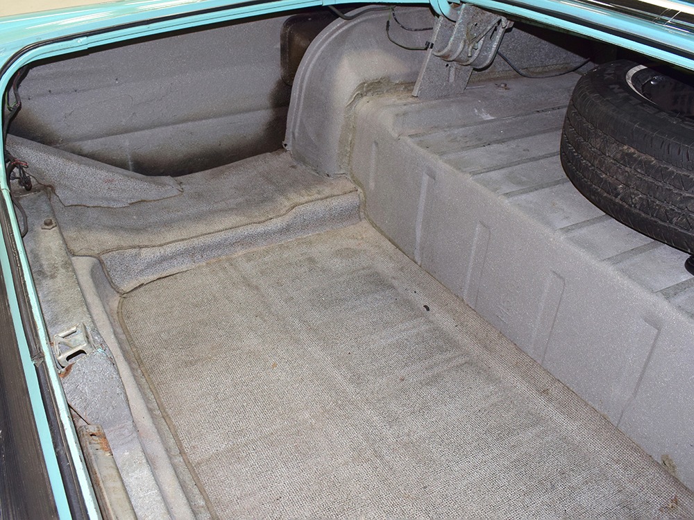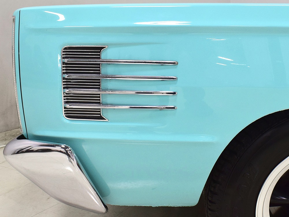 The interior appears to be largely original, with perhaps new carpets installed at some point. The wide bench seat wears matching aqua upholstery that’s pure 1960s cool and comfortable on warmer days. The plastic steering wheel frames a chrome instrument panel with a full array of round gauges that add a sporty vibe. A relatively rare AM/FM radio provides a period look, but the real entertainment comes from an aftermarket JVC head unit mounted on the center console. The door panels are excellent, as is the headliner, and the full-sized back seat looks almost completely unused. Of course, there’s also a massive trunk, which is outfitted with the original mat set and a full-sized spare tire.