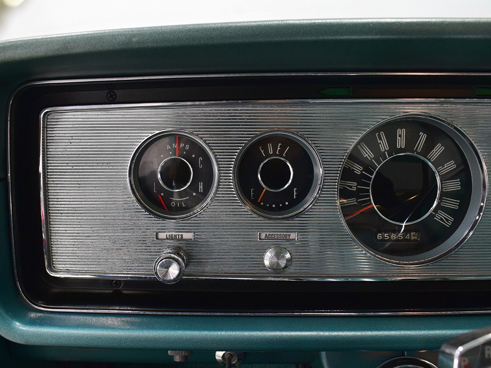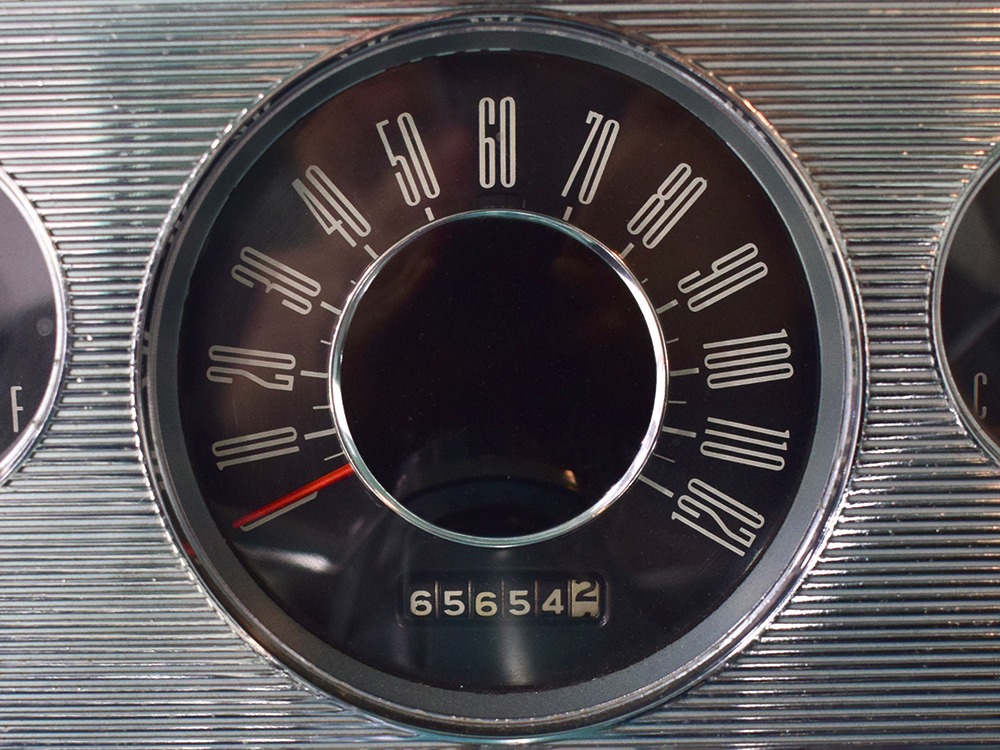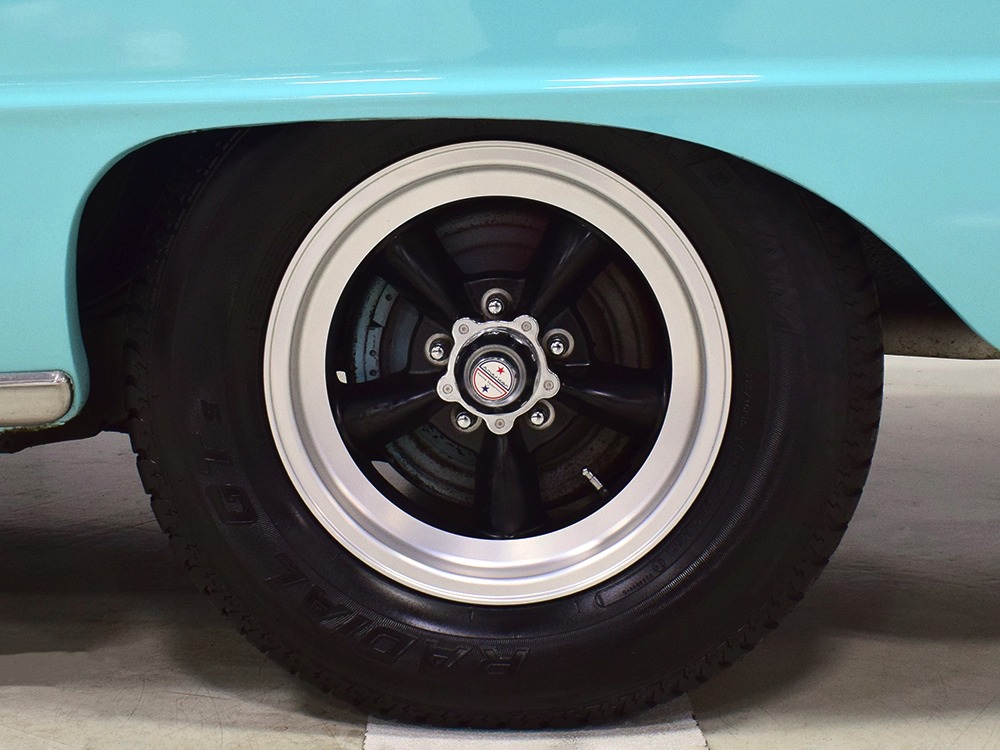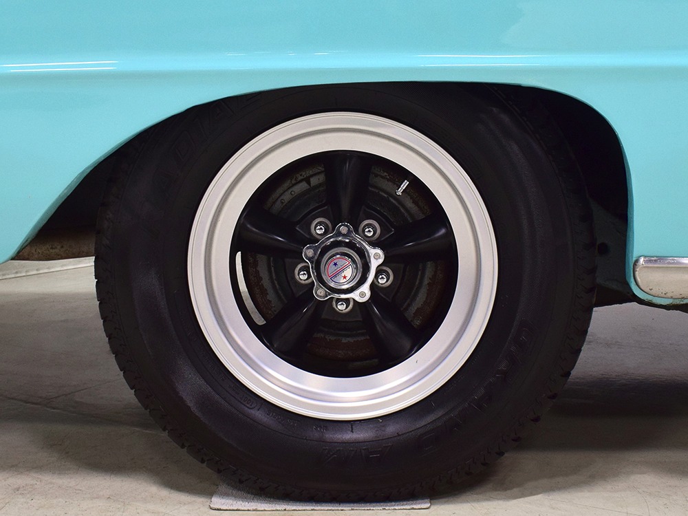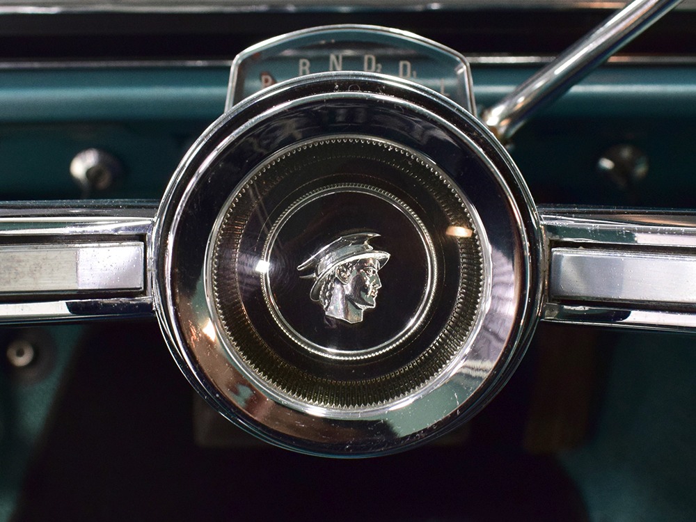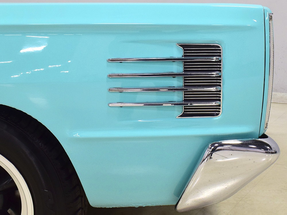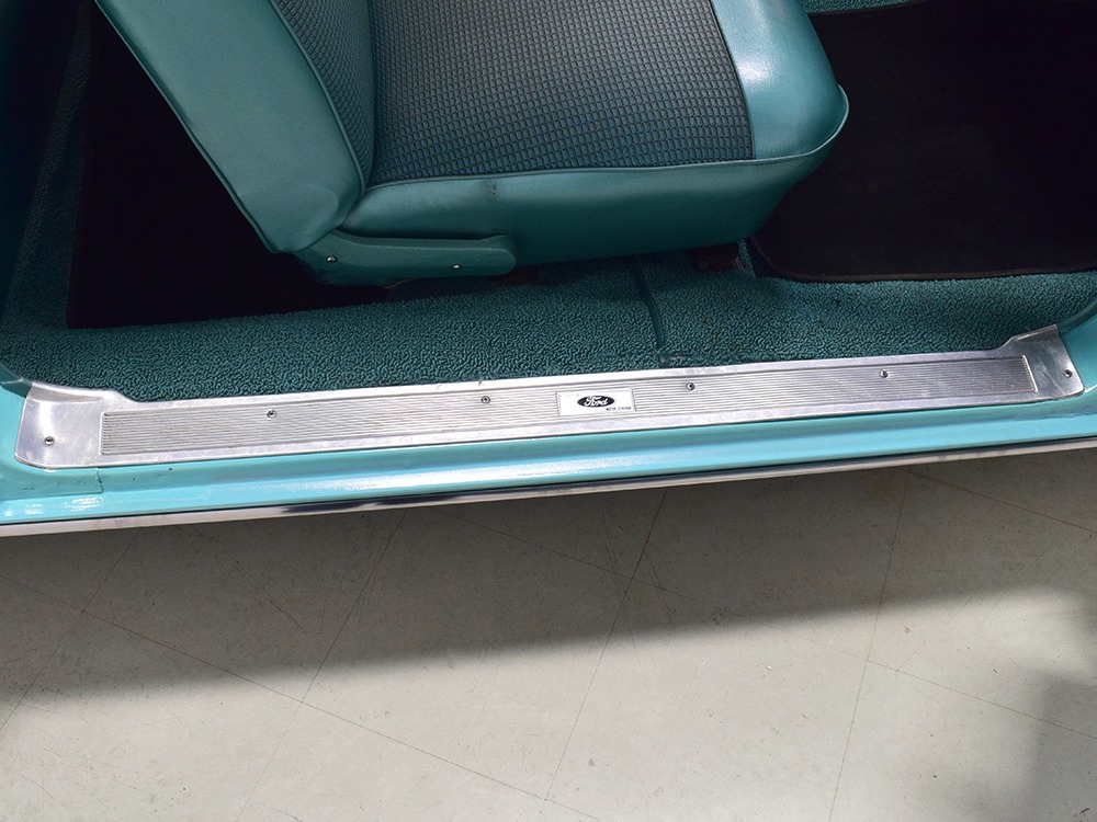 The interior appears to be largely original, with perhaps new carpets installed at some point. The wide bench seat wears matching aqua upholstery that’s pure 1960s cool and comfortable on warmer days. The plastic steering wheel frames a chrome instrument panel with a full array of round gauges that add a sporty vibe. A relatively rare AM/FM radio provides a period look, but the real entertainment comes from an aftermarket JVC head unit mounted on the center console. The door panels are excellent, as is the headliner, and the full-sized back seat looks almost completely unused. Of course, there’s also a massive trunk, which is outfitted with the original mat set and a full-sized spare tire.