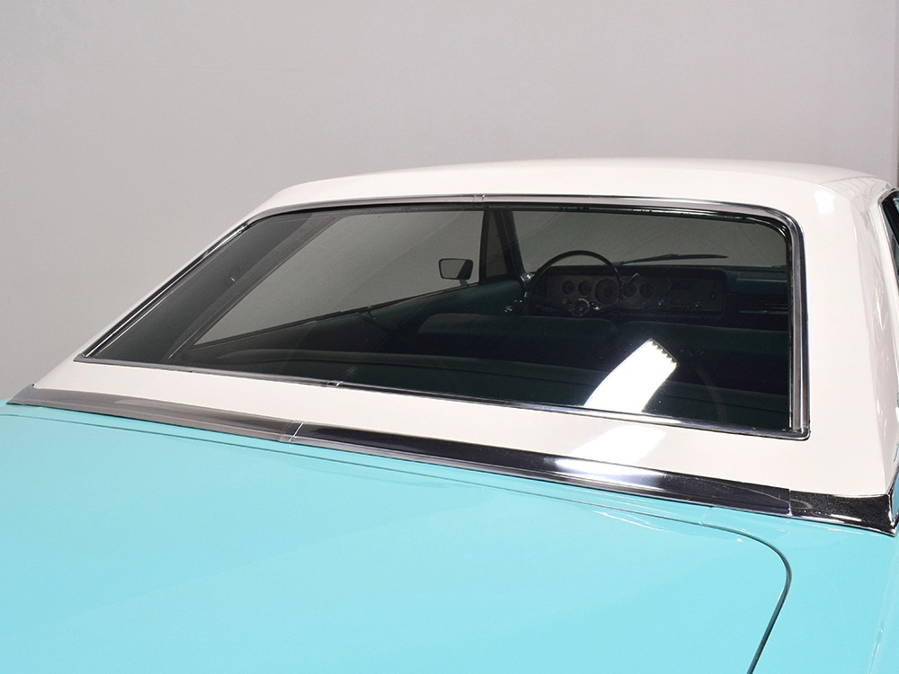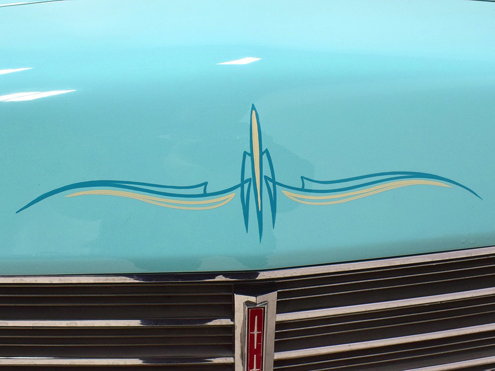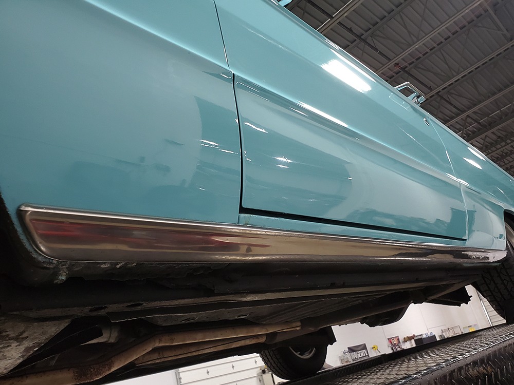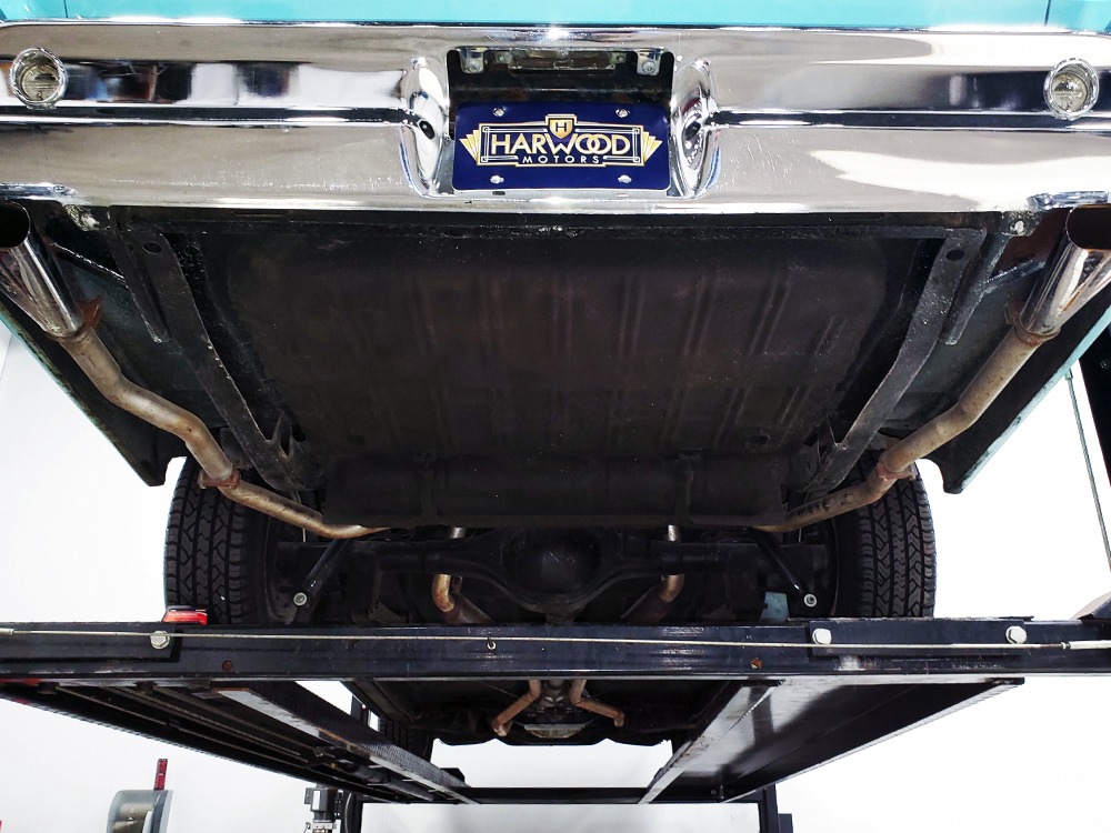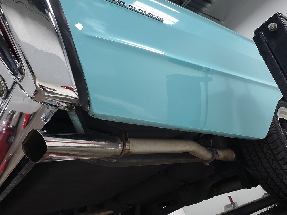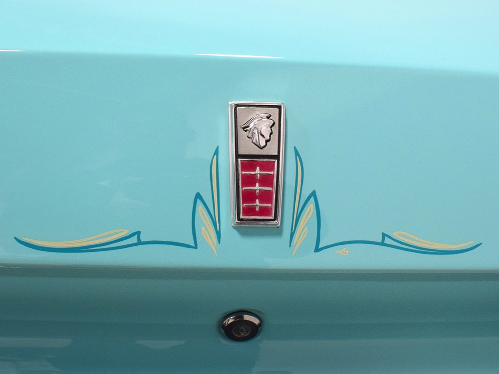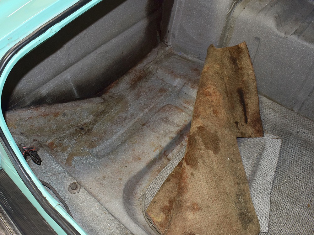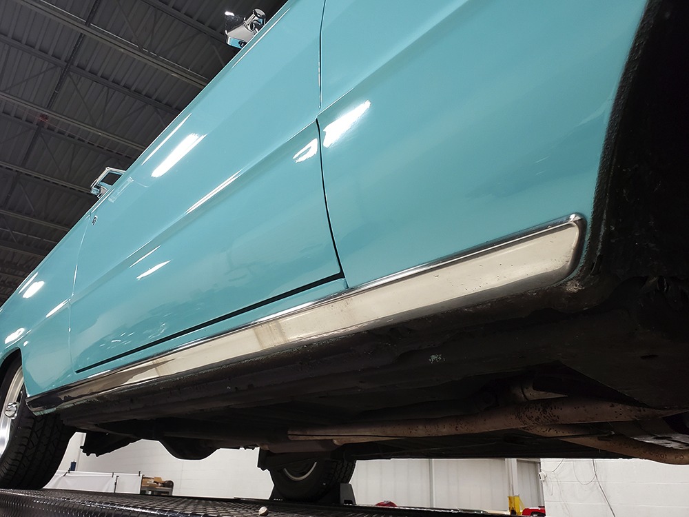 The interior appears to be largely original, with perhaps new carpets installed at some point. The wide bench seat wears matching aqua upholstery that’s pure 1960s cool and comfortable on warmer days. The plastic steering wheel frames a chrome instrument panel with a full array of round gauges that add a sporty vibe. A relatively rare AM/FM radio provides a period look, but the real entertainment comes from an aftermarket JVC head unit mounted on the center console. The door panels are excellent, as is the headliner, and the full-sized back seat looks almost completely unused. Of course, there’s also a massive trunk, which is outfitted with the original mat set and a full-sized spare tire.