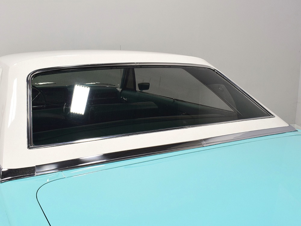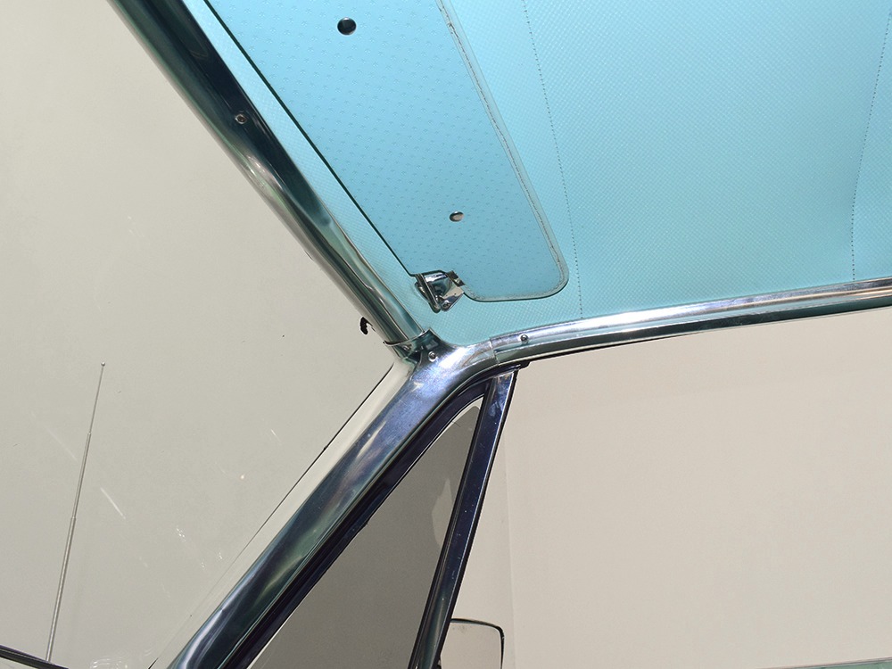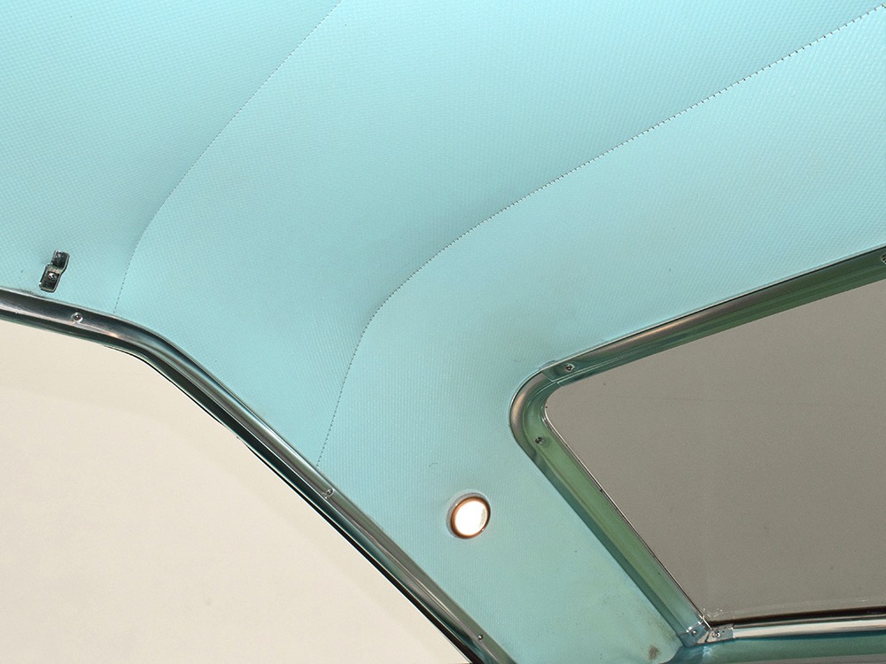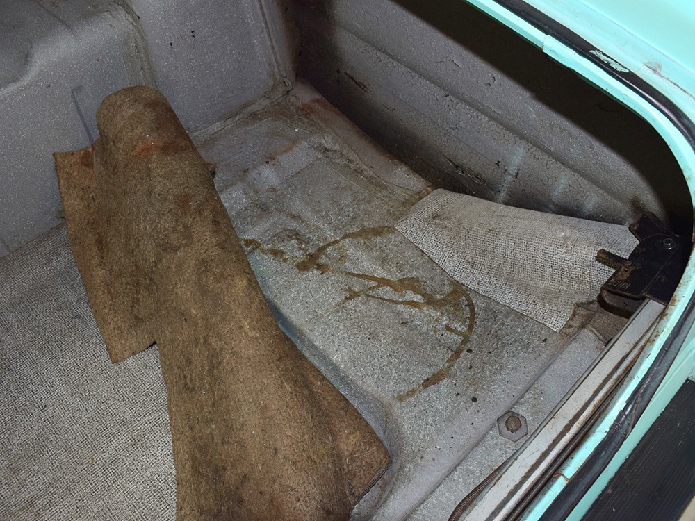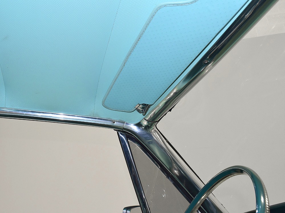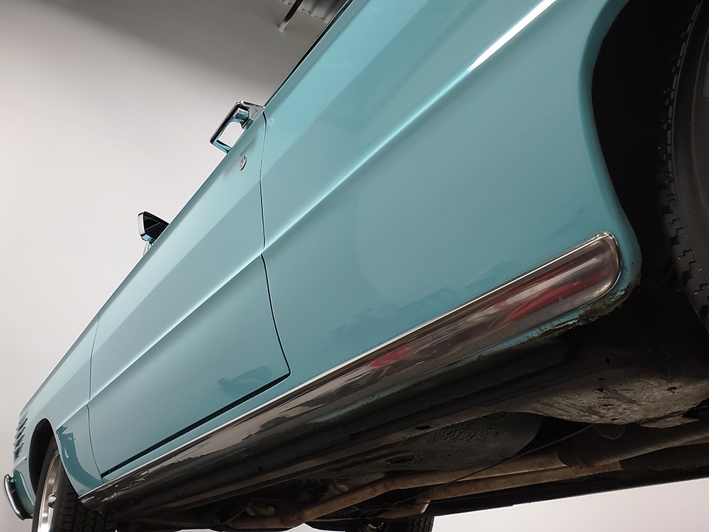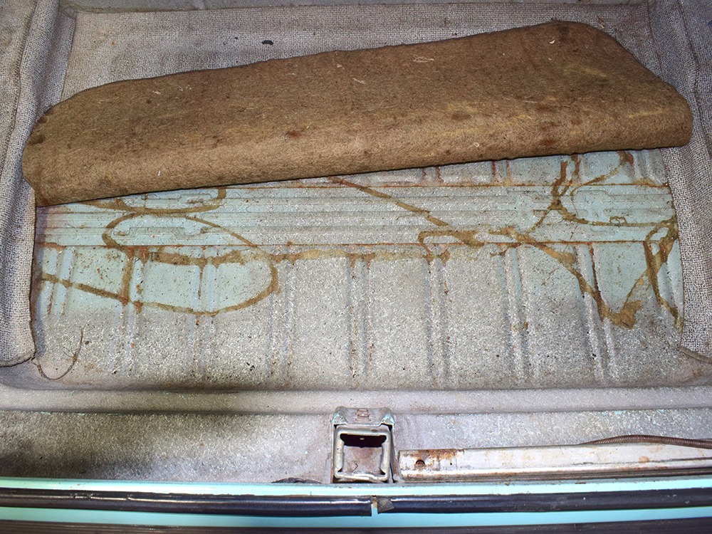 The interior appears to be largely original, with perhaps new carpets installed at some point. The wide bench seat wears matching aqua upholstery that’s pure 1960s cool and comfortable on warmer days. The plastic steering wheel frames a chrome instrument panel with a full array of round gauges that add a sporty vibe. A relatively rare AM/FM radio provides a period look, but the real entertainment comes from an aftermarket JVC head unit mounted on the center console. The door panels are excellent, as is the headliner, and the full-sized back seat looks almost completely unused. Of course, there’s also a massive trunk, which is outfitted with the original mat set and a full-sized spare tire.