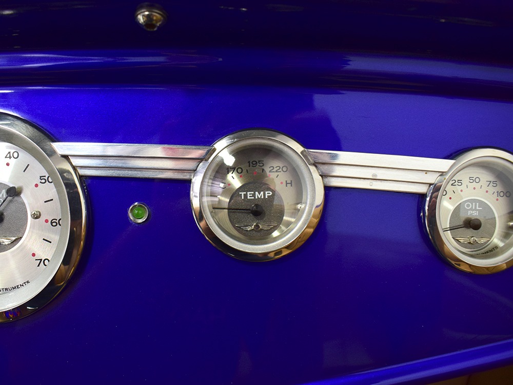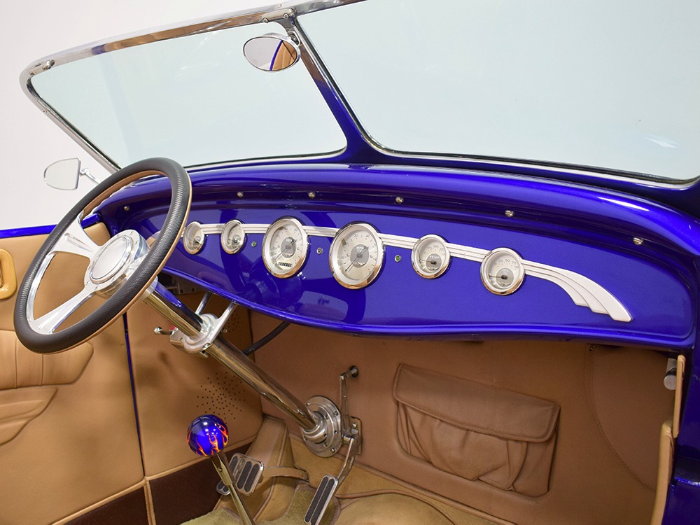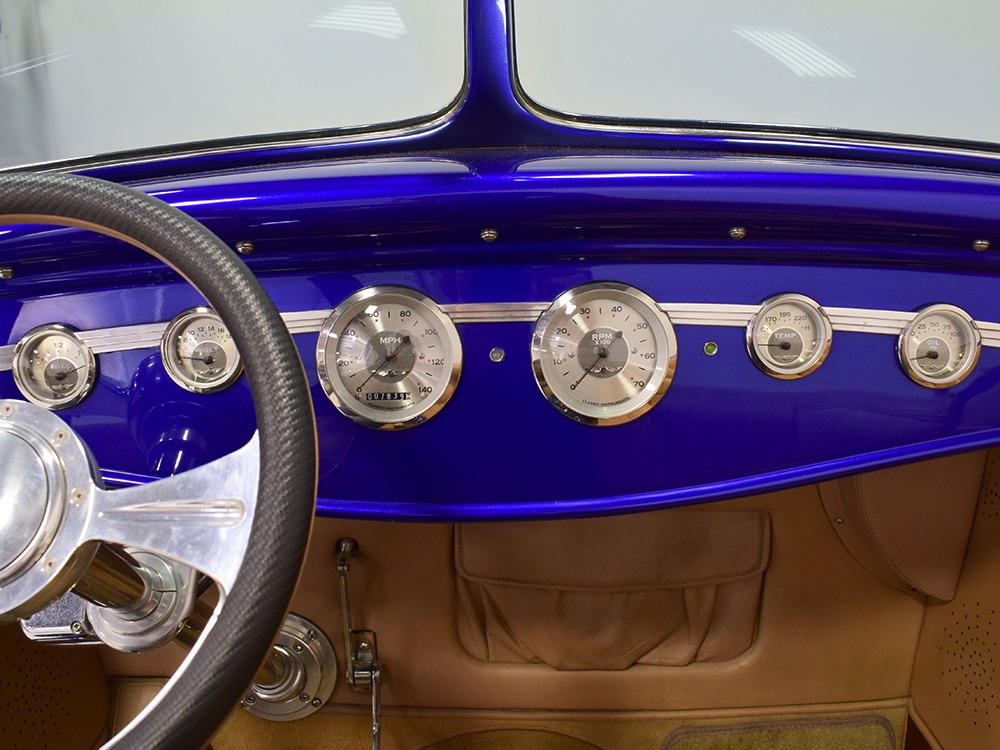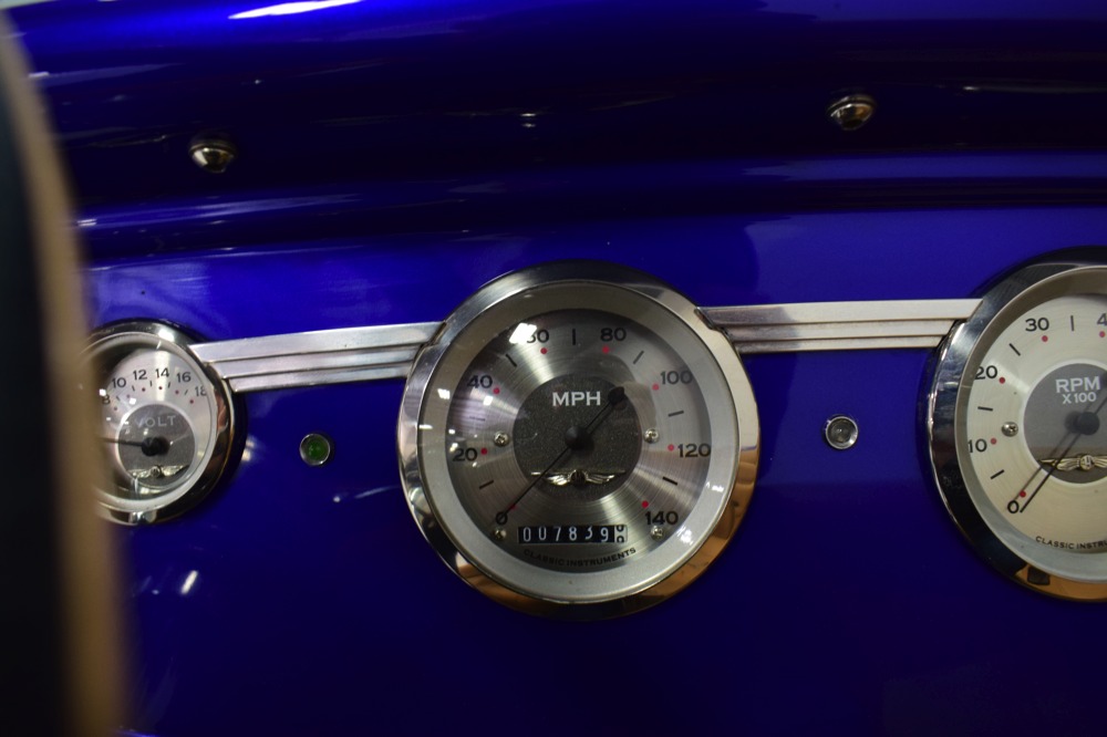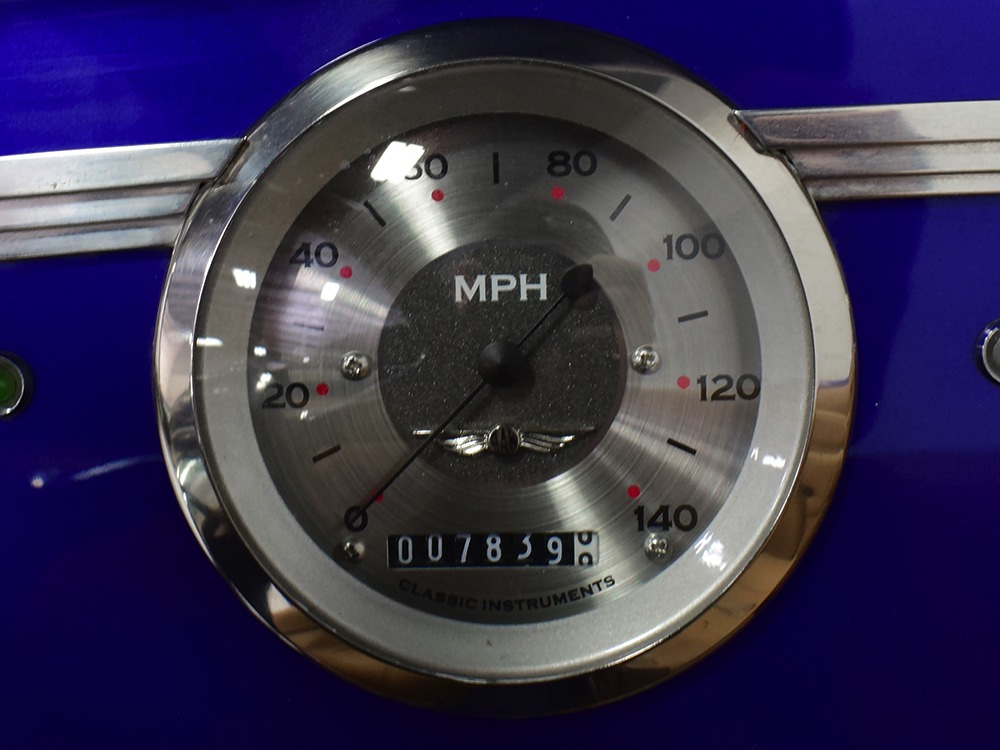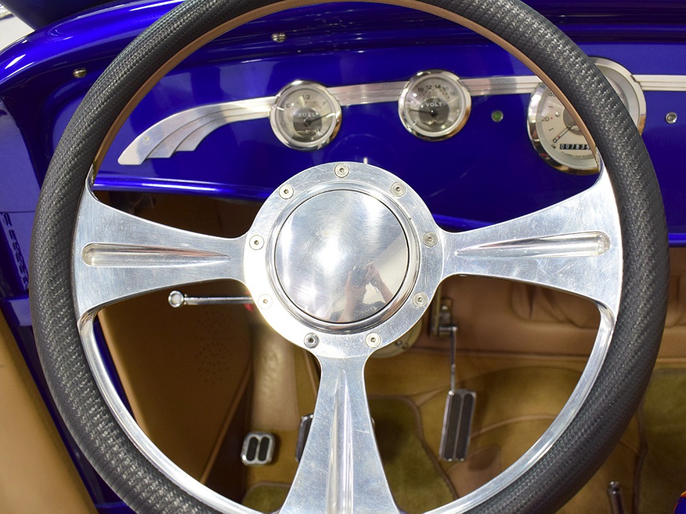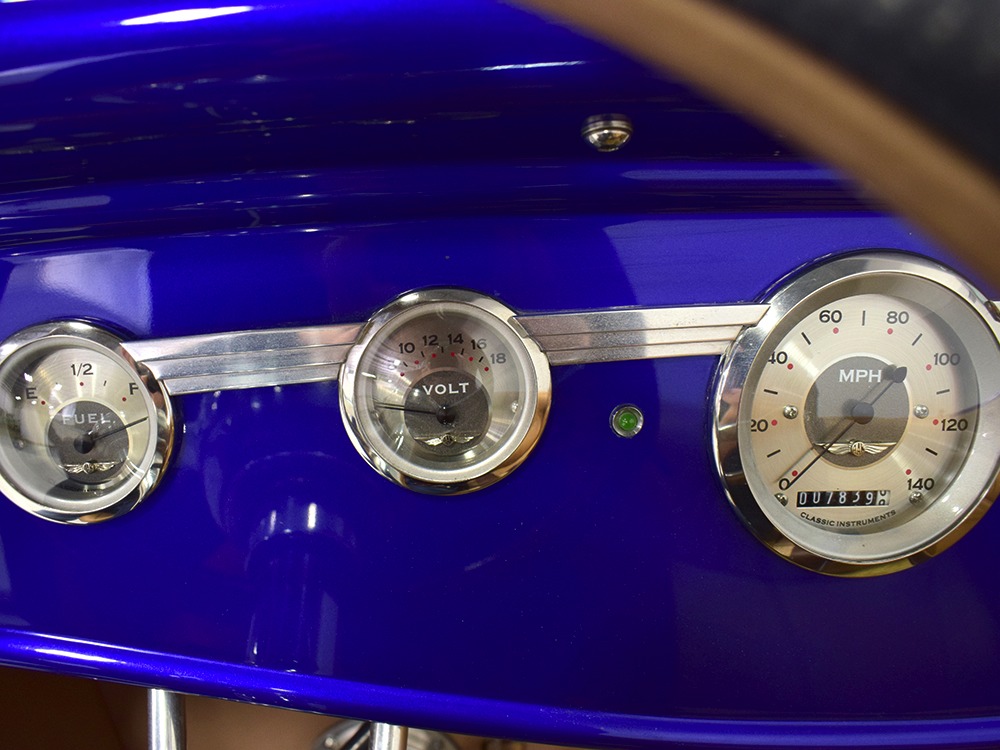 This beautiful electric blue ’32 Ford roadster nails the traditional look: low slung, minimalist, with enough style to attract attention wherever it goes. And the great thing about rods like this is that they cost a fraction as much as building one from scratch and let’s admit it: this is the car you’d build anyway. From the Brookville steel body to the rumbling 350 Chevy crate motor, it gets all the important stuff right. Starting with fresh sheetmetal right out of the press means there are zero problems under the skin—it’s new. It was built in Arizona, so the climate since it was finished was always friendly and there’s no sign of accident damage or other maladies anywhere on the car. Heck, with only 7839 miles since it was built, there hasn’t been much time for anything bad to happen to it. Panel gaps are excellent and the doors fit extremely well—better than Henry’s stuff to be sure. There’s also a steel 3-piece hood, a Vee’d windshield, and a painted radiator shell to give it a clean, no-nonsense look. They thankfully skipped any graphics, pinstripes, or other extraneous details so this sleek rod will look awesome 20 years from now when you’re still having fun with it.