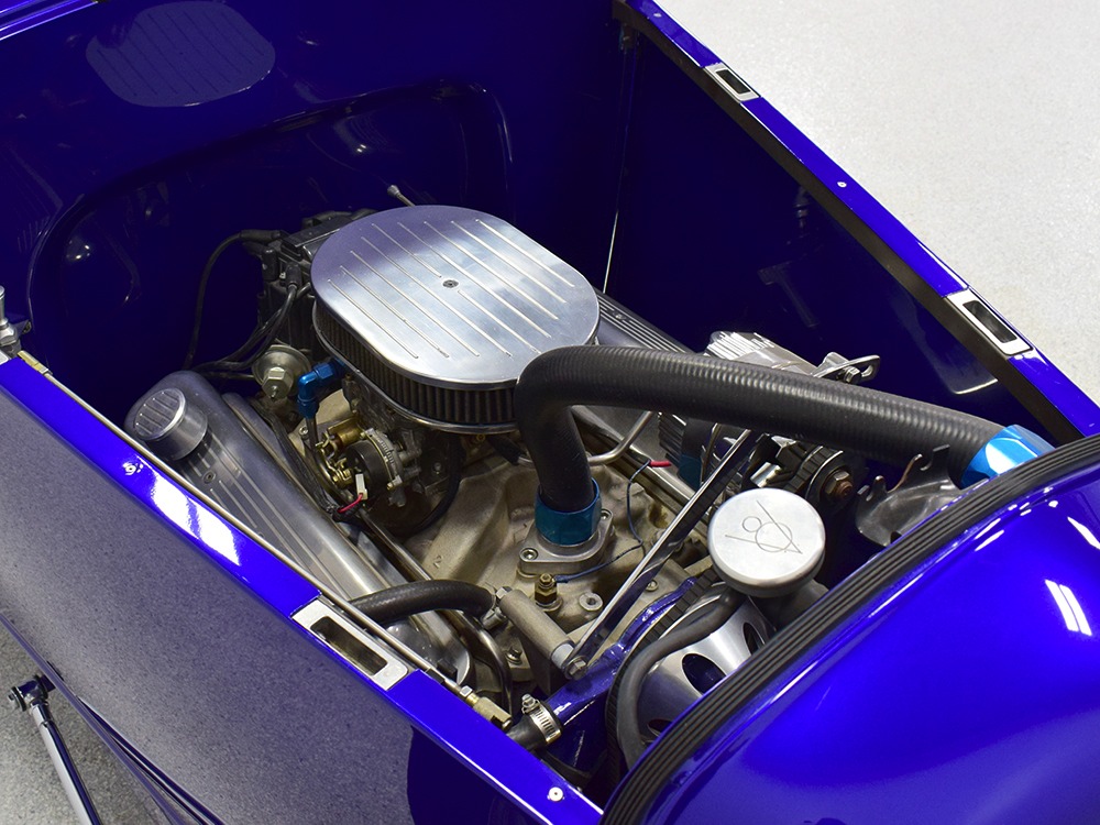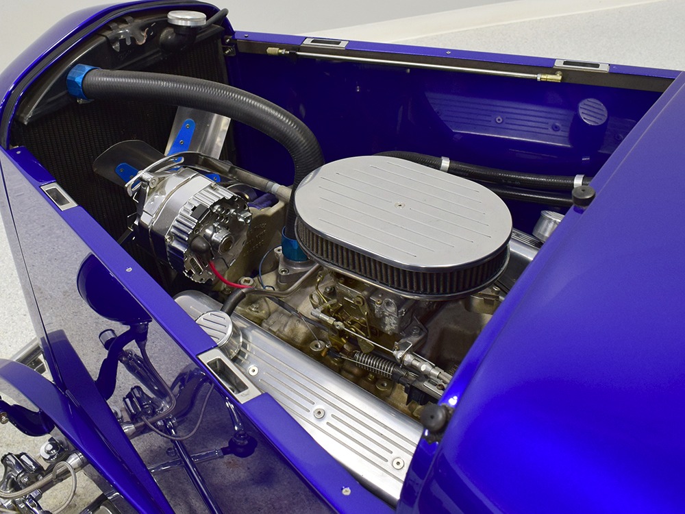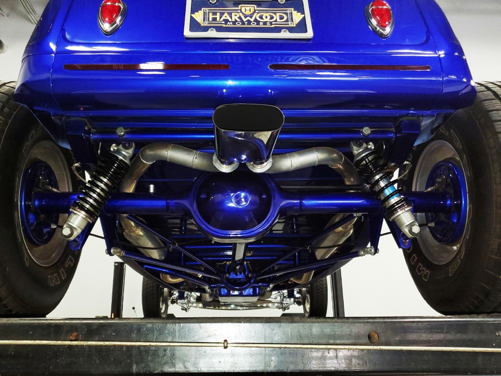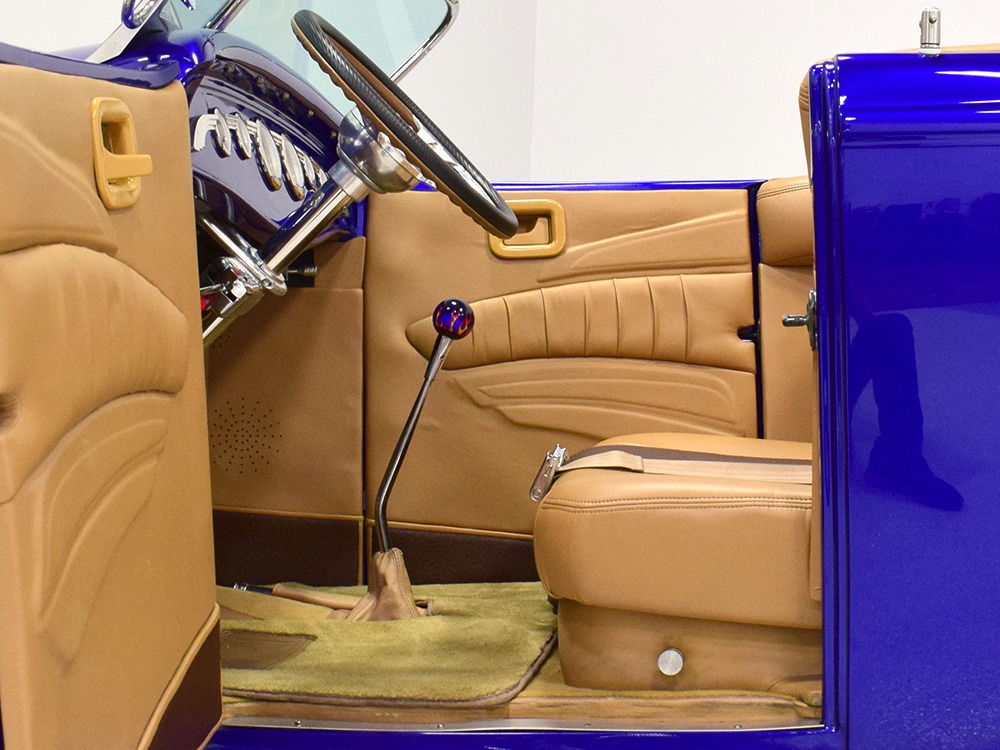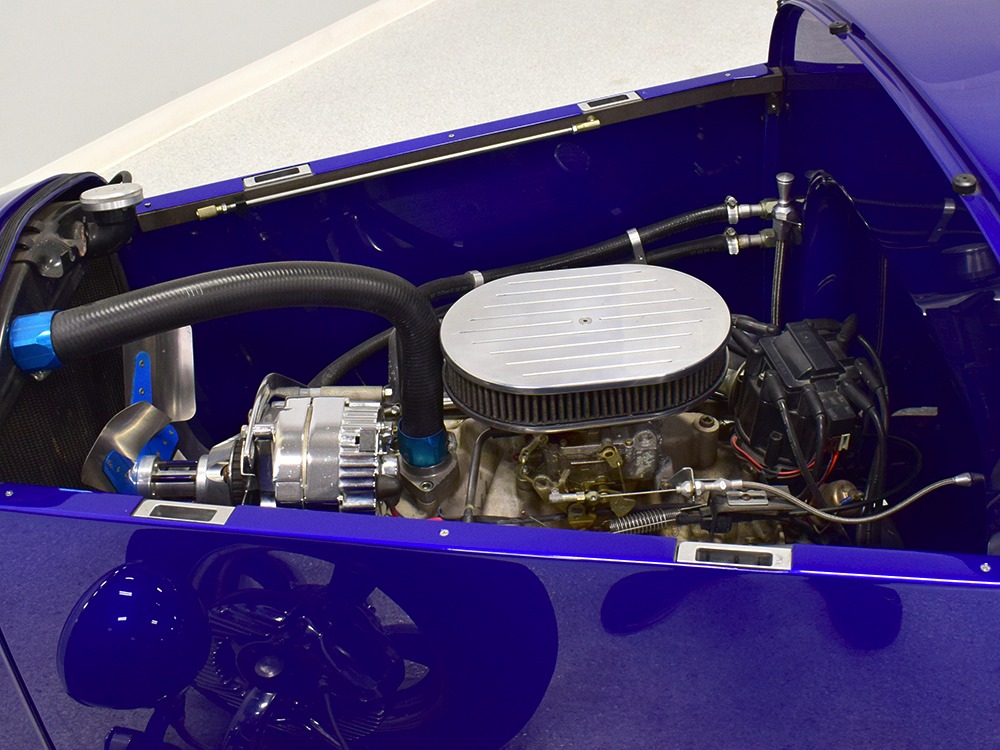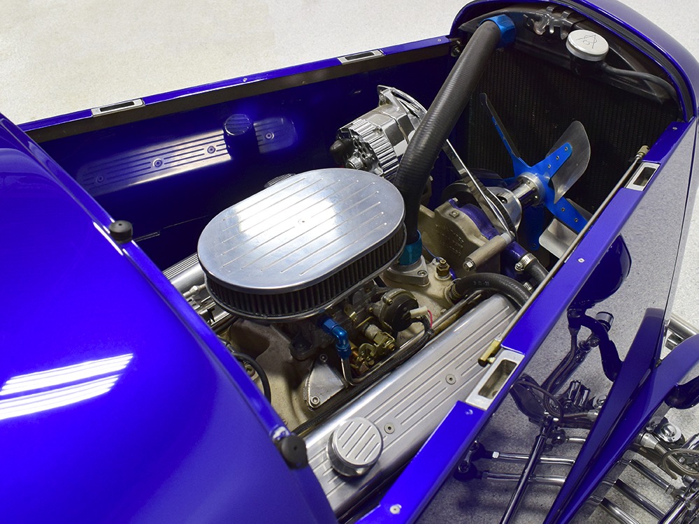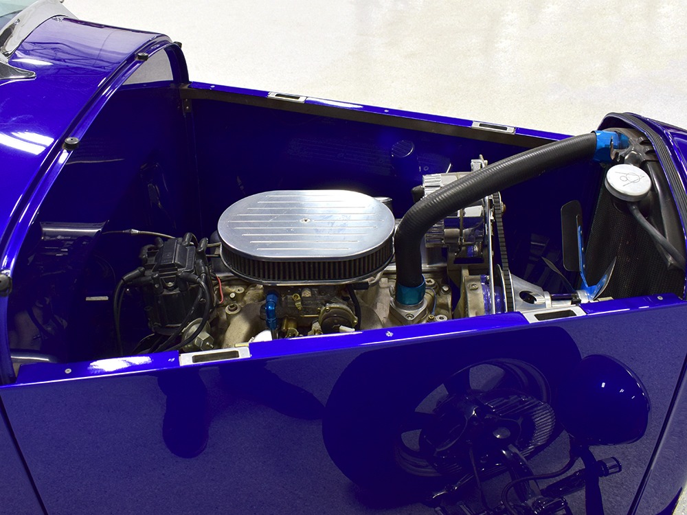 The powertrain doesn’t break any new ground, but it’s powerful, reliable, and easy to maintain. The 350 cubic inch Chevrolet V8 is a mainstay of hot rod building, and it’s topped by an Edelbrock 4-barrel carburetor on an aluminum intake manifold. Reliable GM HEI ignition handle the spark and there’s plenty of chrome and polished aluminum to make it worthwhile to open the hood. It starts easily, idles nicely, and pulls the featherweight roadster around with enough enthusiasm to scare most drivers. It’s downright quick! There’s also a giant radiator up front, so feel free to cruise on hot days, and there’s a heater for cooler spring and fall evenings when you’re just taking it easy with a friend. The transmission is a 700R4 4-speed automatic with overdrive, so it’s relaxed at speed, and there are 3.50 gears out back in the Ford rear end. The chassis is all new and includes a traditional dropped I-beam front axle on a leaf spring, while the rear is supported by a 4-link on coil-overs. A full stainless exhaust sounds awesome and has a trick single outlet in the center, and with rack-and-pinion steering and front disc brakes, it’s competent and easy to manage without feeling crude. 15-inch Torque Thrust wheels are the right choice for a period rod and carry staggered 165R15 front and 31x10.50R15 rear Michelin radials.