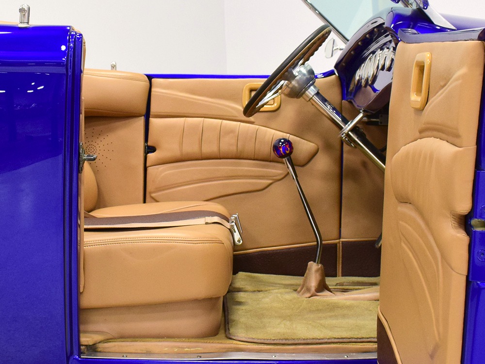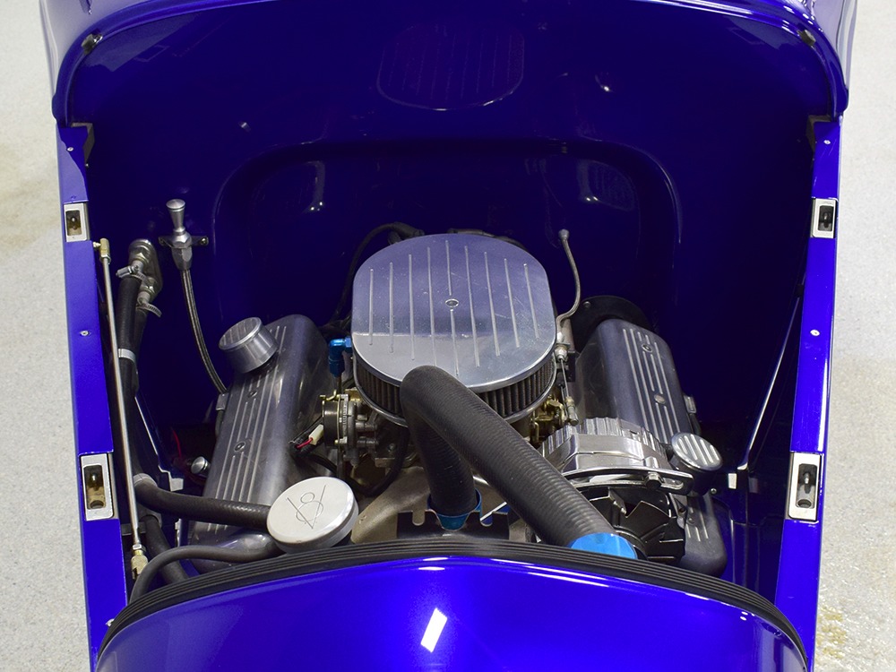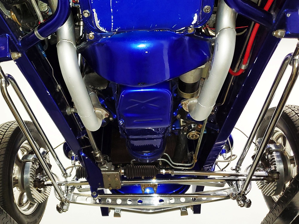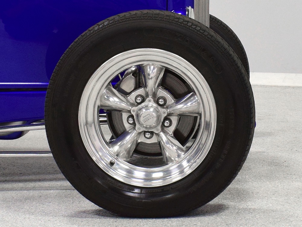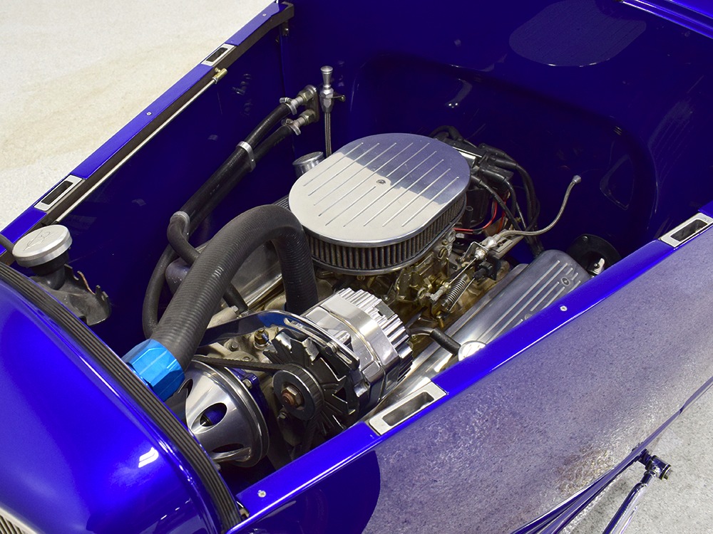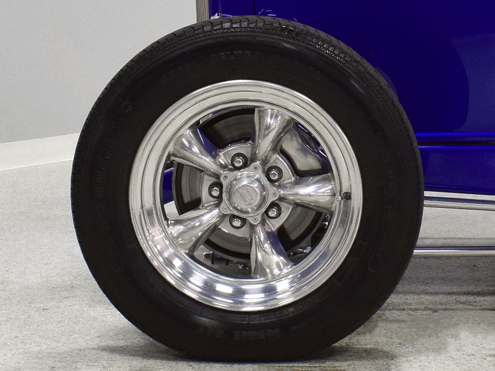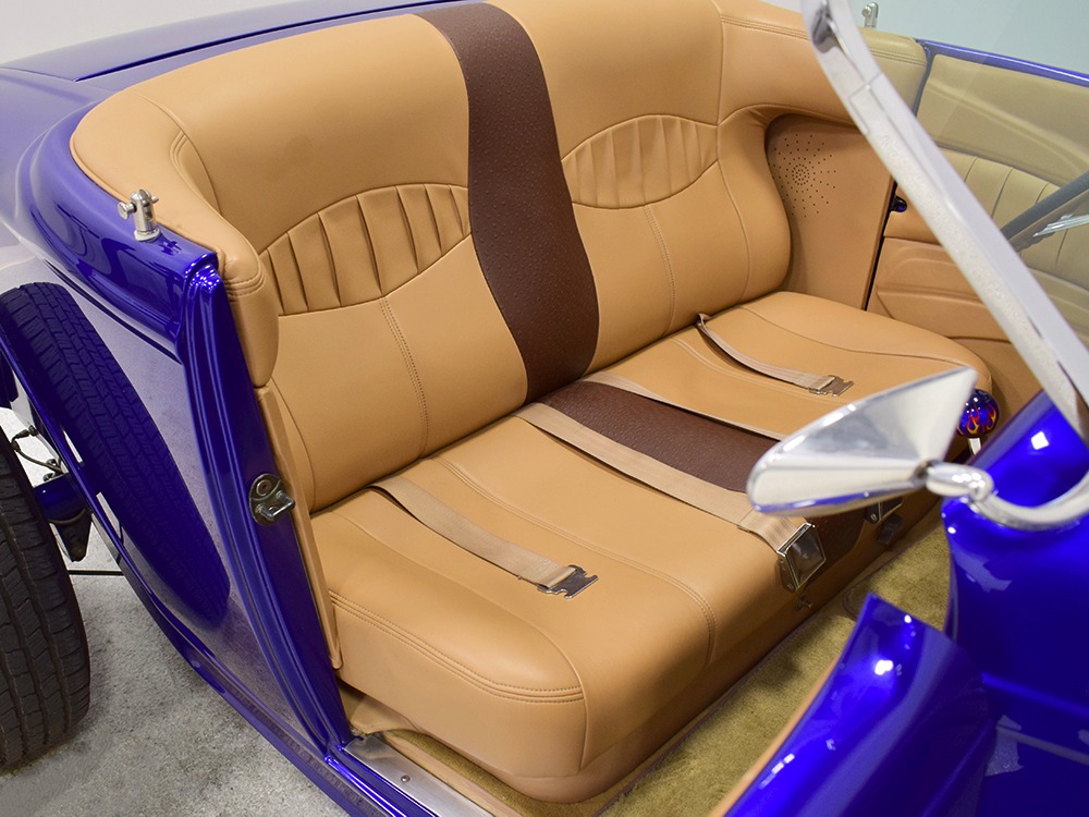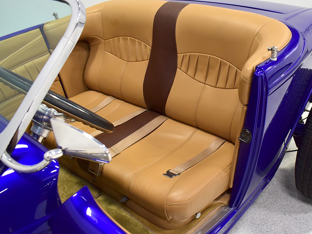 The powertrain doesn’t break any new ground, but it’s powerful, reliable, and easy to maintain. The 350 cubic inch Chevrolet V8 is a mainstay of hot rod building, and it’s topped by an Edelbrock 4-barrel carburetor on an aluminum intake manifold. Reliable GM HEI ignition handle the spark and there’s plenty of chrome and polished aluminum to make it worthwhile to open the hood. It starts easily, idles nicely, and pulls the featherweight roadster around with enough enthusiasm to scare most drivers. It’s downright quick! There’s also a giant radiator up front, so feel free to cruise on hot days, and there’s a heater for cooler spring and fall evenings when you’re just taking it easy with a friend. The transmission is a 700R4 4-speed automatic with overdrive, so it’s relaxed at speed, and there are 3.50 gears out back in the Ford rear end. The chassis is all new and includes a traditional dropped I-beam front axle on a leaf spring, while the rear is supported by a 4-link on coil-overs. A full stainless exhaust sounds awesome and has a trick single outlet in the center, and with rack-and-pinion steering and front disc brakes, it’s competent and easy to manage without feeling crude. 15-inch Torque Thrust wheels are the right choice for a period rod and carry staggered 165R15 front and 31x10.50R15 rear Michelin radials.