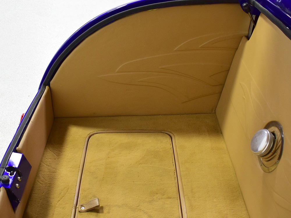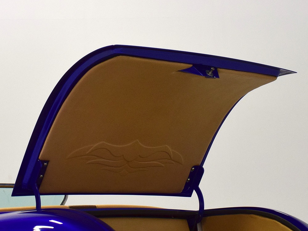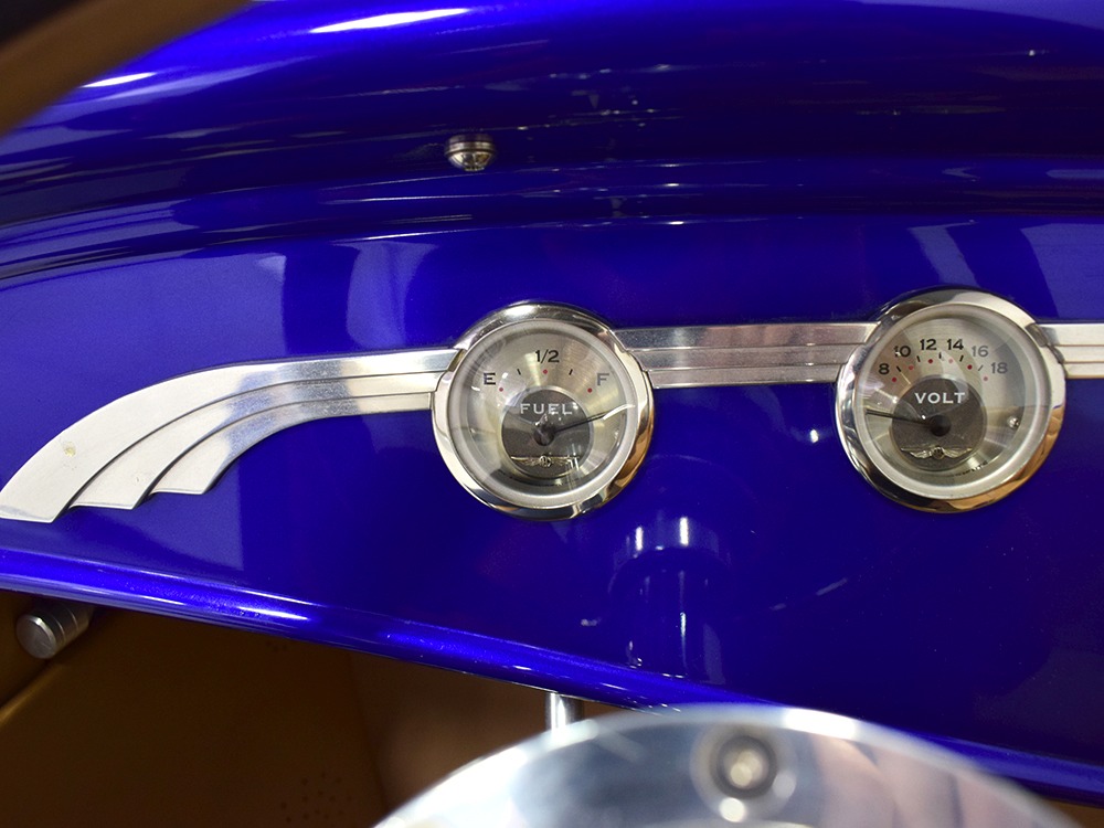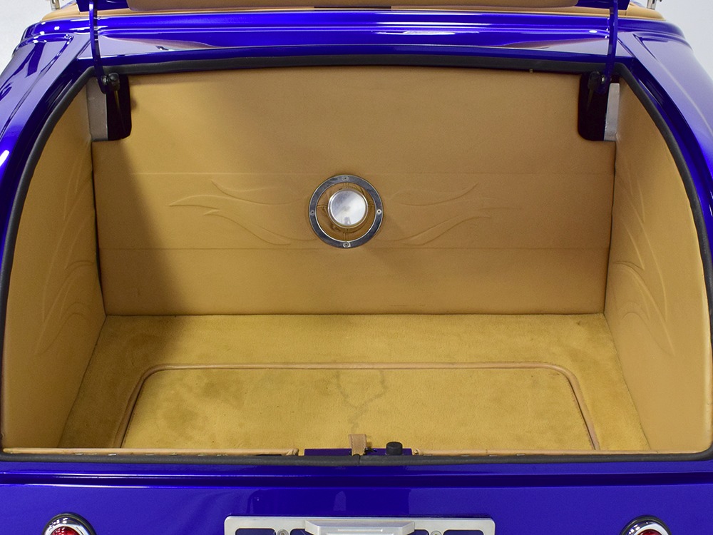 The interior is beautifully done. The reproduction body offers a bit more space for driver and passenger, and the way the seat back wraps around into the bodywork is just plain cool. The contoured bench holds you in place during spirited driving and there’s plenty of leg room even for 6-footers. A traditional steering column holds a billet wheel that’s linked directly to the rack up front, so steering is sports car precise and while the angle of the wheel is old school, it’s comfortable and easy to manage. A full array of gauges from Classic Instruments have a 1930s look and monitor all the engine’s vitals at a glance. There’s a hidden stereo system in the trunk that’s managed with a remote, but if you need a radio in a car like this, you’re doing it wrong. Overhead there’s a tan canvas top that’s easy to remove and stow in the trunk and offers a modicum of protection from the sun and rain, although we bet you’ll prefer to run it alfresco most of the time. And that trunk is as beautifully finished as the interior, including removable bulkheads to access the electronics and stereo, as well as the gas tank.