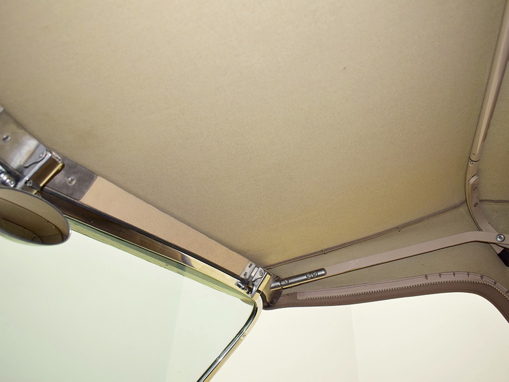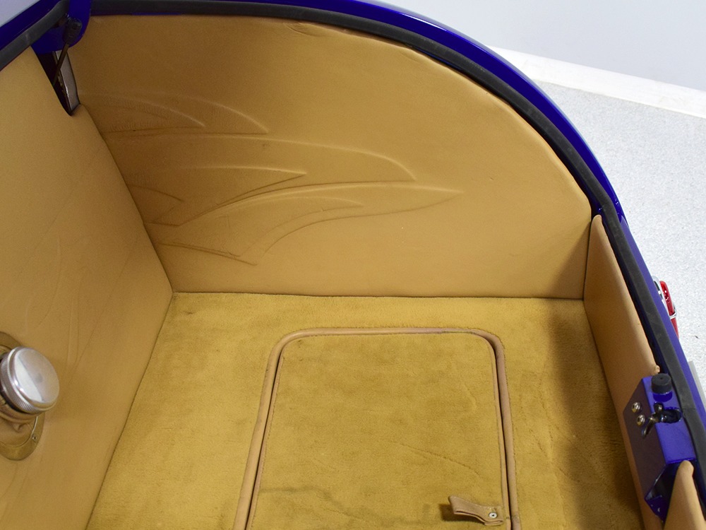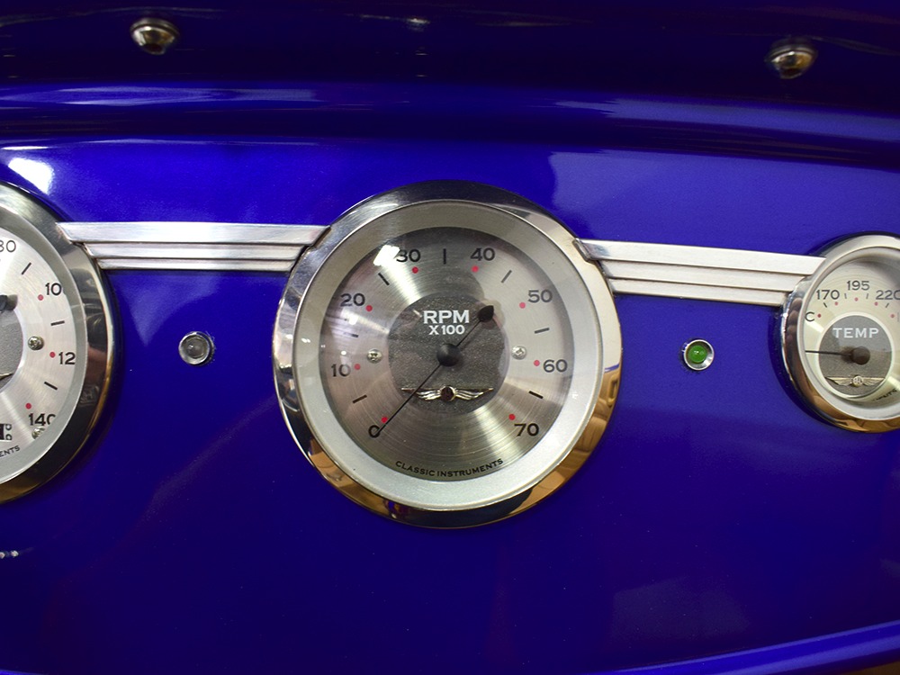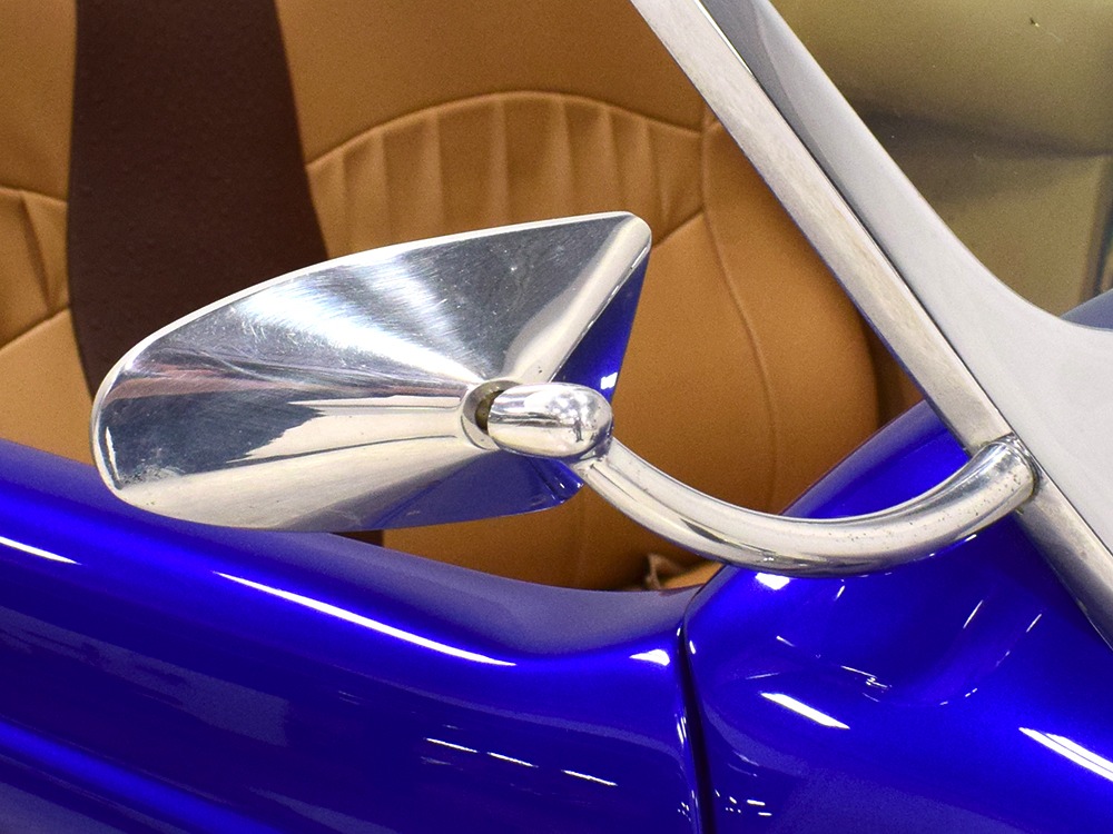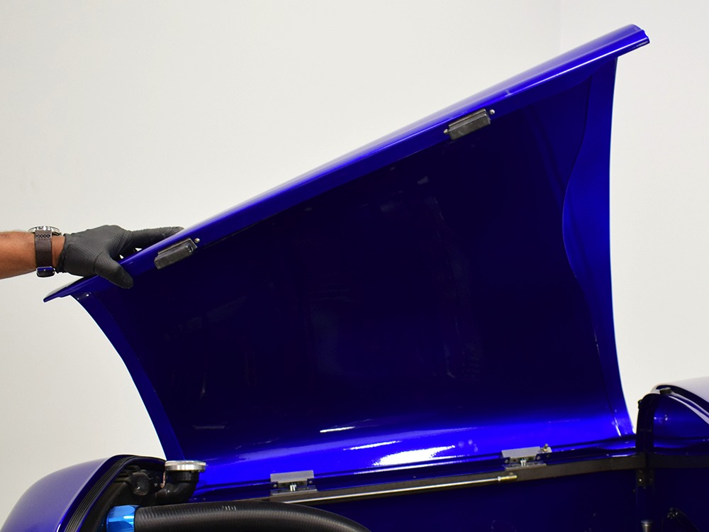 The interior is beautifully done. The reproduction body offers a bit more space for driver and passenger, and the way the seat back wraps around into the bodywork is just plain cool. The contoured bench holds you in place during spirited driving and there’s plenty of leg room even for 6-footers. A traditional steering column holds a billet wheel that’s linked directly to the rack up front, so steering is sports car precise and while the angle of the wheel is old school, it’s comfortable and easy to manage. A full array of gauges from Classic Instruments have a 1930s look and monitor all the engine’s vitals at a glance. There’s a hidden stereo system in the trunk that’s managed with a remote, but if you need a radio in a car like this, you’re doing it wrong. Overhead there’s a tan canvas top that’s easy to remove and stow in the trunk and offers a modicum of protection from the sun and rain, although we bet you’ll prefer to run it alfresco most of the time. And that trunk is as beautifully finished as the interior, including removable bulkheads to access the electronics and stereo, as well as the gas tank.