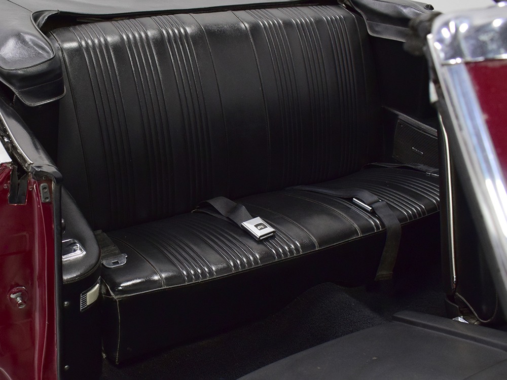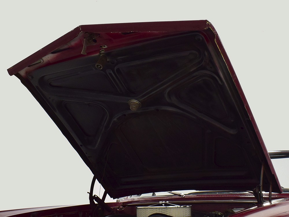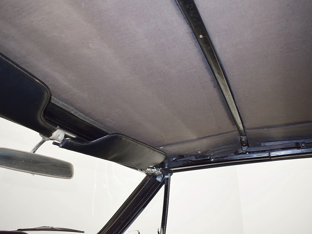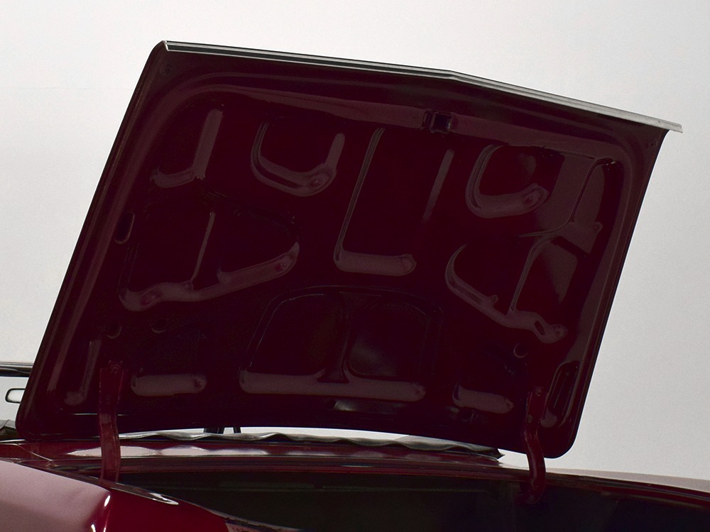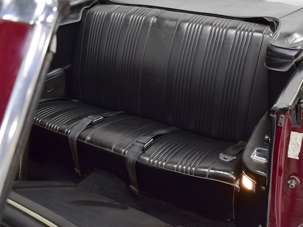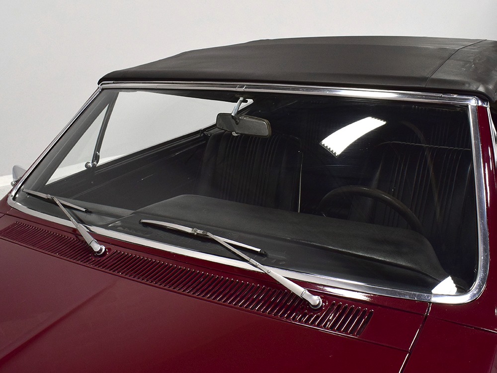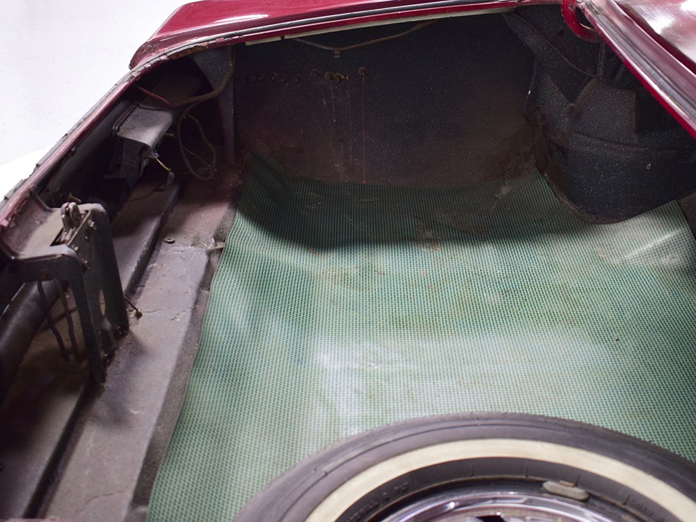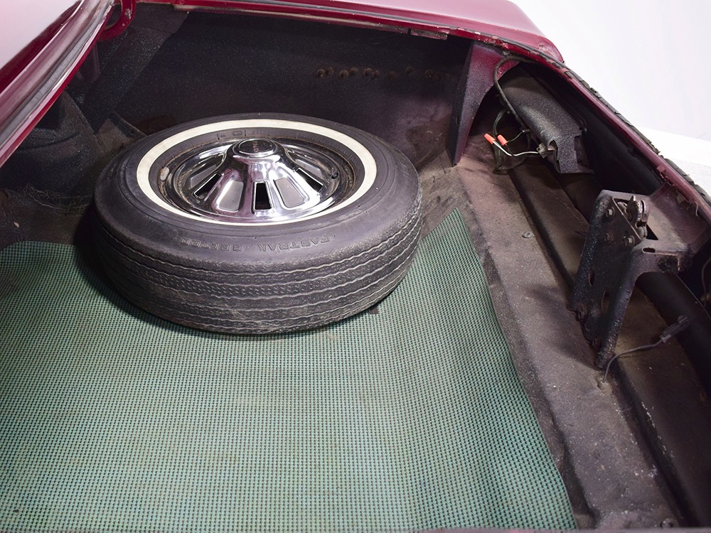 The black vinyl interior remains in fantastic condition. The seats are so nice we have to believe they are reproduction seat covers, but they’re much better quality than a lot of the stuff you see today. Most everything else is original equipment save for the steering wheel, which has been replaced by a slightly smaller and fatter aftermarket unit. Factory gauges cover only the basics, so a set of aftermarket oil pressure and temperature dials were added under the deash and at some point, an AM/FM/cassette head unit was installed in the dash. Factory woodgraining warms up the black interior and there are some heavy-duty floor mats to protect the carpets. The power convertible top works well and latches easily, although the rear window has started to come loose—an upholstery shop should be able to remedy that without much difficulty. There’s also a matching black vinyl boot to give it a clean look when the top is down (which should be pretty much all the time if you’re doing it right). The trunk is outfitted with a correct mat and includes a full-sized spare tire assembly.