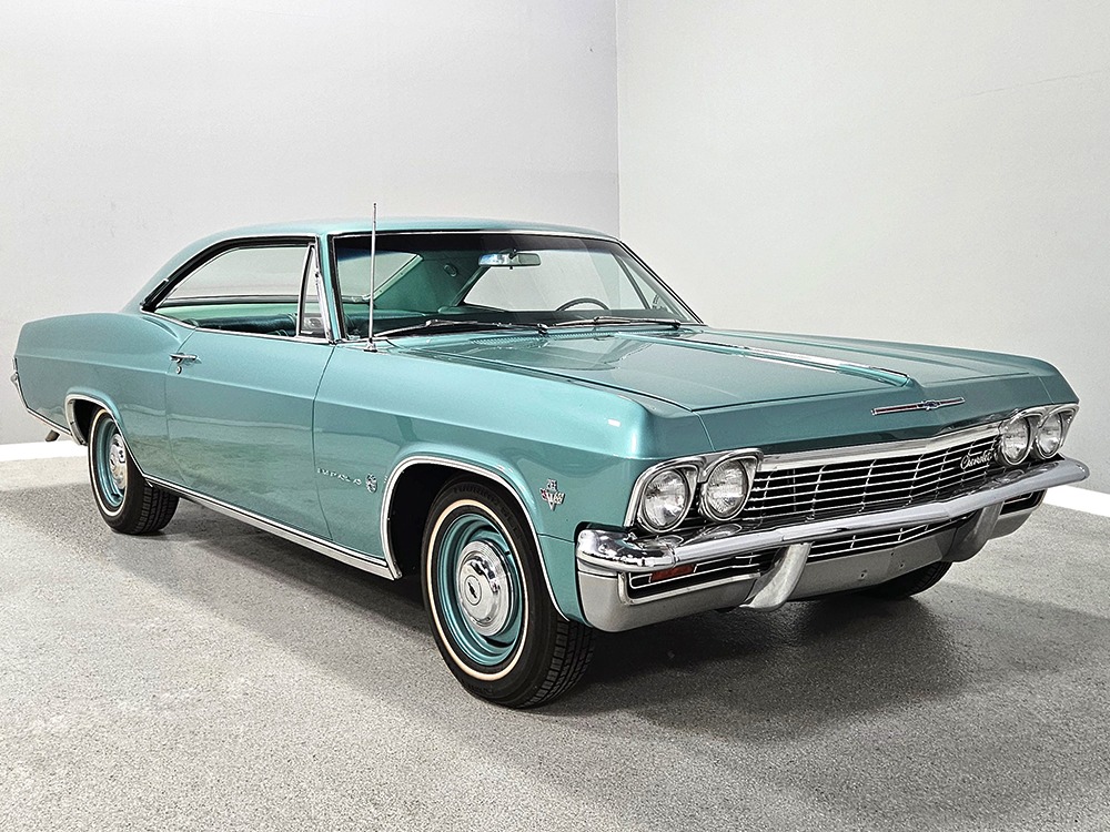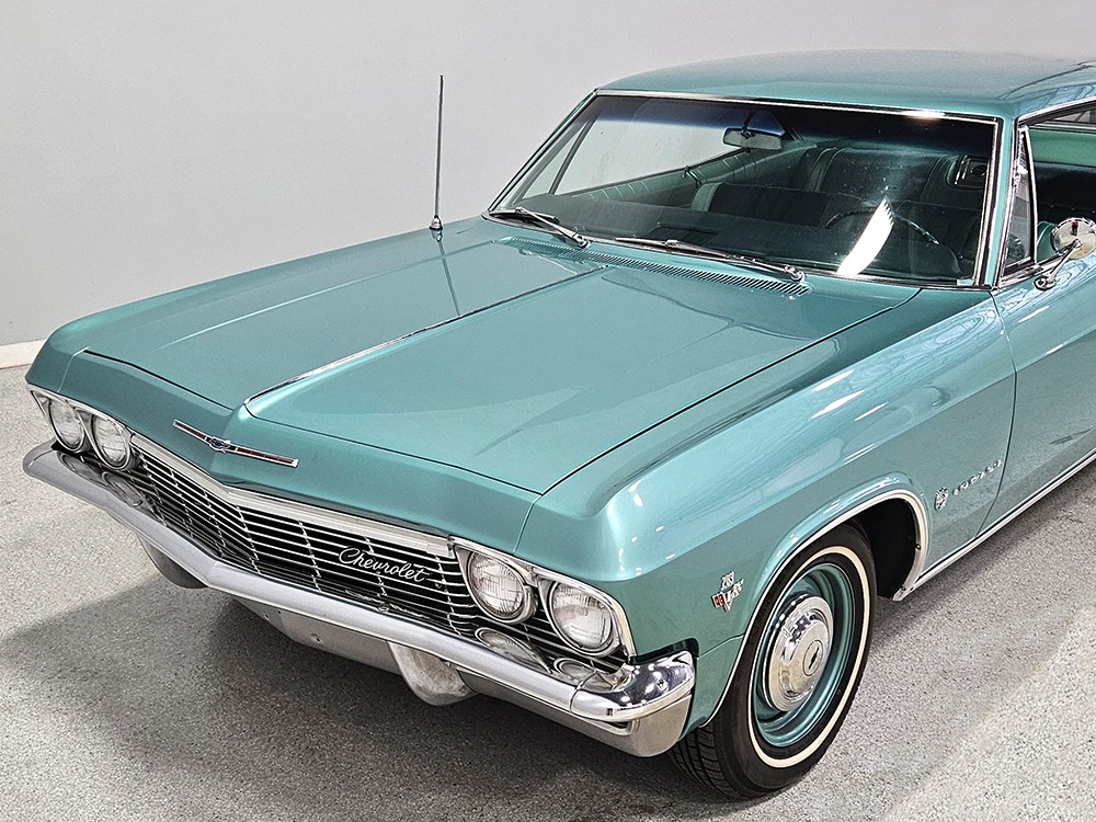 If you’re a price guide shopper only concerned with the best deal, well, you can stop reading right here. This isn’t your car. But if you’re one of those guys who seeks quality above all else, then this car deserves a closer look. It was a body-off restoration by a gentleman who restores Porsches for a living and he did this car for himself, so the quality is tangible everywhere you look. Code K Artesian Turquoise is the car’s original color and it just looks amazing on the all-new 1965 Impala sheetmetal. It’s clean and modern and sleek while still looking suitably vintage for the mid-60s. Bodywork is outstanding with even gaps, proper panel alignment, and laser-straight sheetmetal that only comes from investing a lot of time and effort. There’s really no place for sub-standard work to hide with that crease that runs from nose to tail and with those massive quarter panels, you’d better get it right if you want it to look good. Thanks to modern urethane paint, the shine is miles deep and will look this good practically forever with a modicum of care, and there’s just the right amount of metallic in the finish to make it glow in the sunlight. You’ll note that all the stainless trim was polished like chrome, the chrome was refinished or replaced, and all the emblems are crisply rendered as original. Most of the glass is original and in great shape with no issues and all the weather seals are new. You can see that they were sweating the details when this car went together.