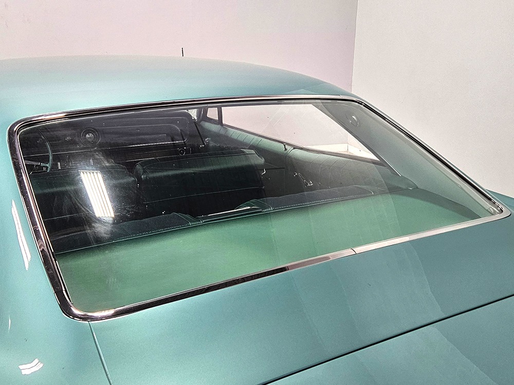 The lovely turquoise fabric and vinyl interior is really the highlight of the entire car. They somehow replicated that funky brocade upholstery, which is almost impossible to resist touching, and it’s as comfortable inside as it looks. The big two-tone steering wheel frames the factory instruments, which cover the basics, and the sweeping dash features a restored dash pad and fresh woodgrain moldings. That’s a factory 4-speed on the floor, complete with cue ball knob, and an aftermarket A/C system was so neatly integrated into the dash that it almost looks OEM. New seat belts, rubber floor mats, and correct turquoise and black speckled carpets make it welcoming, befitting the top-of-the-line Chevrolet. A digital AM/FM radio fits neatly in the original spot, almost blending in to look factory-correct, and there’s a beautifully fitted headliner overhead. Again, the attention to detail really sets this car apart. Of course, there’s a massive trunk out back which include a reproduction mat, matching full-sized spare tire assembly, and a jack.