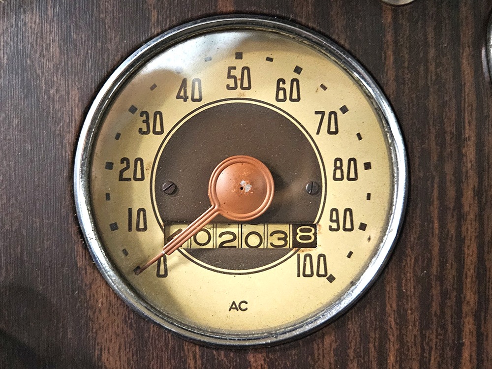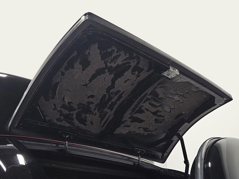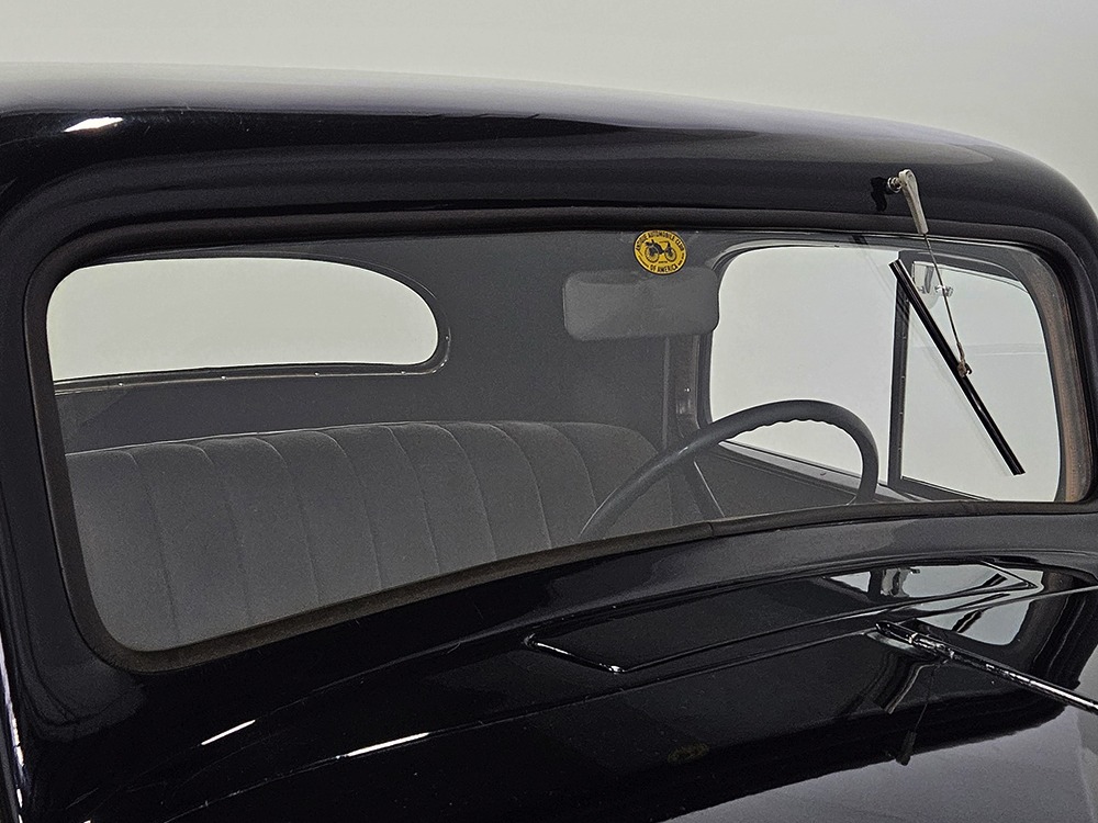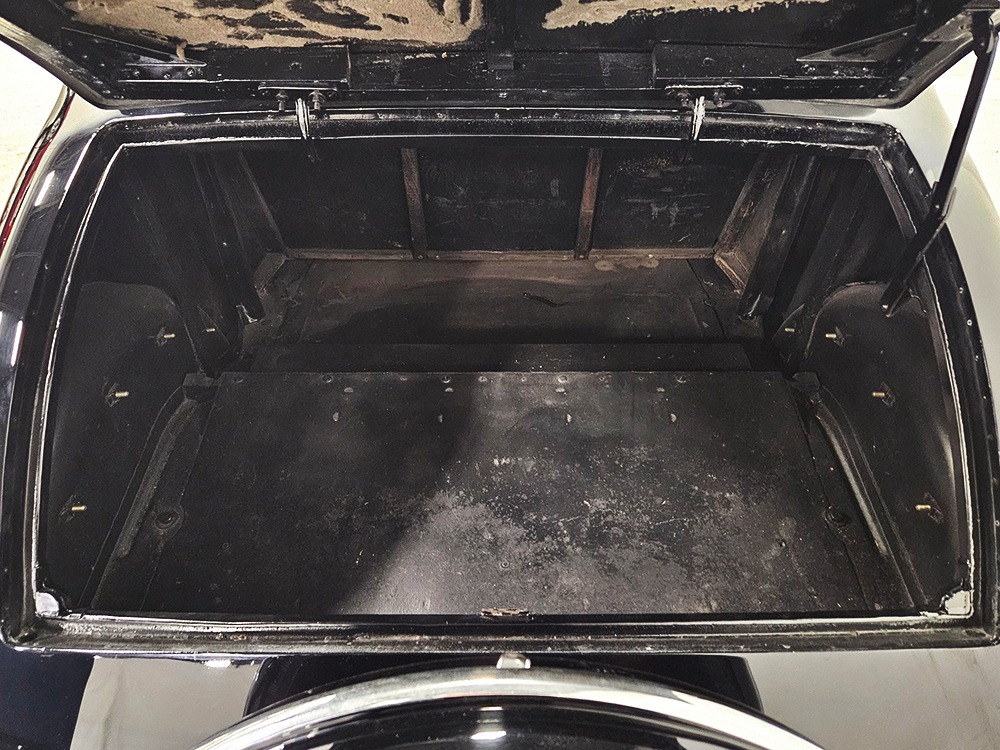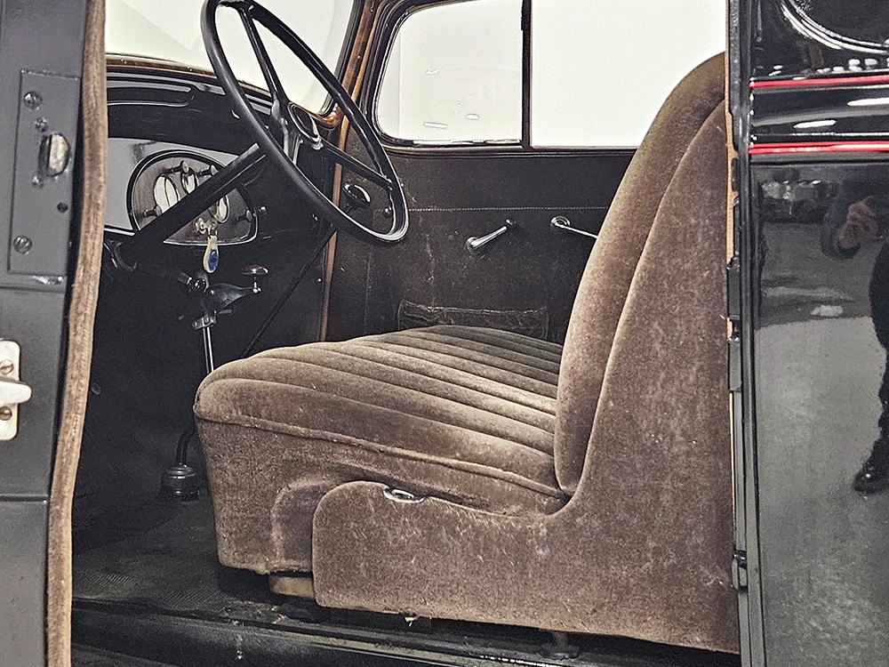 We believe the brown mohair interior is completely original, including seats, door panels, and headliner. Even the rubber mat appears to be 90 years old and in remarkable shape. The wide bench seat remains comfortable and supportive with only minor wear on the driver’s side, and it’s important to note that the camera’s flash actually makes it look worse than it is—the interior looks better in person, not worse. The big steering wheel makes this slick little coupe easy to handle and for 1935, all the gauges were set into a woodgrained panel in the center of the dash. All the gauges work properly and the rest of the controls are very simple: knobs for the headlights choke, and hand throttle, a cowl vent lever, and, well, that’s about it. There’s plenty of space in the 3-window coupe body and the seat adjusts to suit just about any driver. The massive trunk will carry all the gear you need for touring and shows no issues with rust or rot.