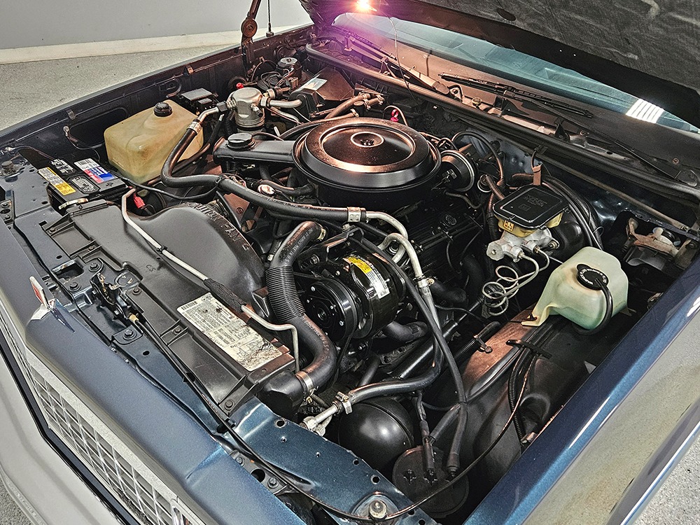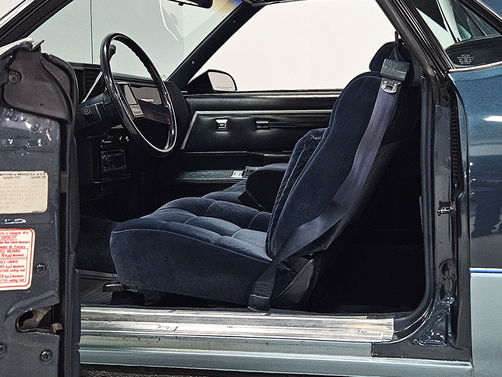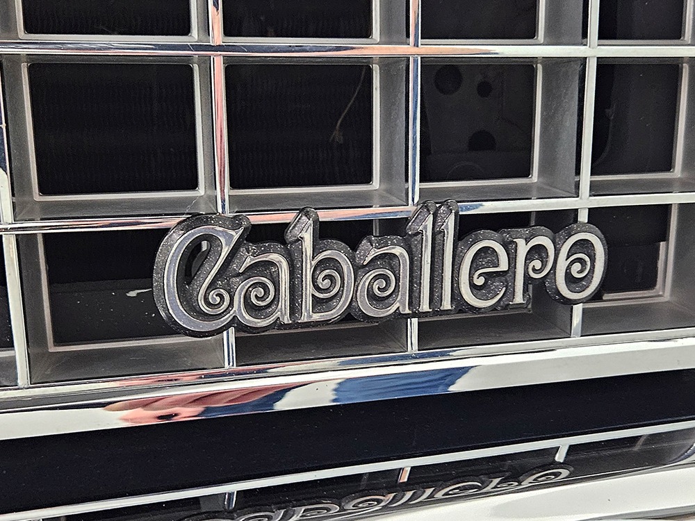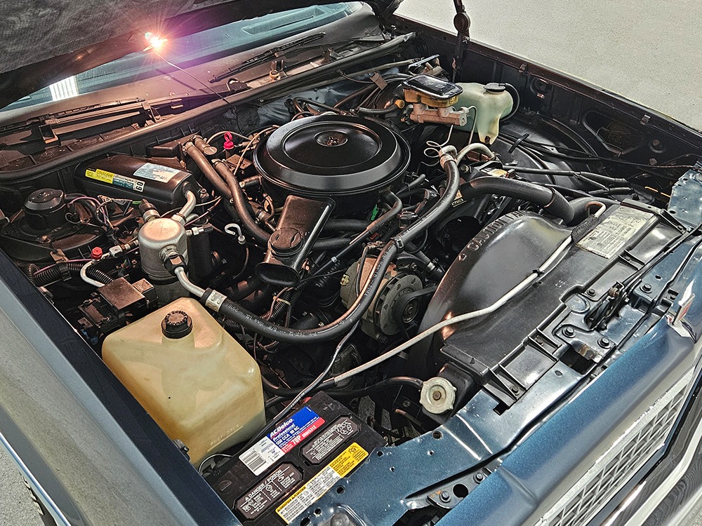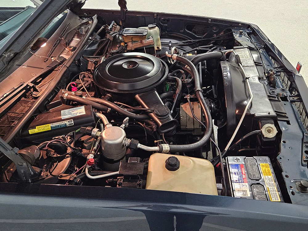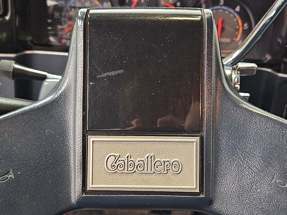 The dark blue interior is mostly original and in equally nice condition. We believe the carpets may have been replaced, but the seats, door panels, and dash pad are factory original and in amazing condition. Even the crack-prone steering wheel is 100% intact. A full set of gauges, including a tachometer, monitors the engine, with other options including cold factory A/C, power windows and locks, cruise control, remote mirrors, and a tilt steering column. The original Delco radio is gone, replaced by a Pioneer AM/FM/CD head unit that’s probably a nice improvement over stock, but that appears to be the lone modification. The seats are still plush and comfortable, the headliner isn’t sagging (a common problem) and the factory spare is still stashed behind the passenger’s seat. Heavy-duty rubber floor mats protect the carpets and even the little plastic brackets that hold the seat belts to the seat backs aren’t cracked and broken. Someone really loved this Caballero!