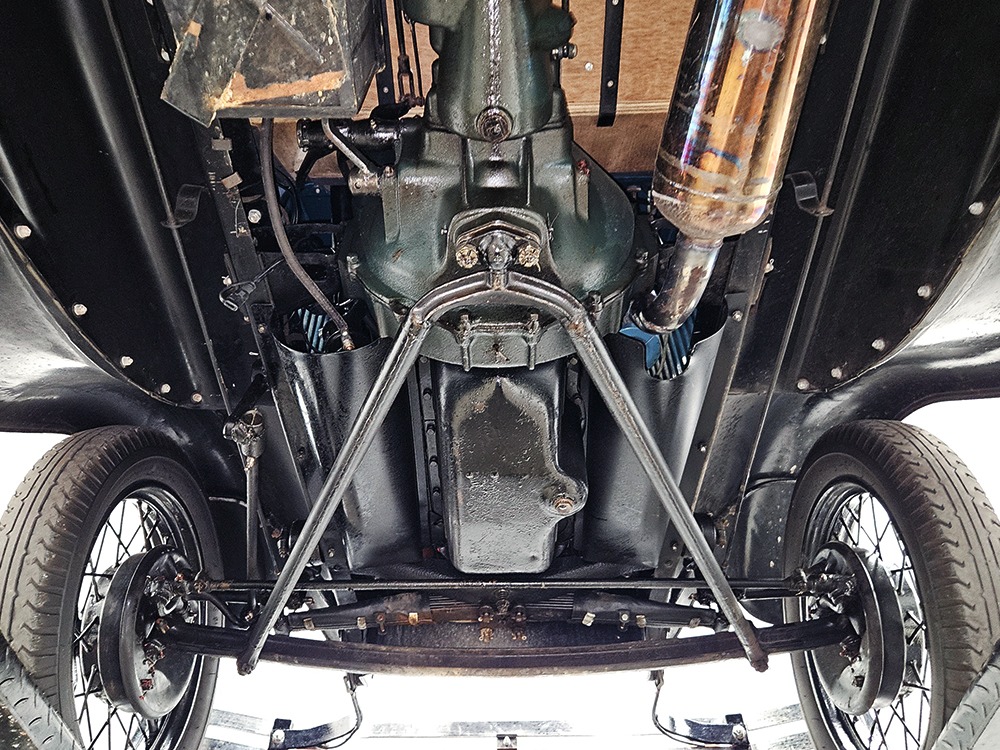The spacious tudor is the car to own if you’re a taller driver—it features movable bucket seats up front and a good-sized back seat for passengers. Gray cloth upholstery looks right and with contrasting light gray piping, it looks upscale rather than pedestrian as you’d expect. Matching broadcloth door panels are neatly tailored and feature bright hardware that feels expensive. The big steering wheel makes it easy to handle the Model A at any speed, and the controls are easy to master—pedals are arranged in the traditional fashion, the 3-speed manual transmission shifts cleanly with a quick double-clutch, and you’ll quickly figure out the spark and throttle levers on the steering column. Of note, this car still carries an original “pop-out” ignition switch, which is getting to be a rare find, and a power point with USB ports has been added for your GPS and phone on tour. The rest of the gauges are simple, and I guess they should include the Moto-Meter out there on top of the radiator. Rubber floors in front were how these cars were originally built, but the back seat passengers get carpets and window shades—more upscale features that you wouldn’t expect in the entry-level Model A. Seat belts were added for touring safety and even the headliner is beautifully fitted. This was not an inexpensive interior job.