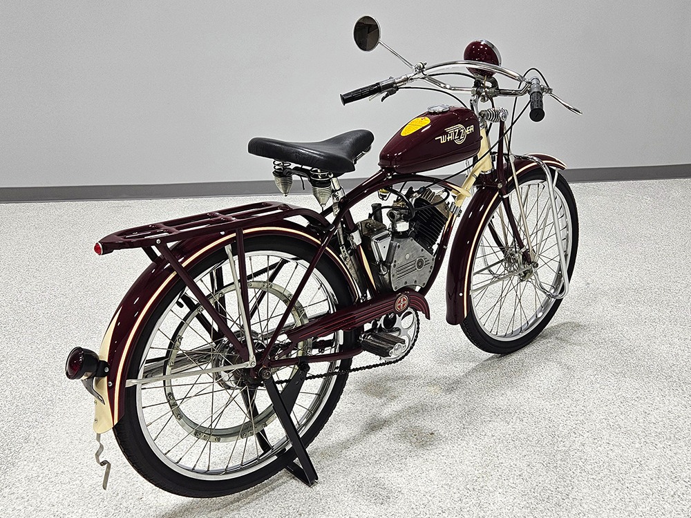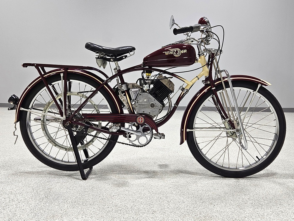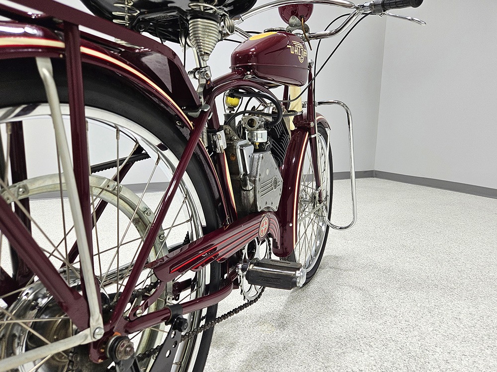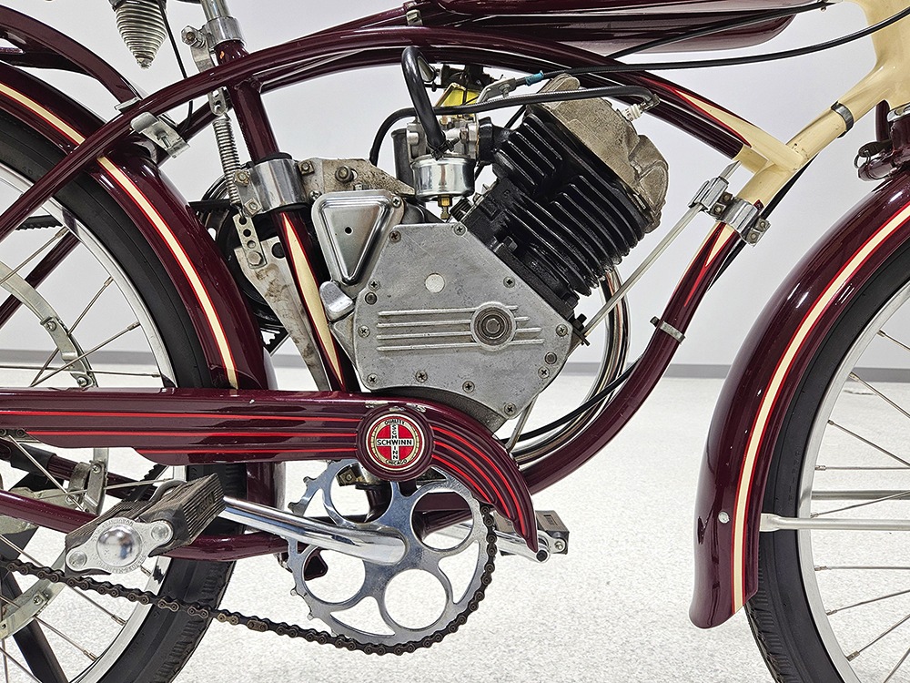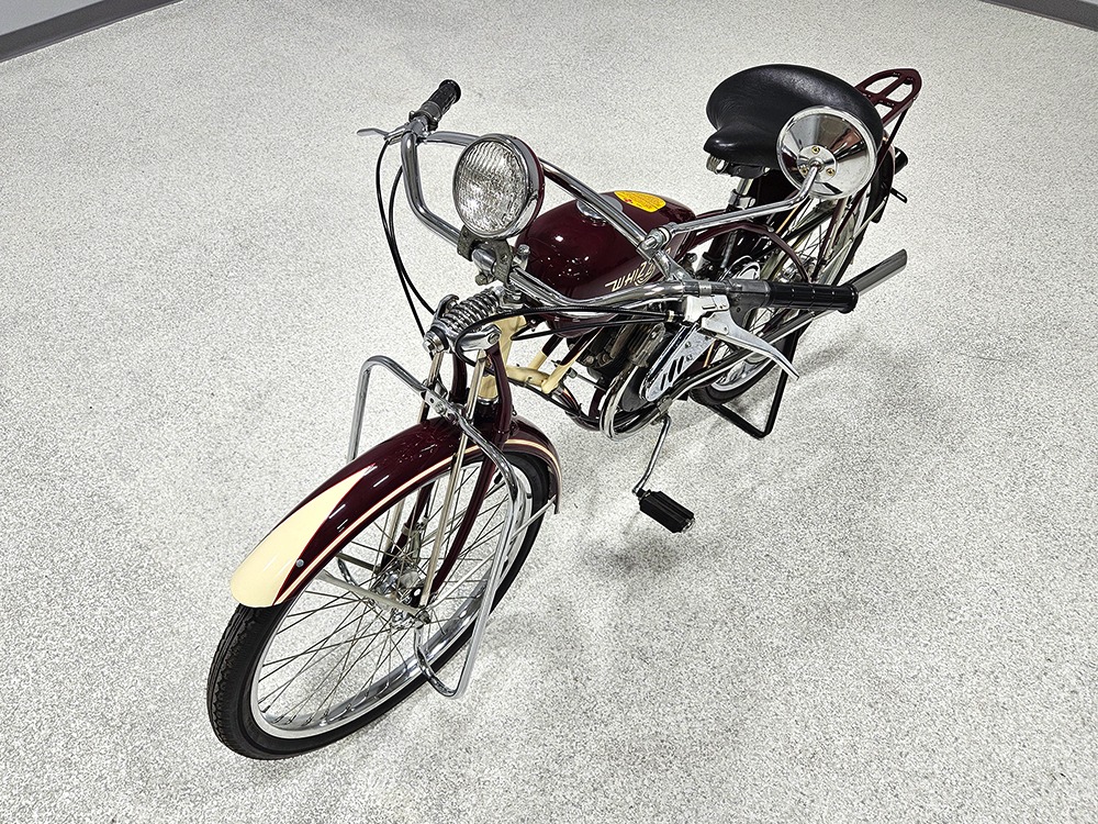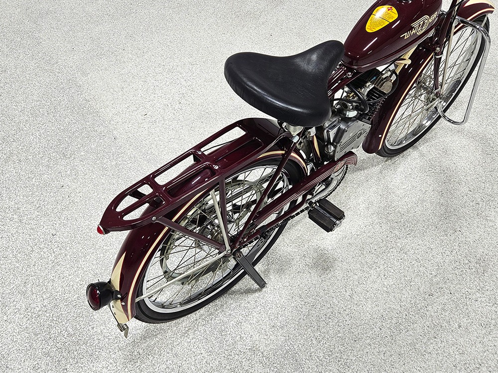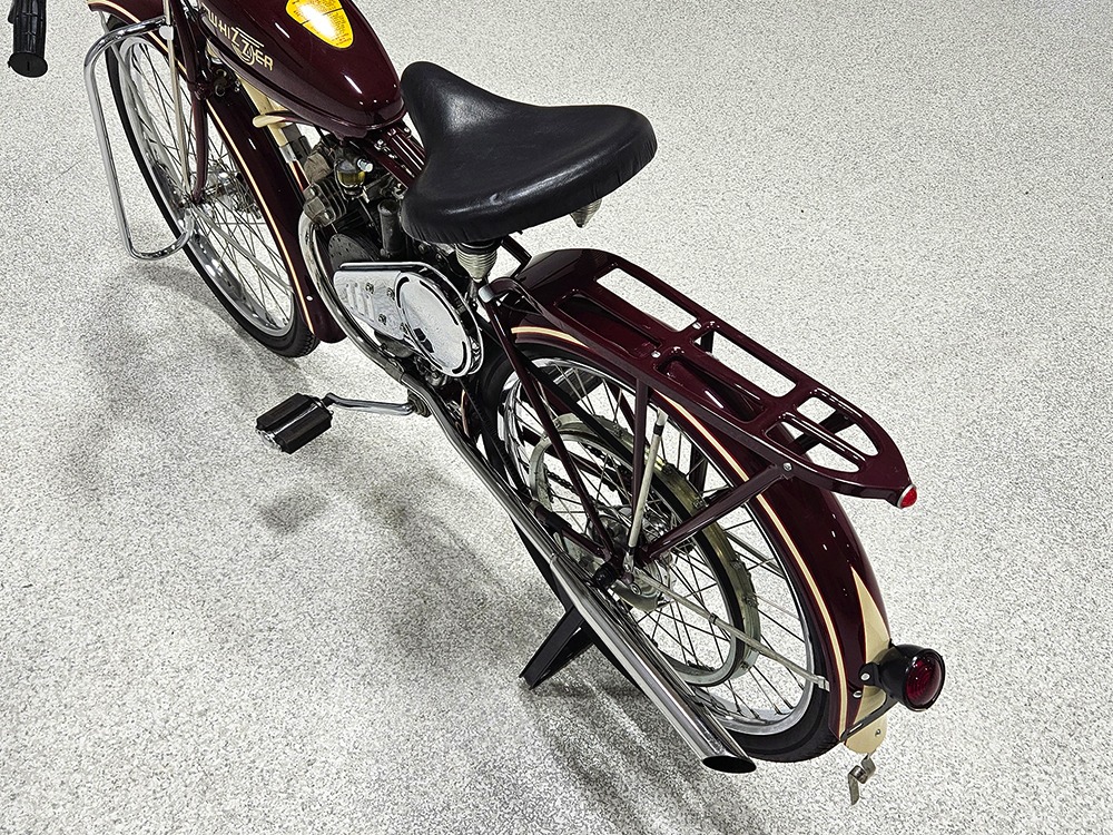 Restored by Memory Cycles in Toledo, OH Correct 138cc single cylinder. Schwinn bicycle with Whizzer motor kit installed. Very nice restoration, runs and rides properly. Headlight present but not hooked up, everything else is as it should be. Accessory rack, mirror, and front fork guards. Very pretty.