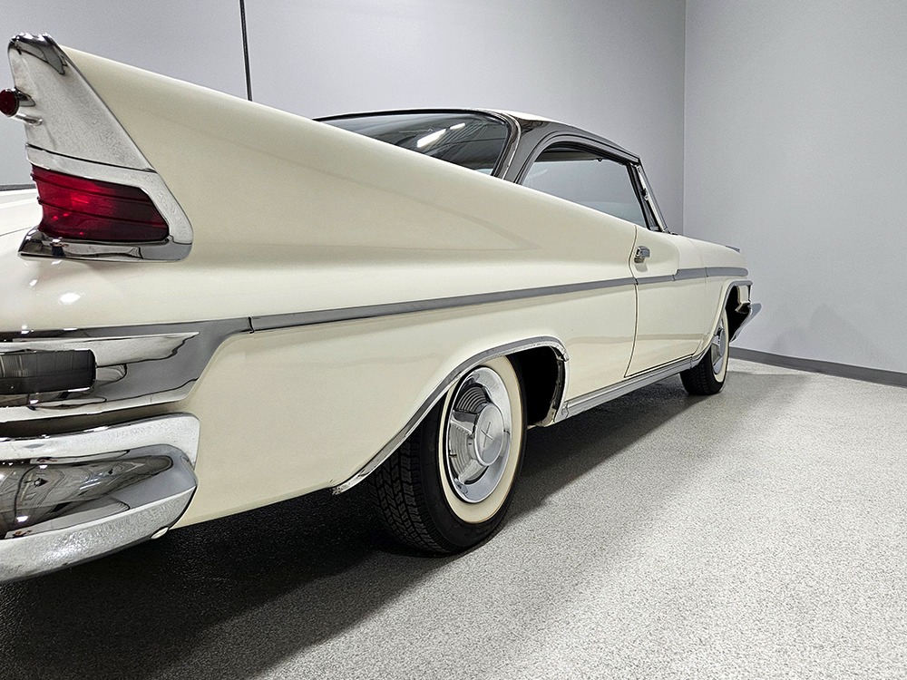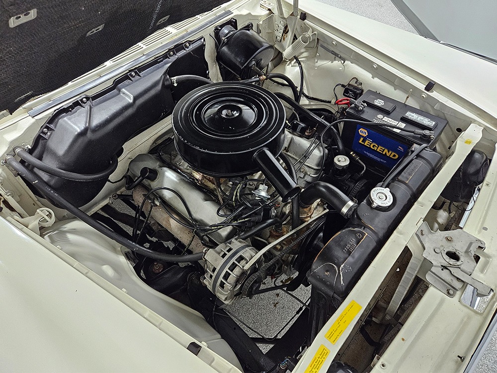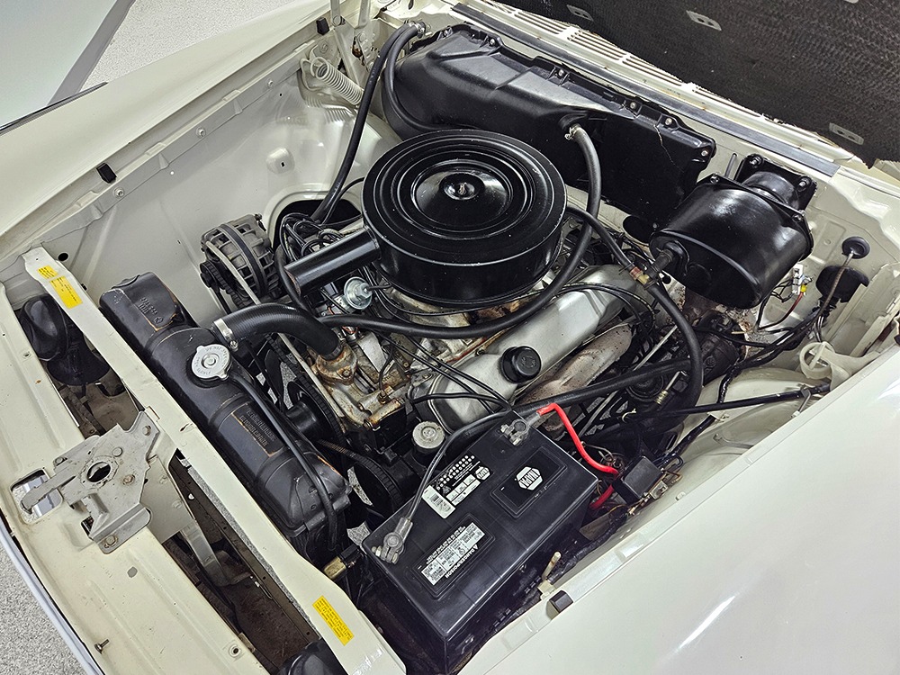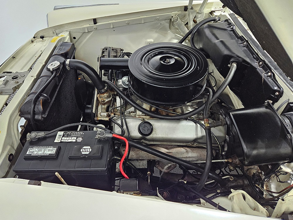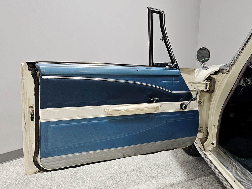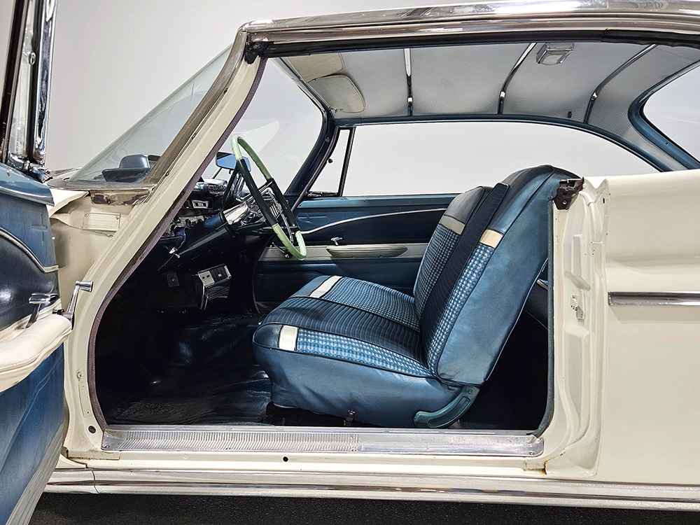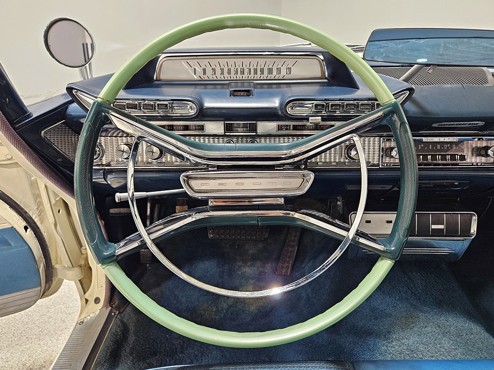 The Desoto guys must have known the end was coming because they didn’t even bother naming the cars in 1961. It was simply “Desoto hardtop” and “Desoto sedan.” Production ended early, with only 911 of these handsome 2-door hardtop coupes being built. Styling kept a lot of Virgil Exner’s brilliant lines, adding some trim to differentiate the ’61s from the ‘60s, but make no mistake, this big coupe looks dramatic anywhere it goes. This is a mostly original car with one older repaint in Glacier White, which is the factory color. The paint job is holding up rather well, with a soft shine that could almost pass for original enamel. There’s straight bodywork underneath with good panel alignment and doors that snick shut easily, a hallmark of Mopars from this period. And, of course, chrome and stainless trim is a big deal on this car, with most of the brightwork being very good to excellent—only the rear bumper shows some flaking chrome. Twin antennas on the fins is a cool touch, and we’re pretty sure you won’t see another 1961 Desoto anywhere you go. This is a cool car.