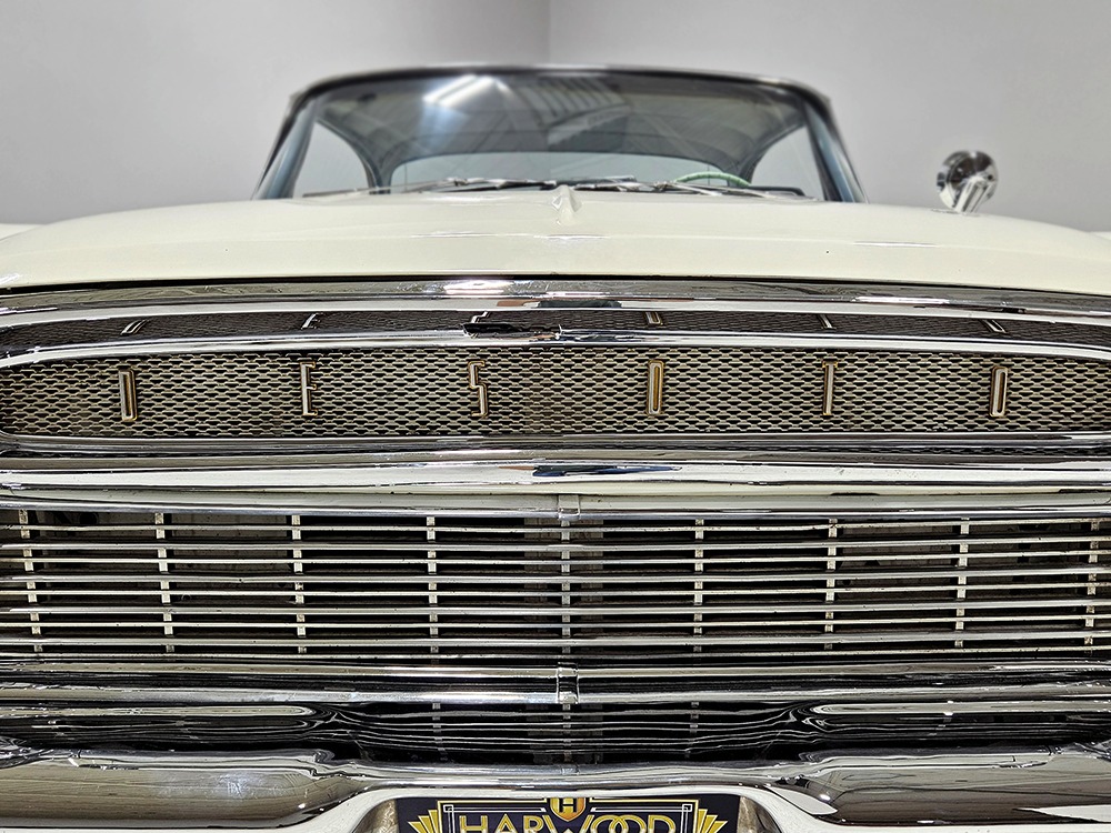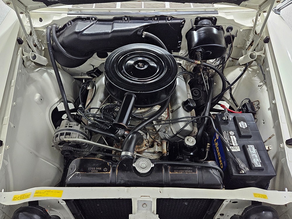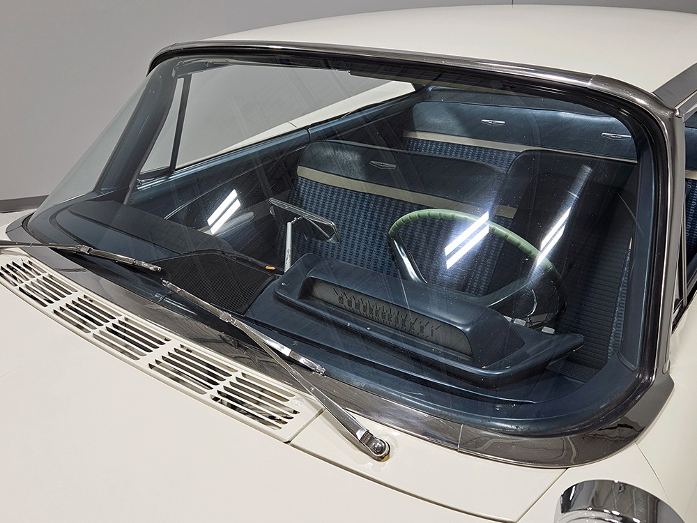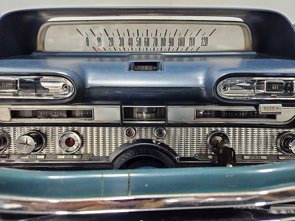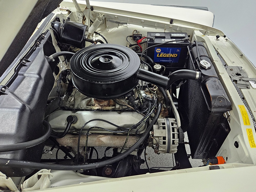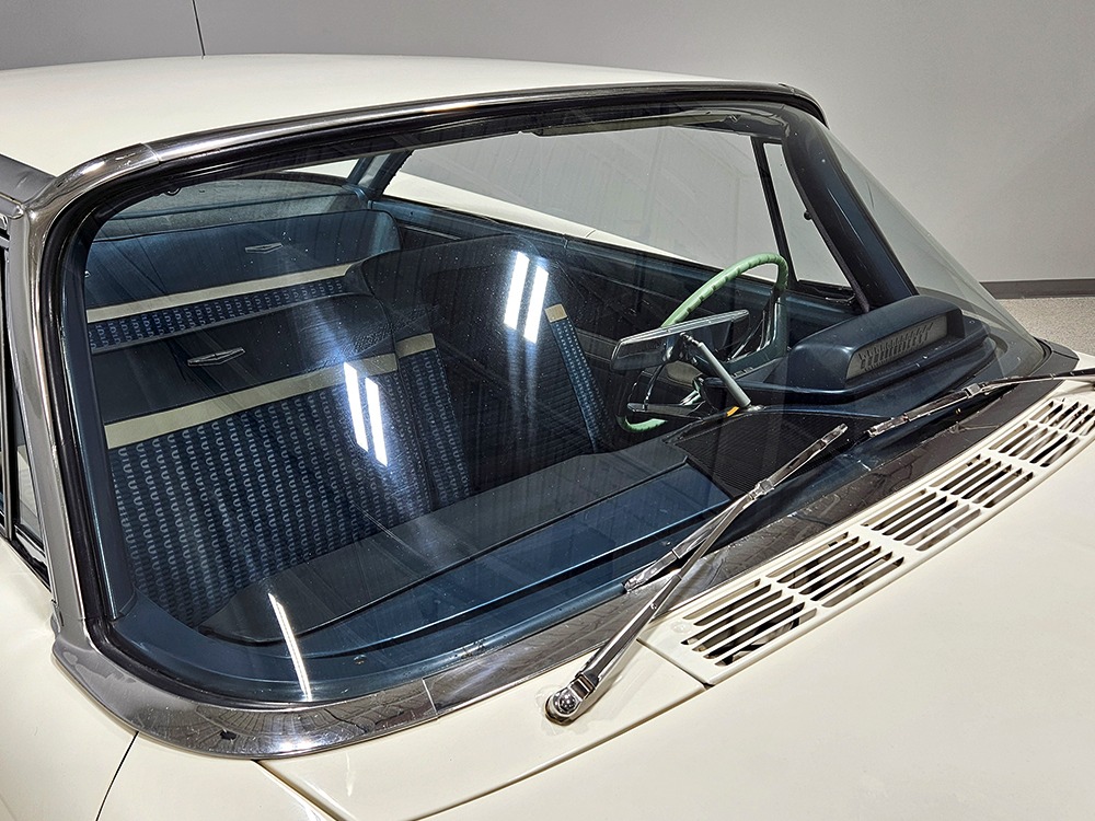 The Desoto guys must have known the end was coming because they didn’t even bother naming the cars in 1961. It was simply “Desoto hardtop” and “Desoto sedan.” Production ended early, with only 911 of these handsome 2-door hardtop coupes being built. Styling kept a lot of Virgil Exner’s brilliant lines, adding some trim to differentiate the ’61s from the ‘60s, but make no mistake, this big coupe looks dramatic anywhere it goes. This is a mostly original car with one older repaint in Glacier White, which is the factory color. The paint job is holding up rather well, with a soft shine that could almost pass for original enamel. There’s straight bodywork underneath with good panel alignment and doors that snick shut easily, a hallmark of Mopars from this period. And, of course, chrome and stainless trim is a big deal on this car, with most of the brightwork being very good to excellent—only the rear bumper shows some flaking chrome. Twin antennas on the fins is a cool touch, and we’re pretty sure you won’t see another 1961 Desoto anywhere you go. This is a cool car.