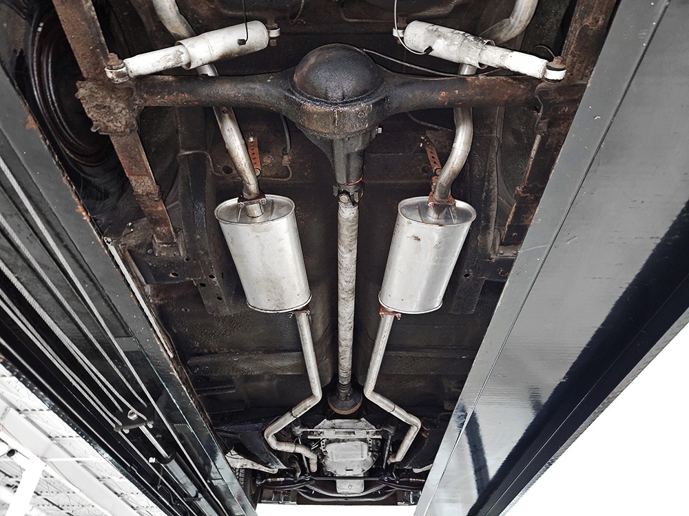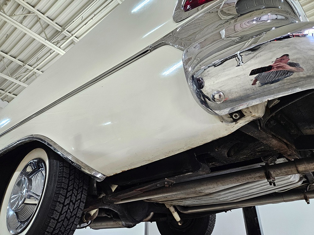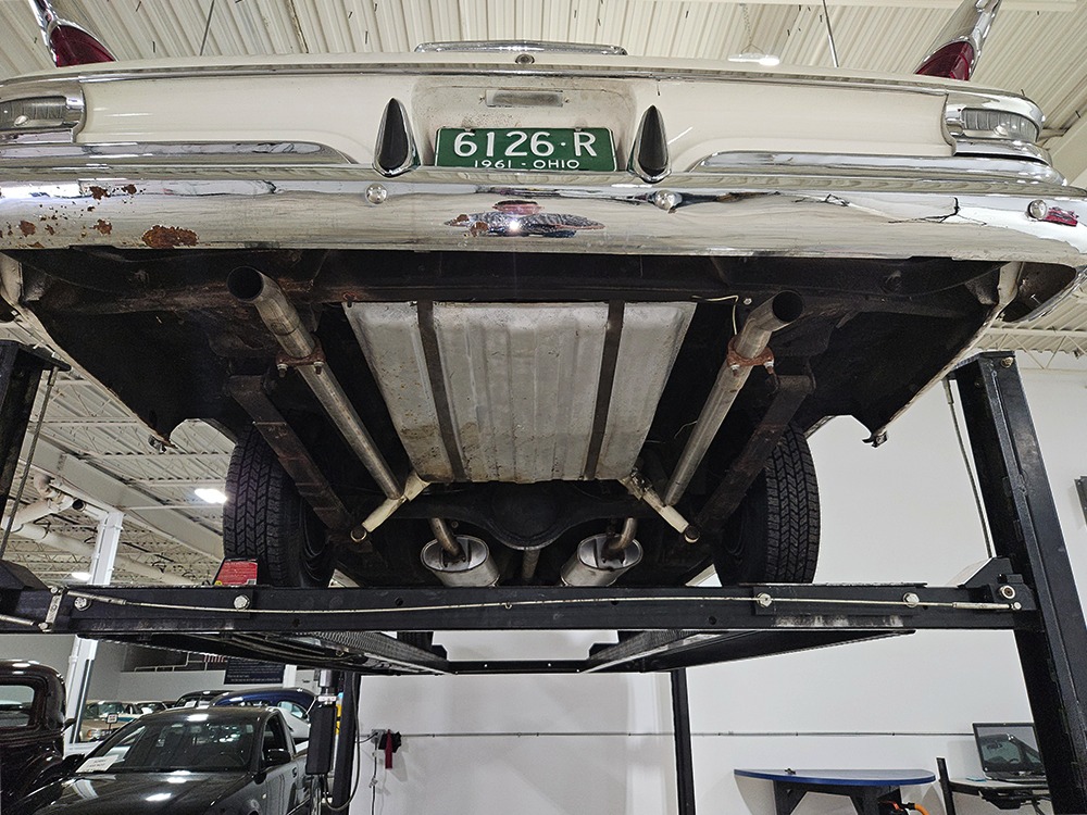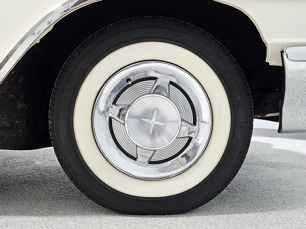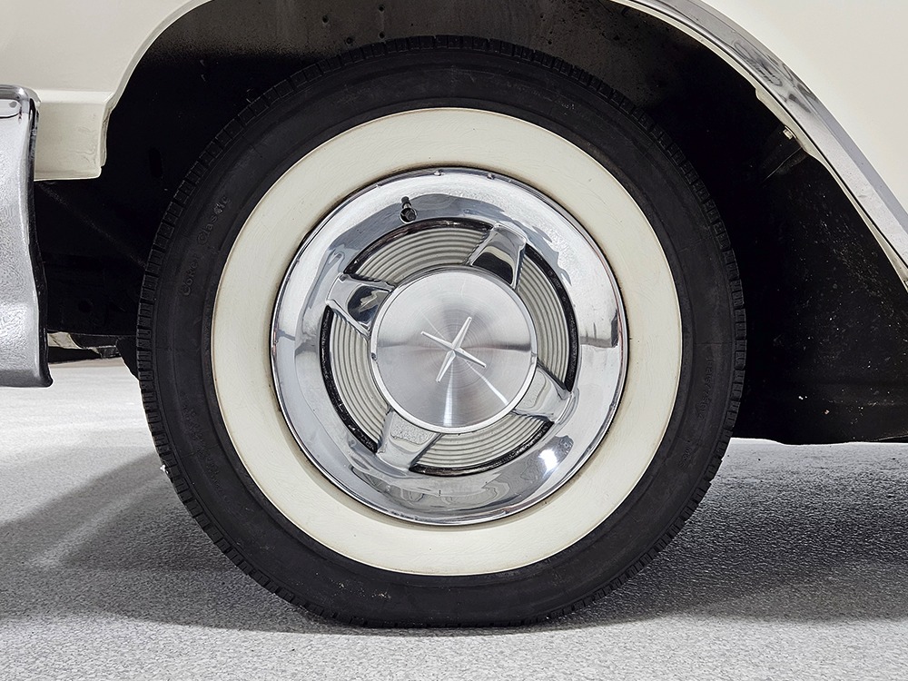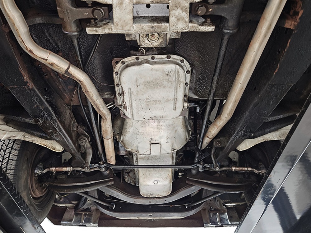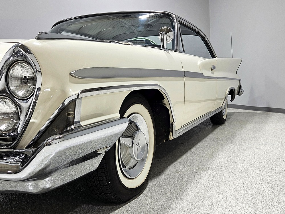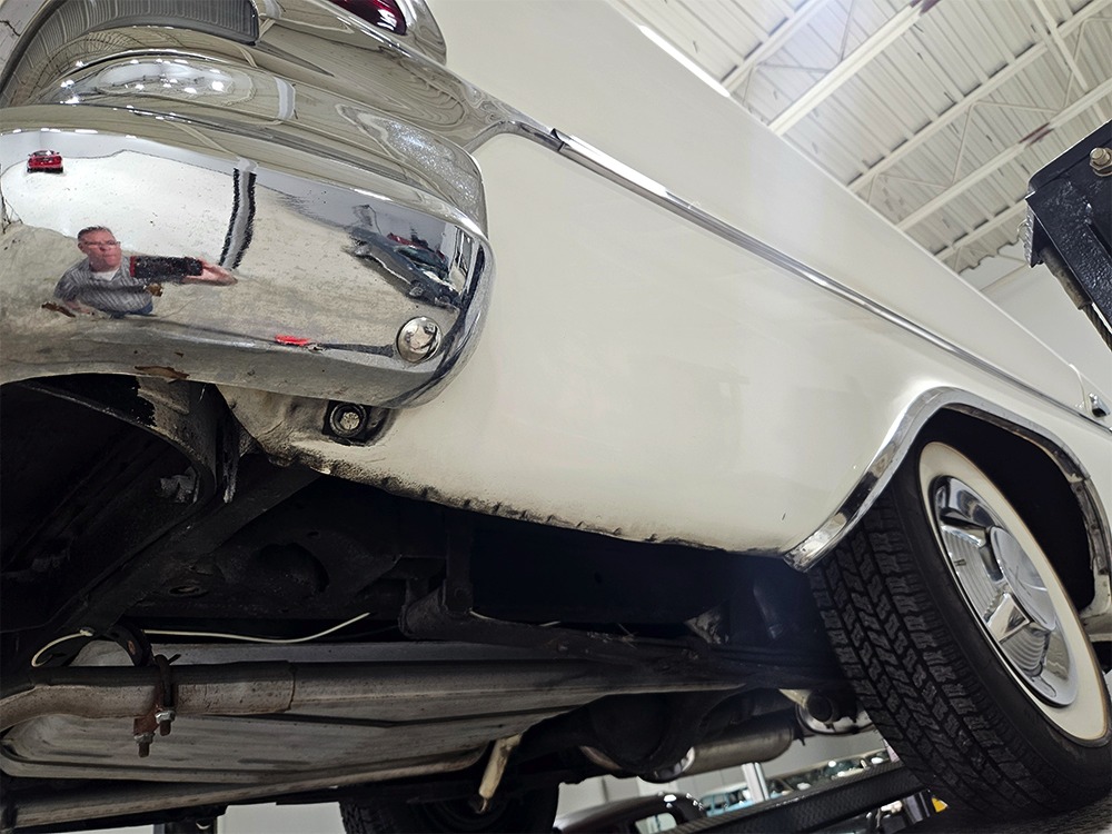 The Desoto is powered by a 361 cubic inch V8 making 265 horsepower and a rather stout 370 lb-ft. of torque, making this massive car feel surprisingly swift in today’s traffic. It starts easily, idles so smooth you almost can’t feel it, and pulls well at almost any speed. It’s quiet and unobtrusive thanks to a stock-style exhaust system, and the engine bay itself is nicely detailed with factory finishes and equipment. The engine block itself is silver, there’s a massive air cleaner up top, and plenty of room for easy service access, which is always nice. You’ll note that there’s an alternator instead of a generator, an innovation that Chrysler embraced long before the other big names. The TorqueFlite 3-speed automatic offers smooth shifts and with the 361 V8 pulling it around, this car feels lighter than it is. We believe there are 3.23 gears out back, helping with its effortless feel, and thanks to that torsion bar front suspension, ride quality is excellent. Looking underneath, you’ll note that this massive Desoto is a unit-body car, and all the critical structural elements are completely solid, including the floors, rockers, and trunk pan. A newer dual exhaust system and gas tank make it ready-to-roll, and there are modern air shocks out back to help keep this big coupe on an even keel. Stopping power is good for its age, and the 14-inch wheels and factory hubcaps are wrapped in relatively recent 215/75/14 wide whitewall radials.