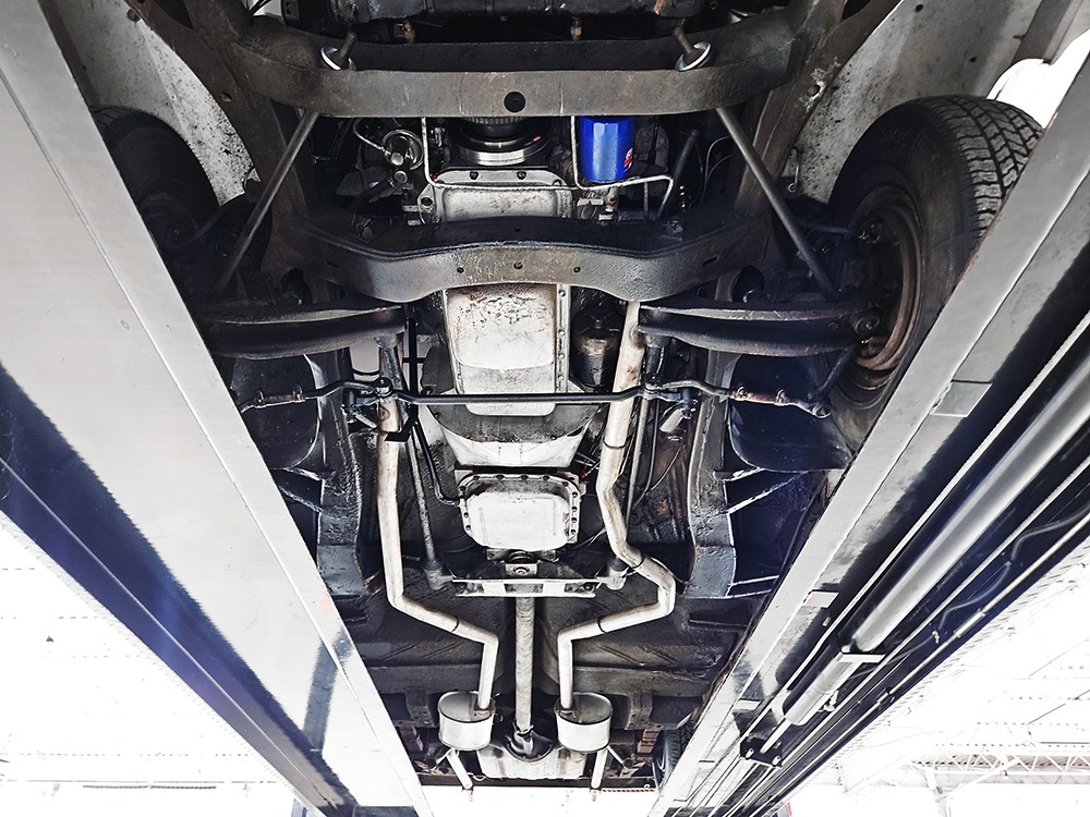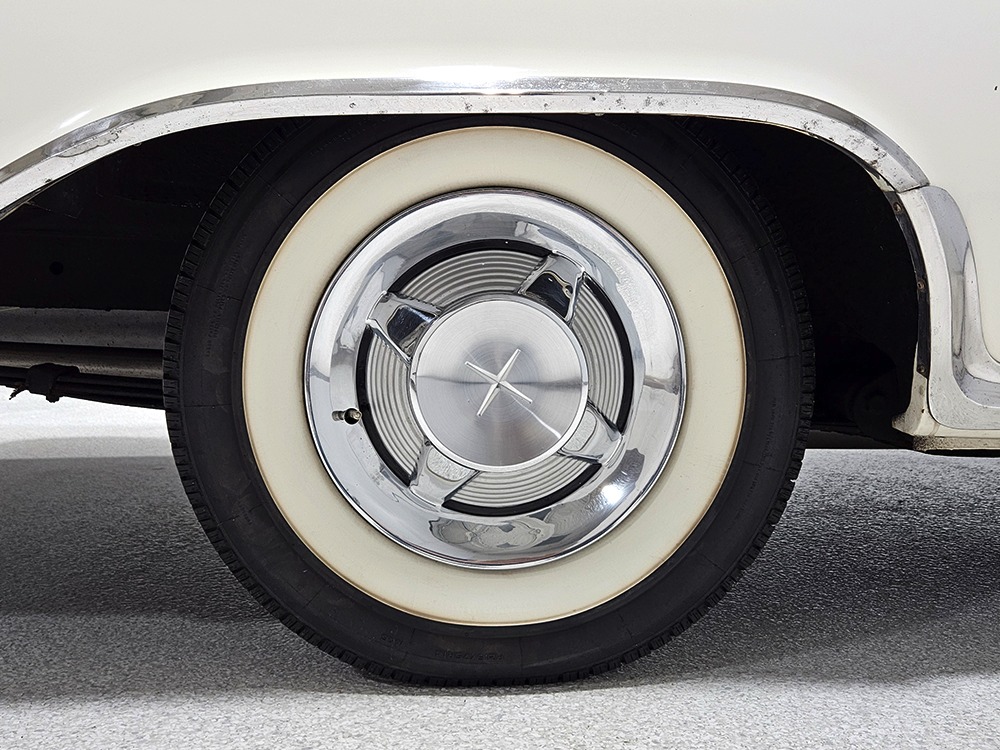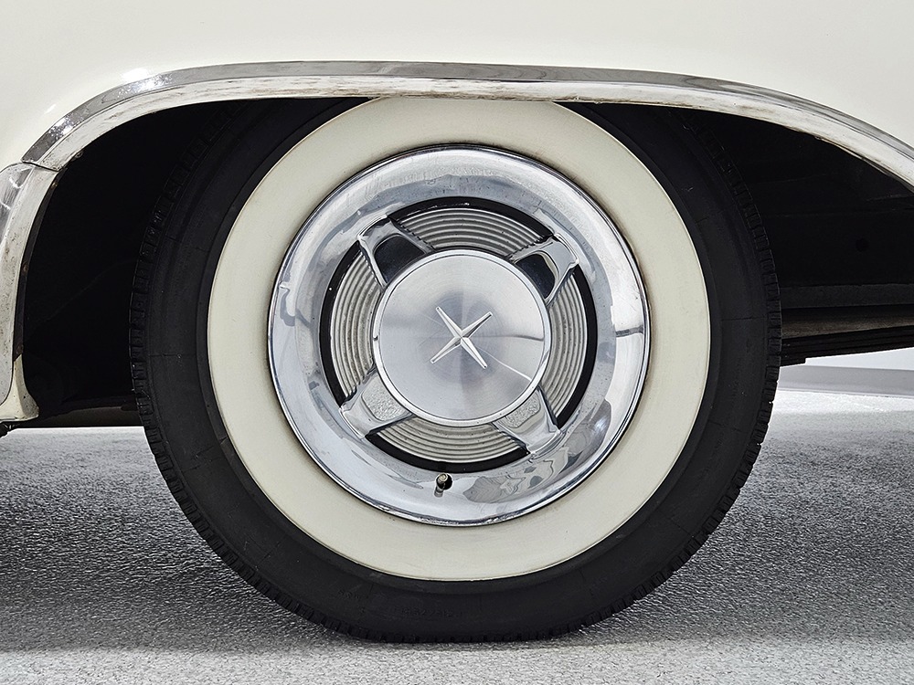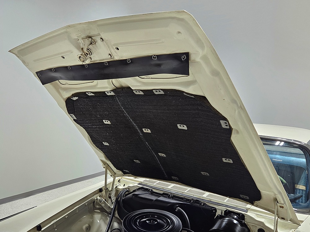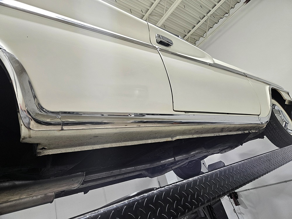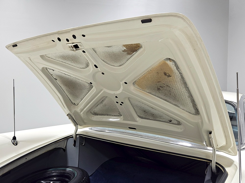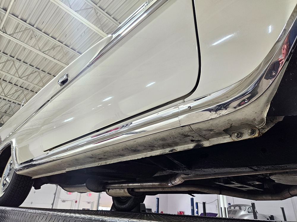 The Desoto is powered by a 361 cubic inch V8 making 265 horsepower and a rather stout 370 lb-ft. of torque, making this massive car feel surprisingly swift in today’s traffic. It starts easily, idles so smooth you almost can’t feel it, and pulls well at almost any speed. It’s quiet and unobtrusive thanks to a stock-style exhaust system, and the engine bay itself is nicely detailed with factory finishes and equipment. The engine block itself is silver, there’s a massive air cleaner up top, and plenty of room for easy service access, which is always nice. You’ll note that there’s an alternator instead of a generator, an innovation that Chrysler embraced long before the other big names. The TorqueFlite 3-speed automatic offers smooth shifts and with the 361 V8 pulling it around, this car feels lighter than it is. We believe there are 3.23 gears out back, helping with its effortless feel, and thanks to that torsion bar front suspension, ride quality is excellent. Looking underneath, you’ll note that this massive Desoto is a unit-body car, and all the critical structural elements are completely solid, including the floors, rockers, and trunk pan. A newer dual exhaust system and gas tank make it ready-to-roll, and there are modern air shocks out back to help keep this big coupe on an even keel. Stopping power is good for its age, and the 14-inch wheels and factory hubcaps are wrapped in relatively recent 215/75/14 wide whitewall radials.