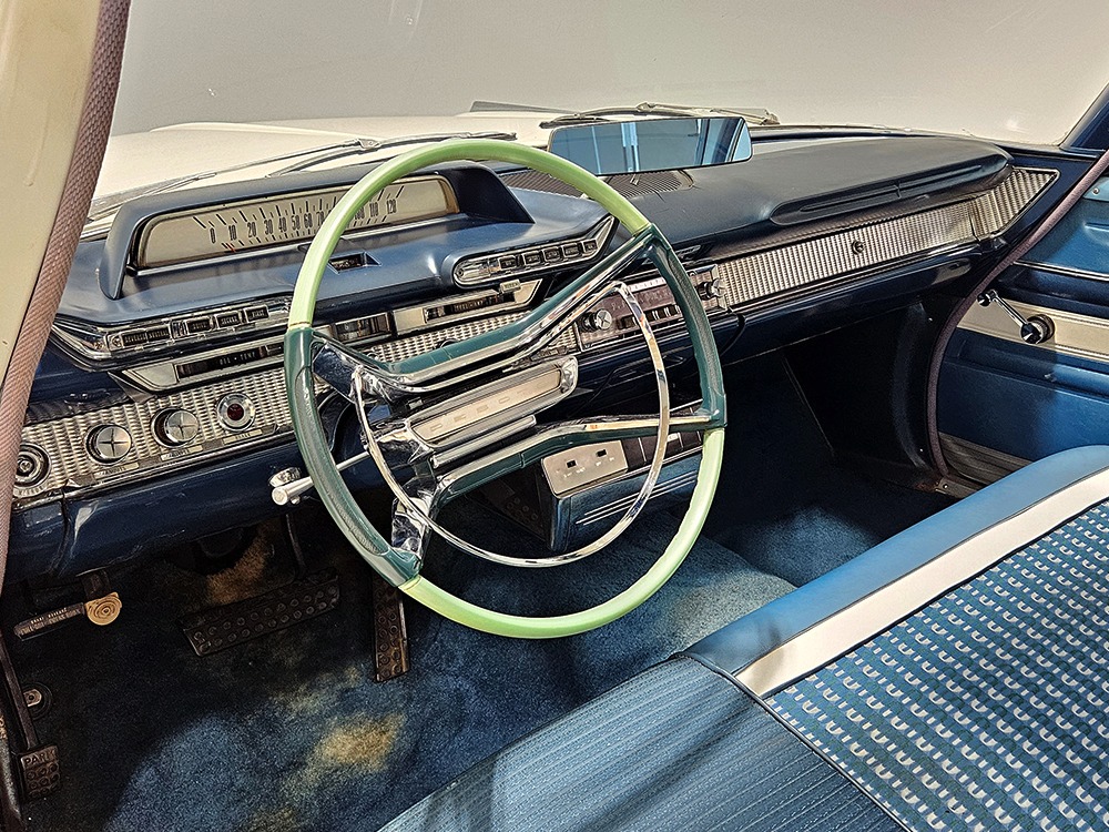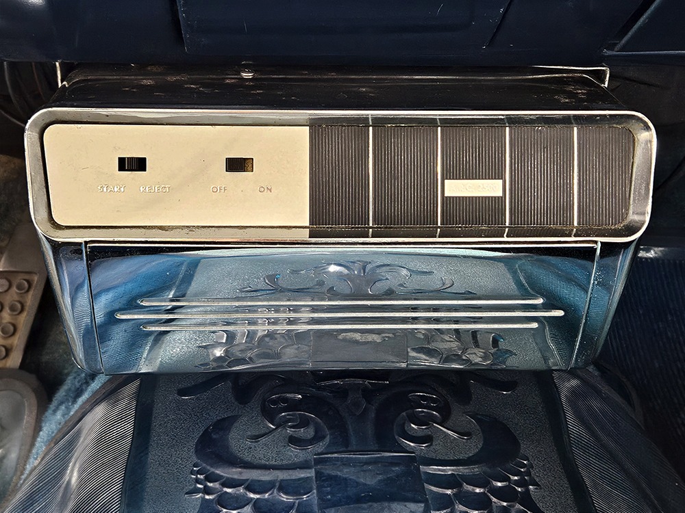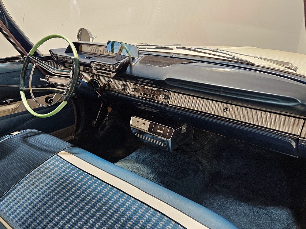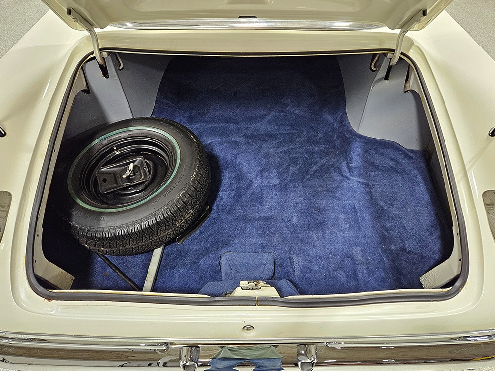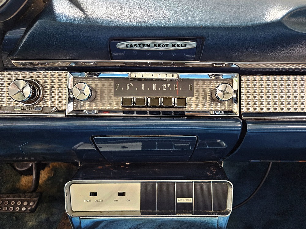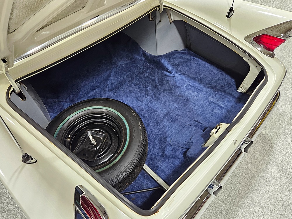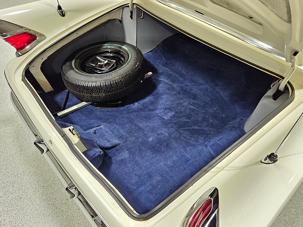 The blue cloth and vinyl interior is mostly original and in excellent condition, including the slick high-back driver’s seat that seems to highlight the captain’s chair as the most important. The space-age dash features pushbutton controls for both the transmission and the heater/defroster, and that complex steering wheel is just too cool. Aside from some minor staining on the carpets (which could easily be hidden with a floor mat), it remains in excellent condition throughout with no splits or rips in the upholstery. Even the door panels look great, echoing the shape of the fins outside. Other slick details include the dash-mounted rear-view mirror, the rotary-style clock (not functional but still pretty cool), and the band of textured bright trim that runs from end to end. The original AM radio remains in the dash (it powers up but does not tune stations) and is joined by an ultra-rare Highway Hi-Fi unit underneath (we have not tested it). The headliner features bright chrome bows and the back seat has plenty of spread-out room for adult-sized passengers. There’s also a massive trunk with correct cardboard bulkheads, matching blue carpets, and a full-sized spare with jack assembly.