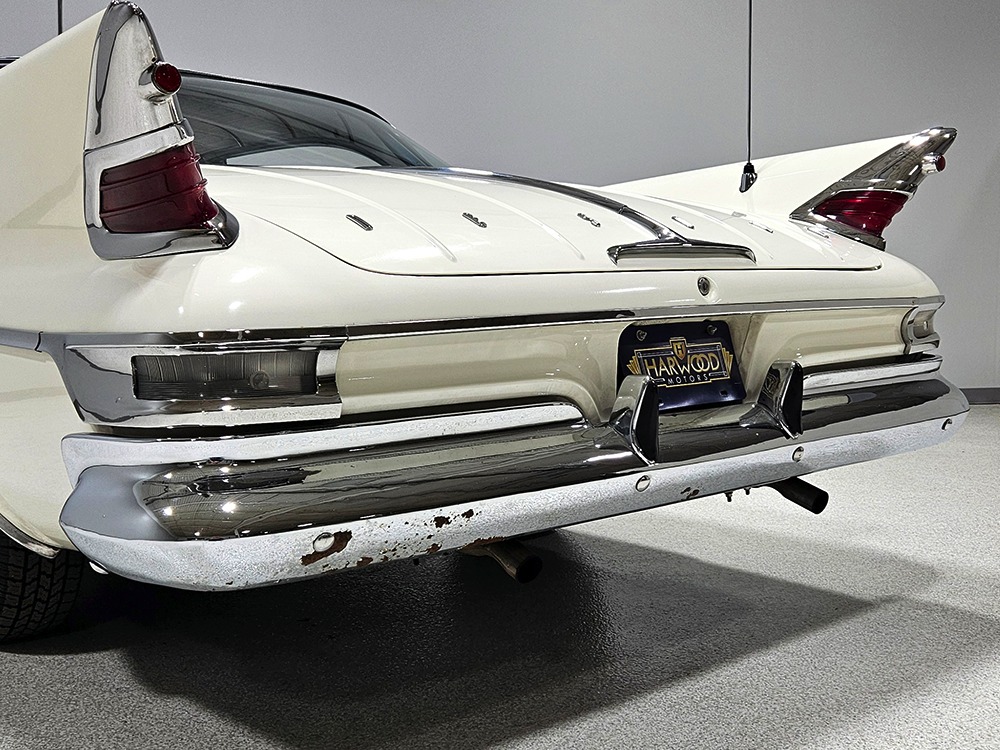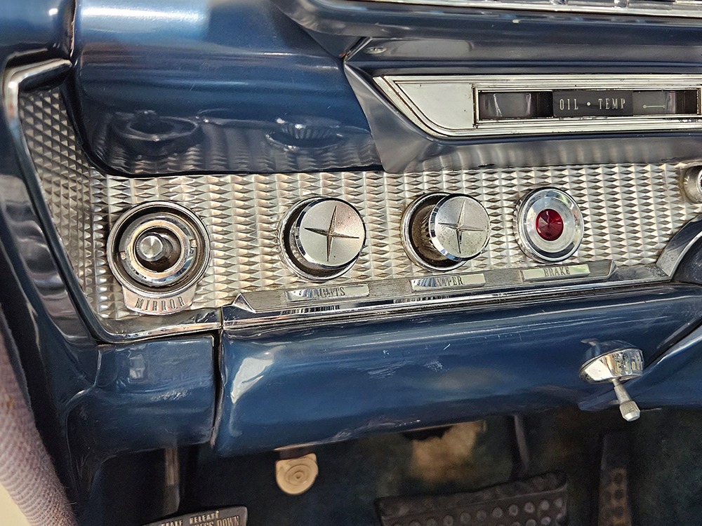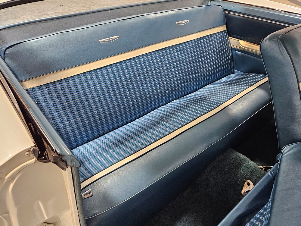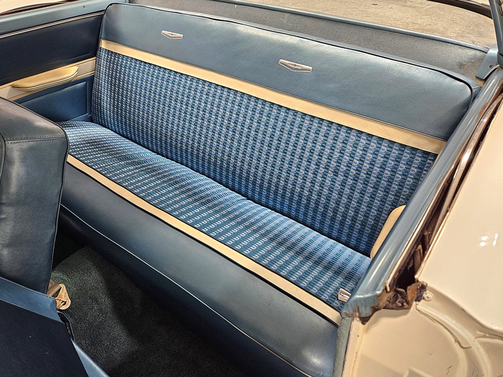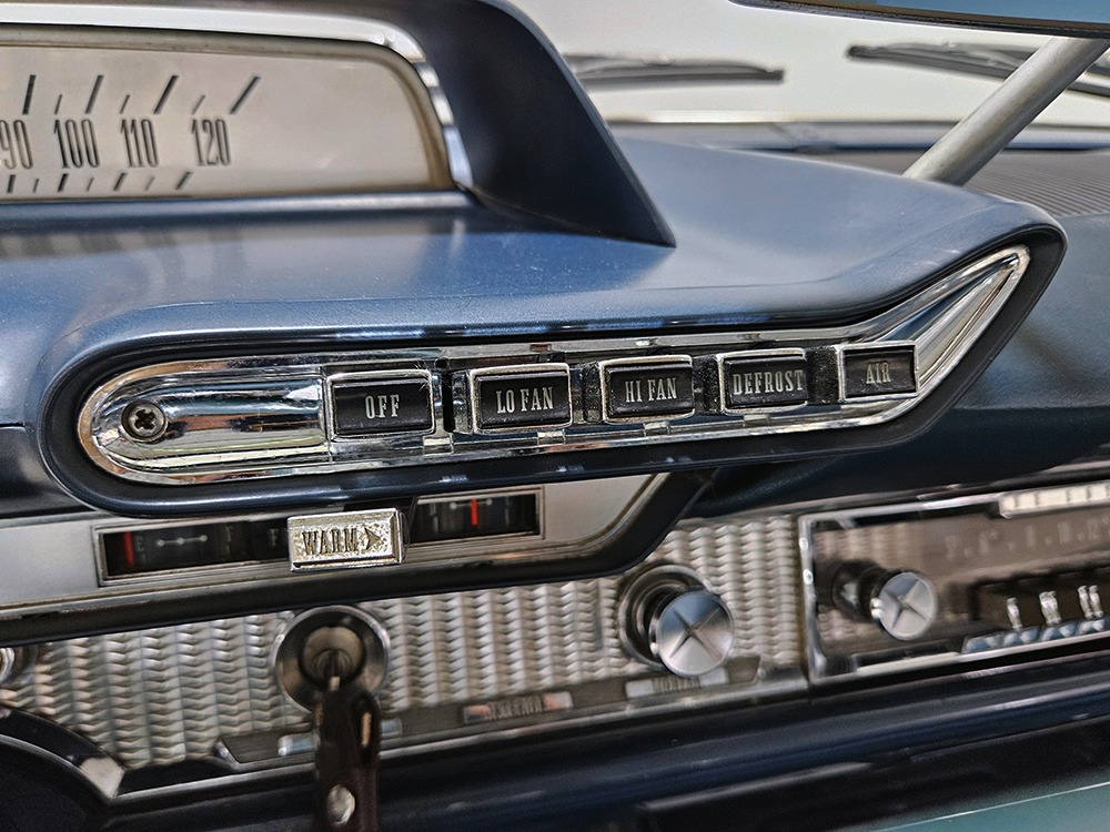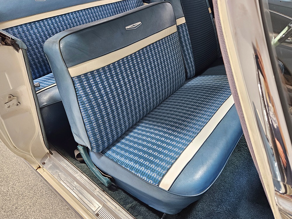 The blue cloth and vinyl interior is mostly original and in excellent condition, including the slick high-back driver’s seat that seems to highlight the captain’s chair as the most important. The space-age dash features pushbutton controls for both the transmission and the heater/defroster, and that complex steering wheel is just too cool. Aside from some minor staining on the carpets (which could easily be hidden with a floor mat), it remains in excellent condition throughout with no splits or rips in the upholstery. Even the door panels look great, echoing the shape of the fins outside. Other slick details include the dash-mounted rear-view mirror, the rotary-style clock (not functional but still pretty cool), and the band of textured bright trim that runs from end to end. The original AM radio remains in the dash (it powers up but does not tune stations) and is joined by an ultra-rare Highway Hi-Fi unit underneath (we have not tested it). The headliner features bright chrome bows and the back seat has plenty of spread-out room for adult-sized passengers. There’s also a massive trunk with correct cardboard bulkheads, matching blue carpets, and a full-sized spare with jack assembly.