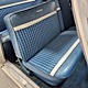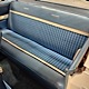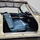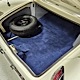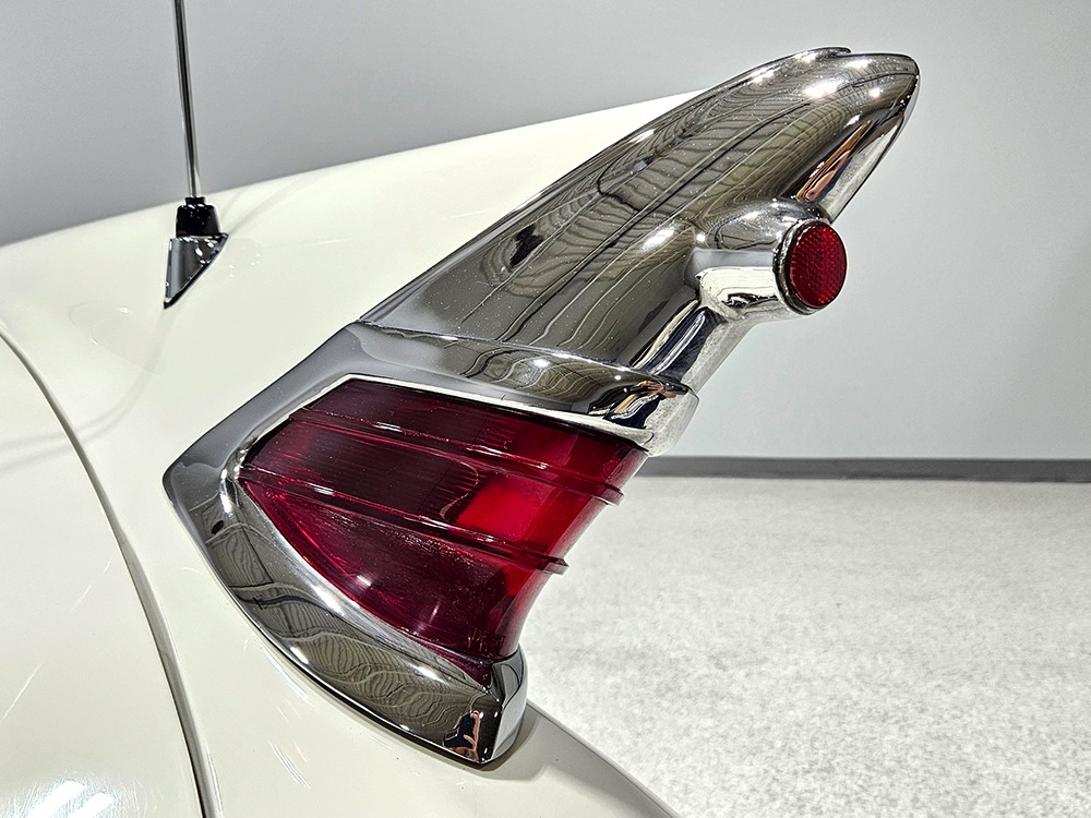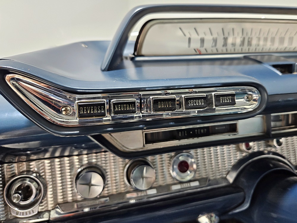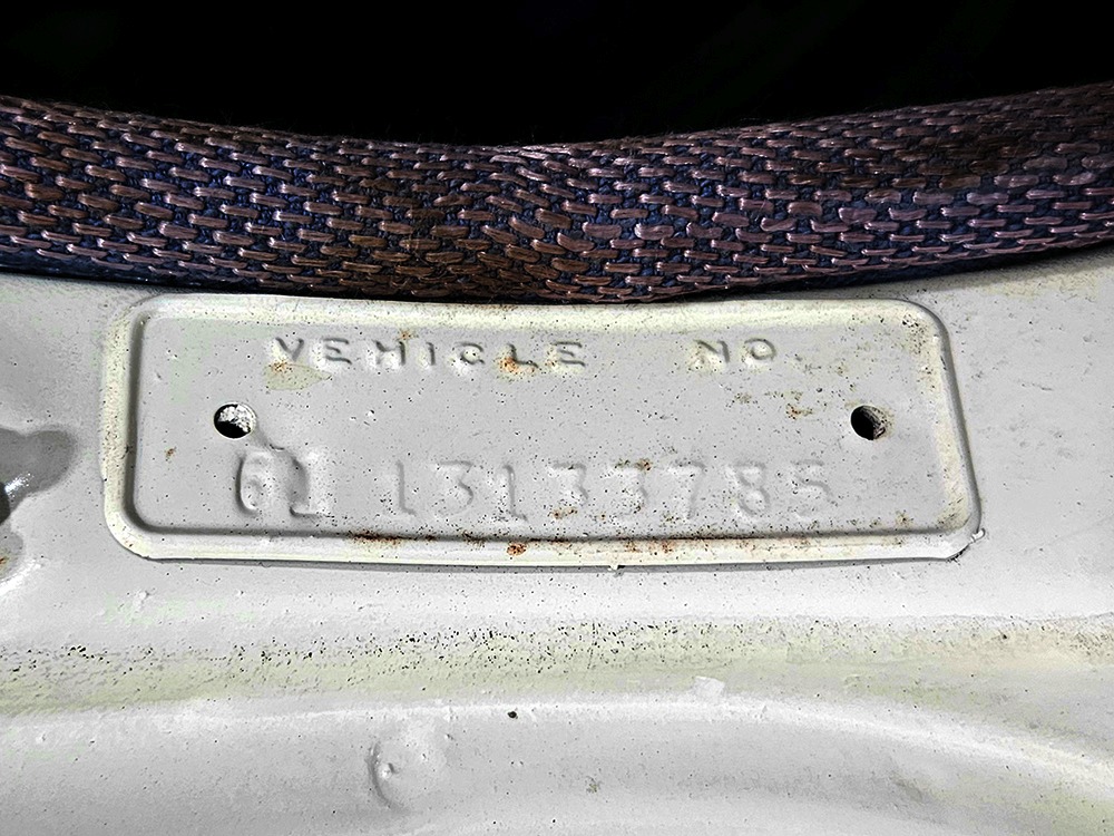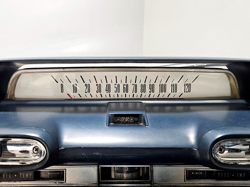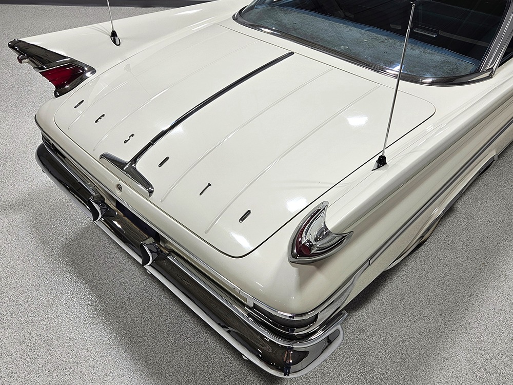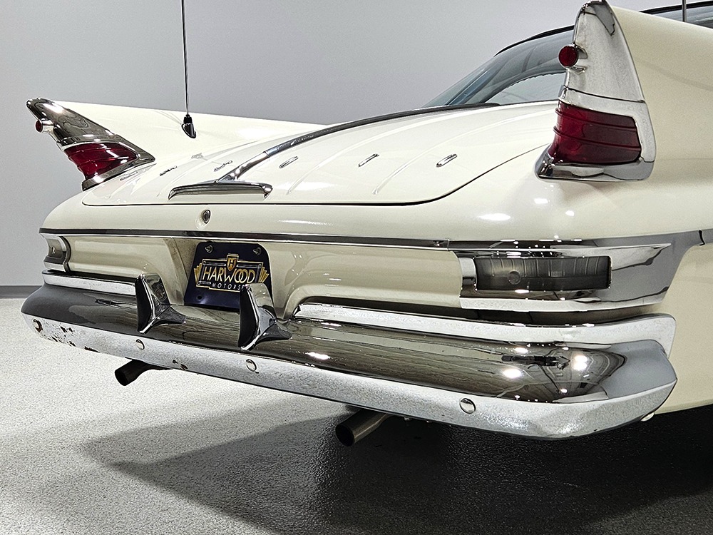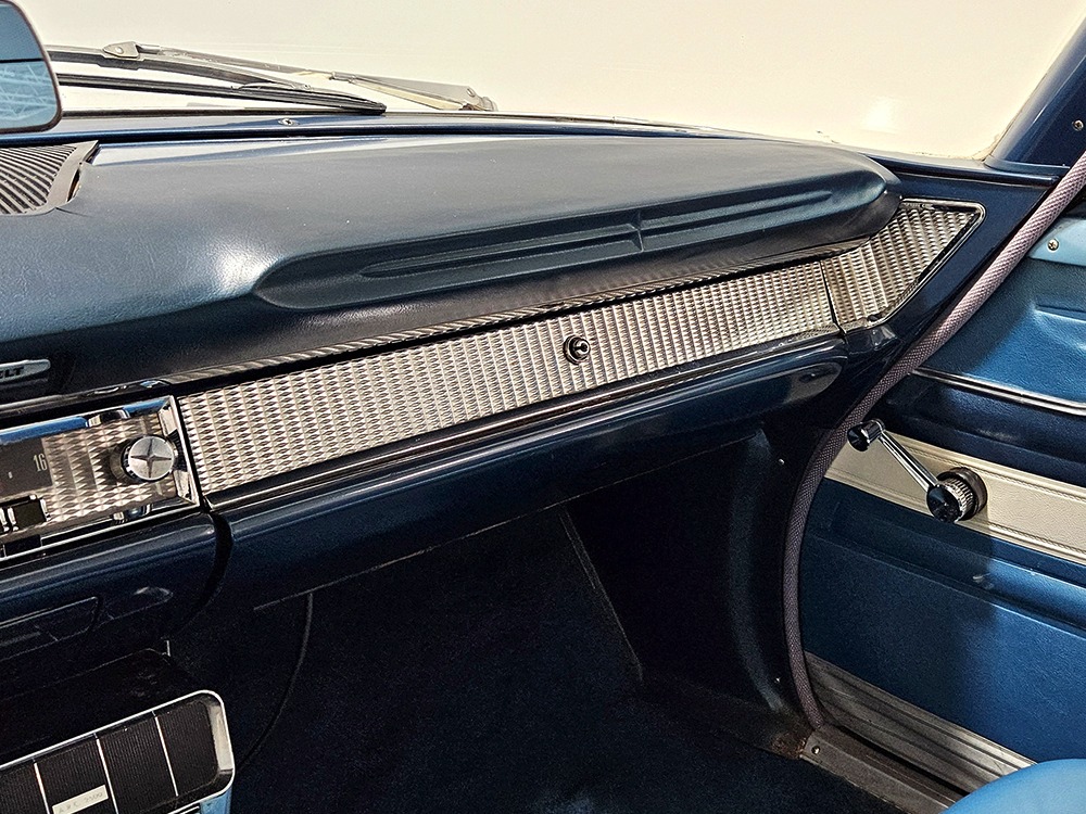 The blue cloth and vinyl interior is mostly original and in excellent condition, including the slick high-back driver’s seat that seems to highlight the captain’s chair as the most important. The space-age dash features pushbutton controls for both the transmission and the heater/defroster, and that complex steering wheel is just too cool. Aside from some minor staining on the carpets (which could easily be hidden with a floor mat), it remains in excellent condition throughout with no splits or rips in the upholstery. Even the door panels look great, echoing the shape of the fins outside. Other slick details include the dash-mounted rear-view mirror, the rotary-style clock (not functional but still pretty cool), and the band of textured bright trim that runs from end to end. The original AM radio remains in the dash (it powers up but does not tune stations) and is joined by an ultra-rare Highway Hi-Fi unit underneath (we have not tested it). The headliner features bright chrome bows and the back seat has plenty of spread-out room for adult-sized passengers. There’s also a massive trunk with correct cardboard bulkheads, matching blue carpets, and a full-sized spare with jack assembly.
