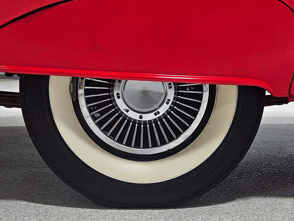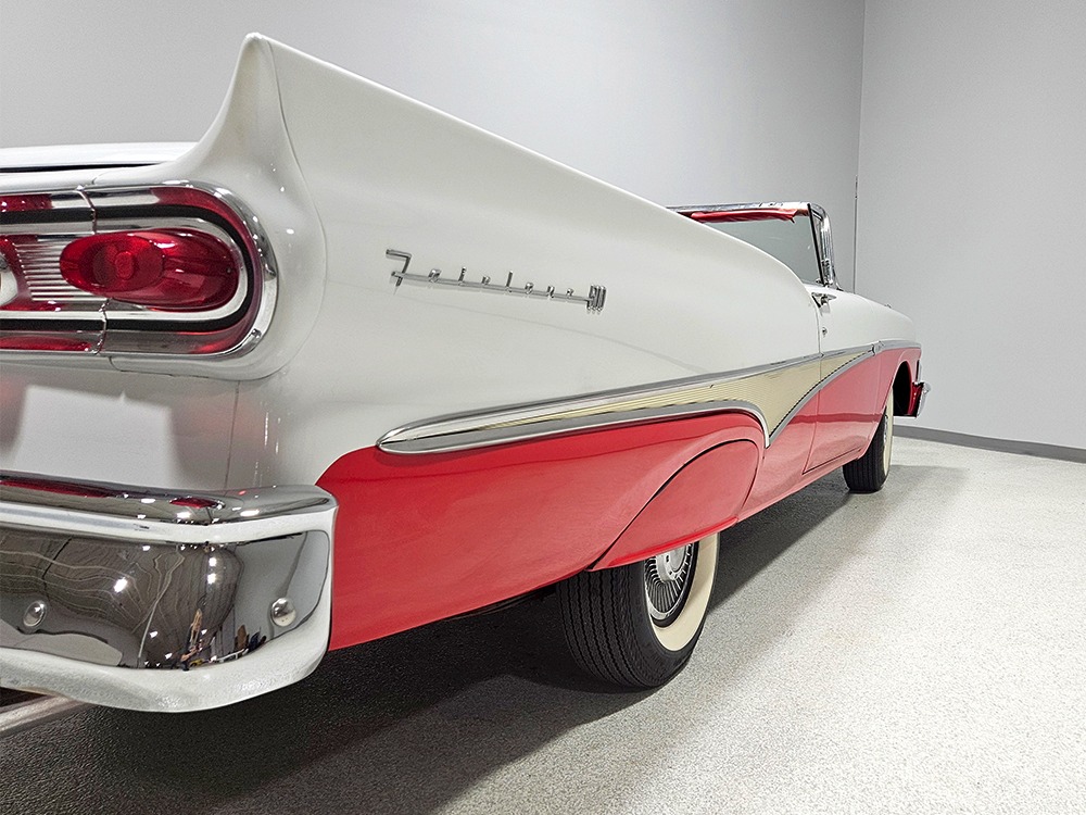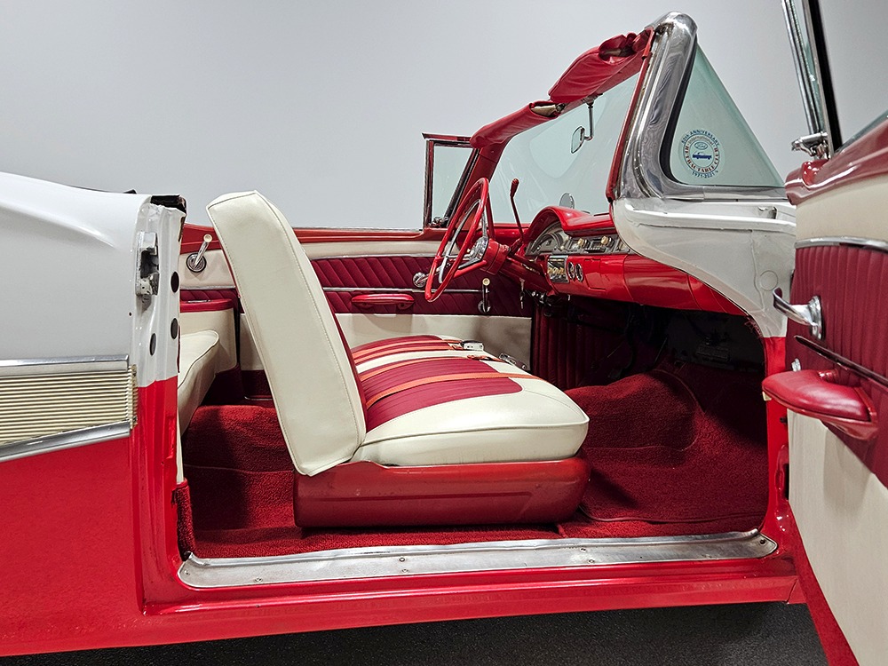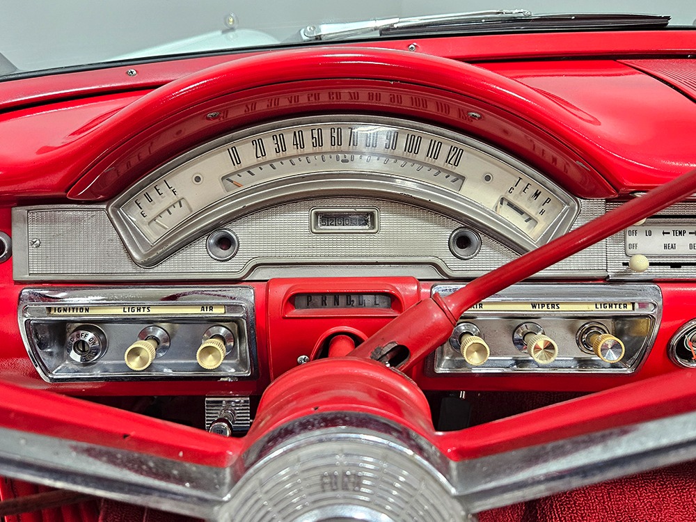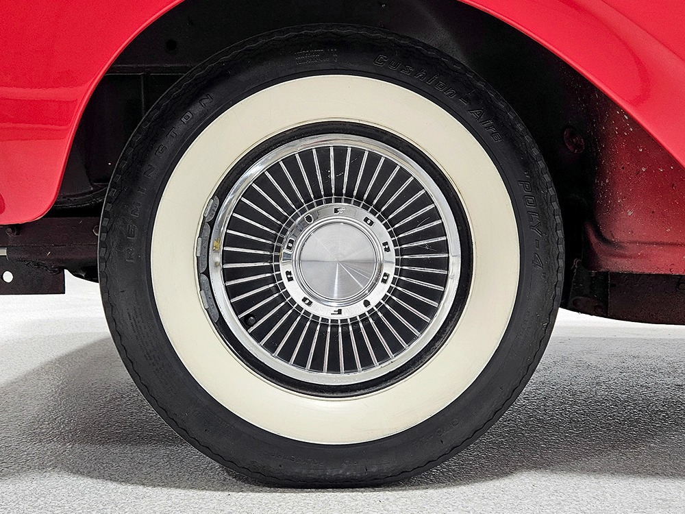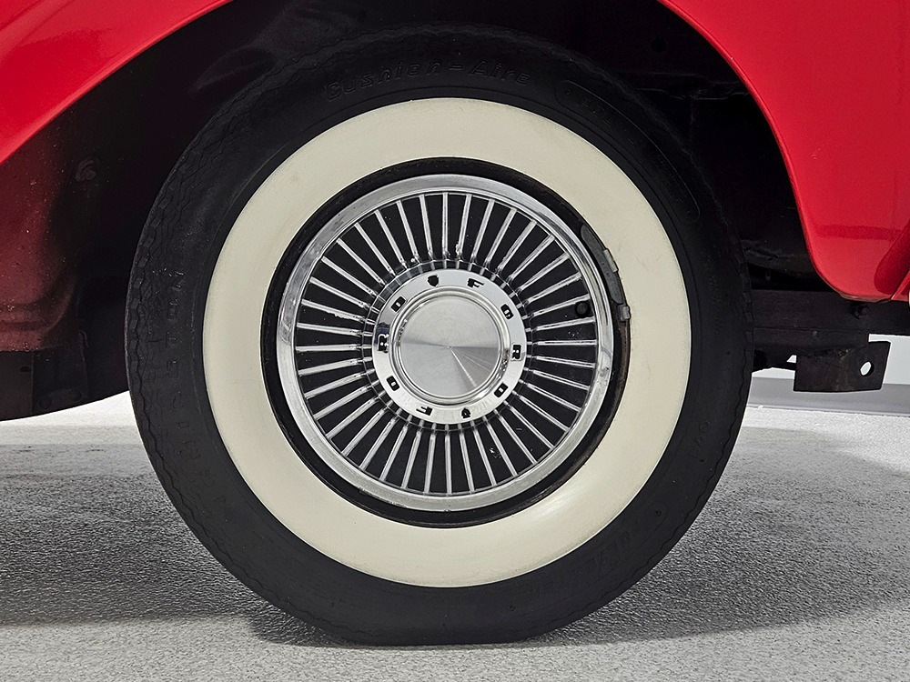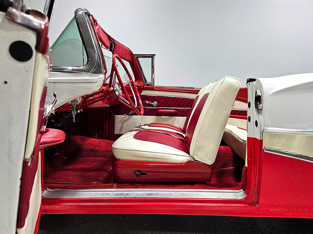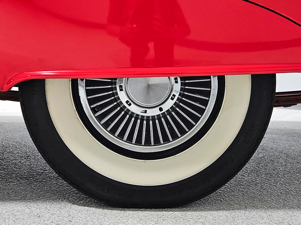 Travel is easy with Ford’s all-new-for-1958 G-code 332 cubic inch V8. Rated at 265 horsepower with a 4-barrel carburetor, it’s a good match for the Skyliner’s mass, which isn’t insignificant. Nevertheless, the strong-running FE motor never seems to work very hard and makes great V8 sounds as it goes about its business. It starts easily and after a few seconds settles into an easy idle that you can hear but not feel. It’s also finished in Ford Blue engine enamel with a chrome air cleaner and “Thunderbird” valve covers. Power steering is a nice addition on a 4200-pound convertible and most of the fittings and hardware are correct Ford pieces. Most Skyliners used Ford’s 3-speed Cruise-O-Matic automatic transmission, and that’s what you’ll find in this one as well. It’s really the right choice, and with 2.69 gears out back, it remains an effortless highway cruiser. Ford’s X-frame is incredibly robust for the big convertible and it’s in great shape with no signs of accident damage in its past. There are floor patches in the lower rear trunk, which is where water tends to collect in these cars and you won’t find many that haven’t been patched in this area. It doesn’t present any issues today and the important areas are quite solid, including the rocker areas and floors. A newer dual exhaust system with just the right rumble to it gives the Skyliner just a bit of an attitude. Also note that the brakes have been serviced, the power steering doesn’t make any unpleasant noises, and it sits on right-sized G78-14 wide whitewalls that are ideal for a 1950s cruiser.