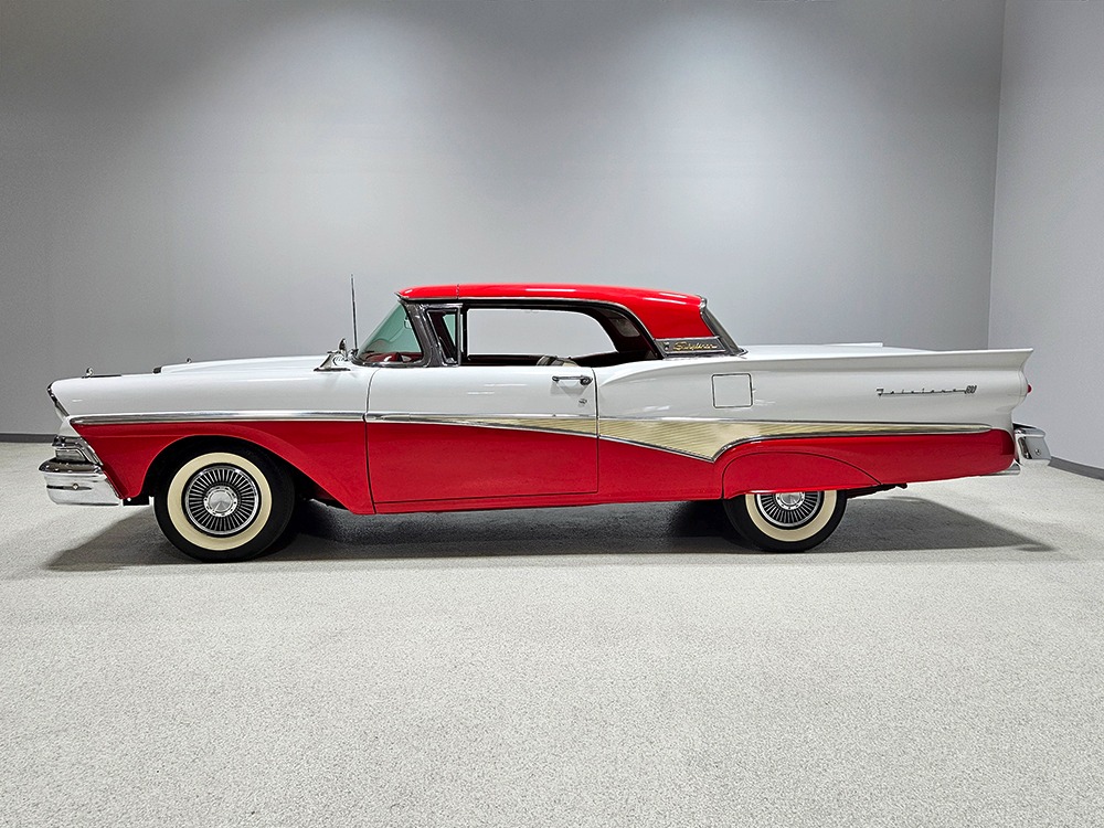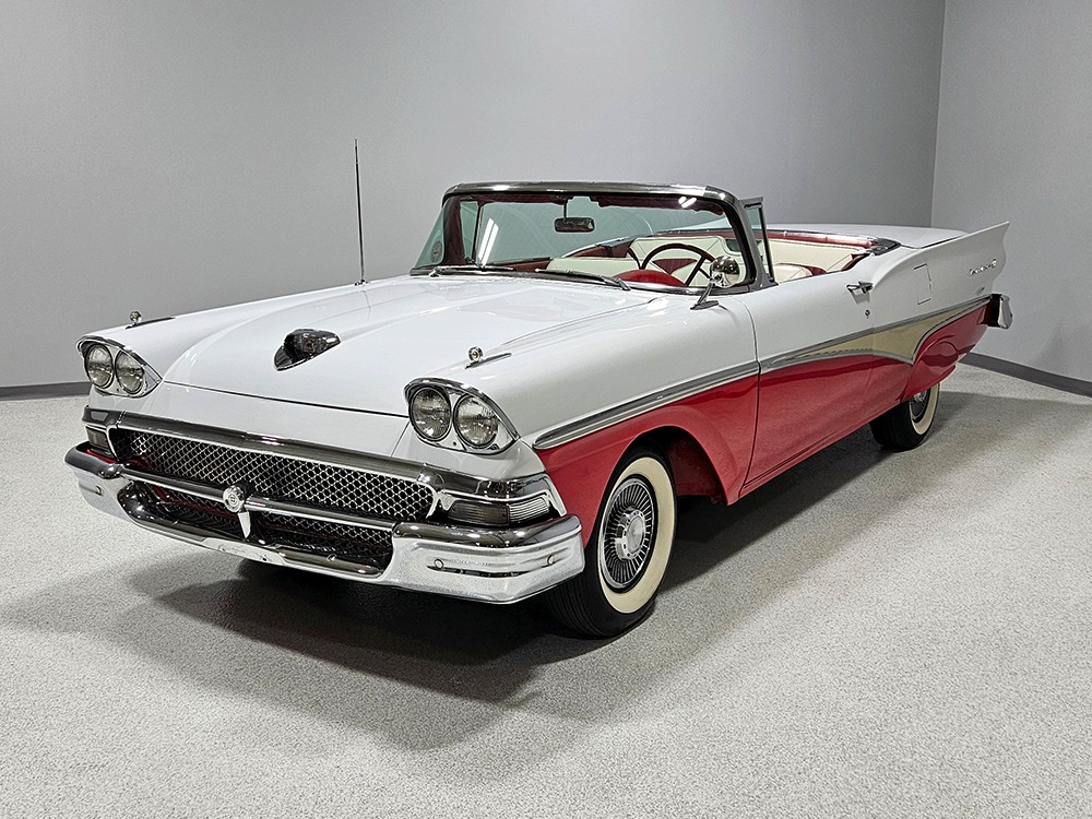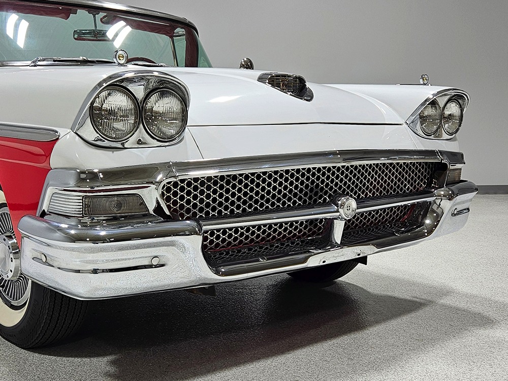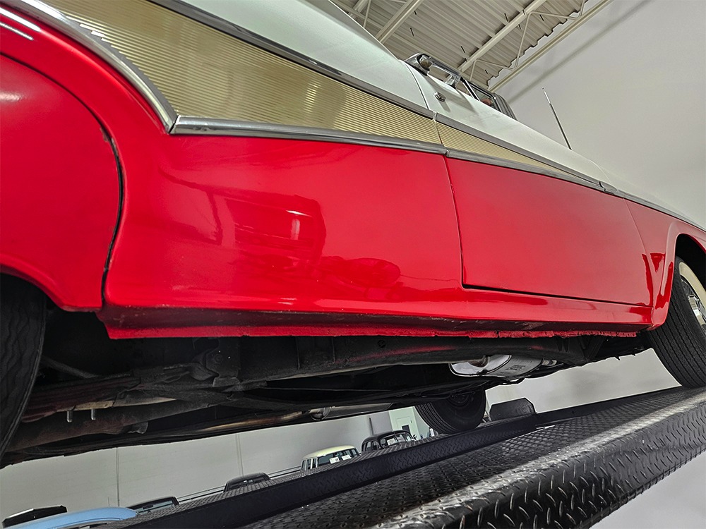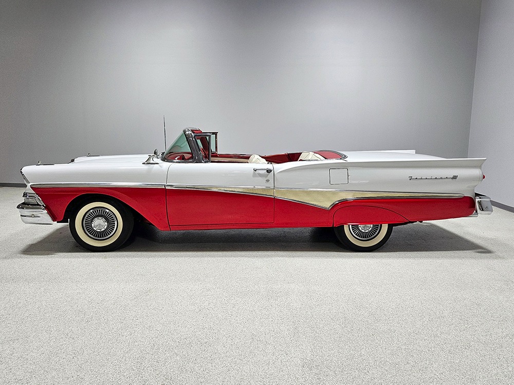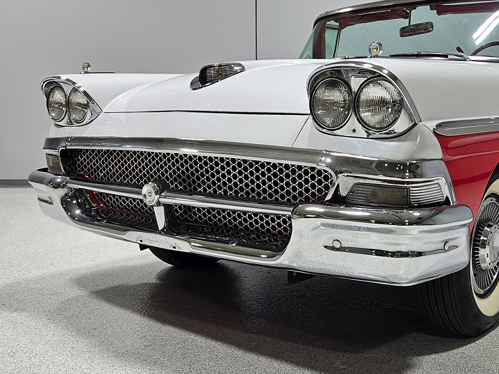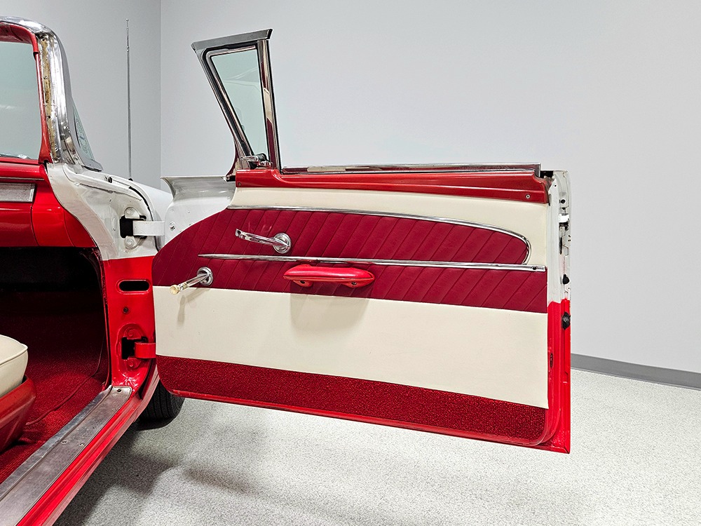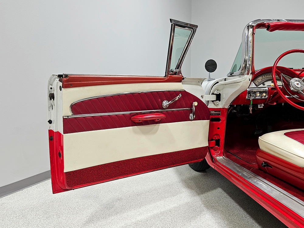 Travel is easy with Ford’s all-new-for-1958 G-code 332 cubic inch V8. Rated at 265 horsepower with a 4-barrel carburetor, it’s a good match for the Skyliner’s mass, which isn’t insignificant. Nevertheless, the strong-running FE motor never seems to work very hard and makes great V8 sounds as it goes about its business. It starts easily and after a few seconds settles into an easy idle that you can hear but not feel. It’s also finished in Ford Blue engine enamel with a chrome air cleaner and “Thunderbird” valve covers. Power steering is a nice addition on a 4200-pound convertible and most of the fittings and hardware are correct Ford pieces. Most Skyliners used Ford’s 3-speed Cruise-O-Matic automatic transmission, and that’s what you’ll find in this one as well. It’s really the right choice, and with 2.69 gears out back, it remains an effortless highway cruiser. Ford’s X-frame is incredibly robust for the big convertible and it’s in great shape with no signs of accident damage in its past. There are floor patches in the lower rear trunk, which is where water tends to collect in these cars and you won’t find many that haven’t been patched in this area. It doesn’t present any issues today and the important areas are quite solid, including the rocker areas and floors. A newer dual exhaust system with just the right rumble to it gives the Skyliner just a bit of an attitude. Also note that the brakes have been serviced, the power steering doesn’t make any unpleasant noises, and it sits on right-sized G78-14 wide whitewalls that are ideal for a 1950s cruiser.