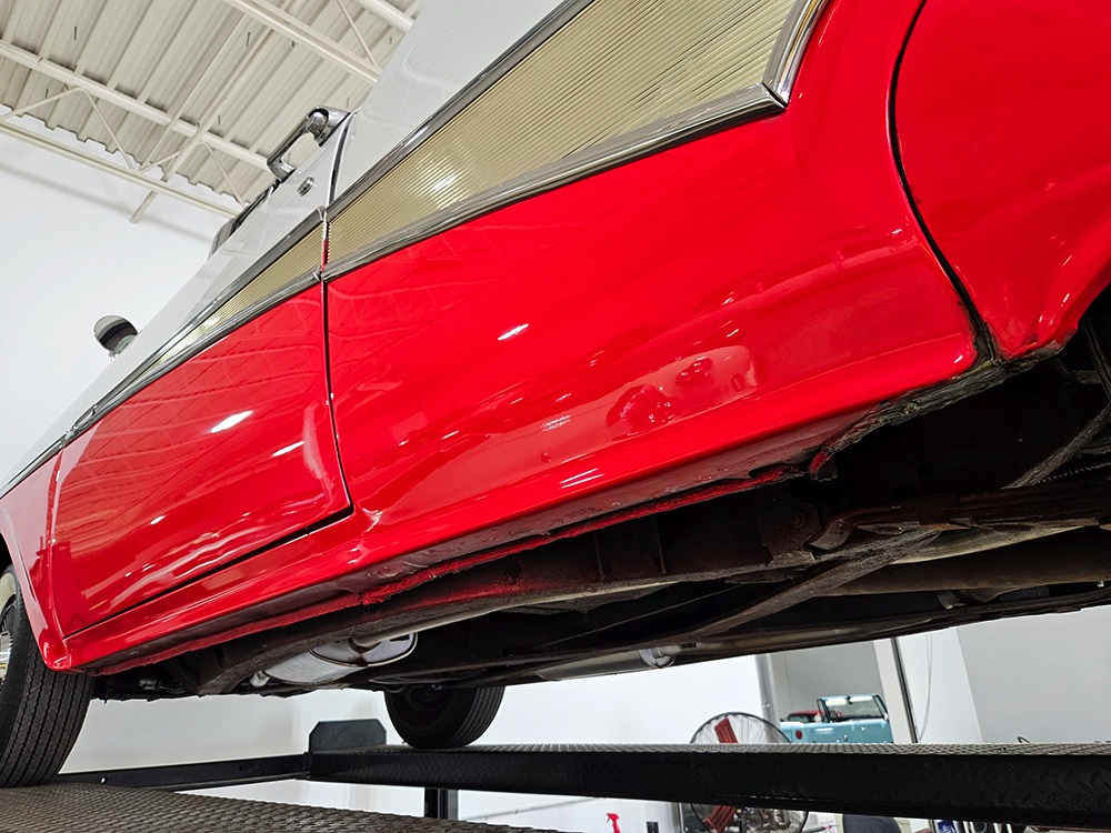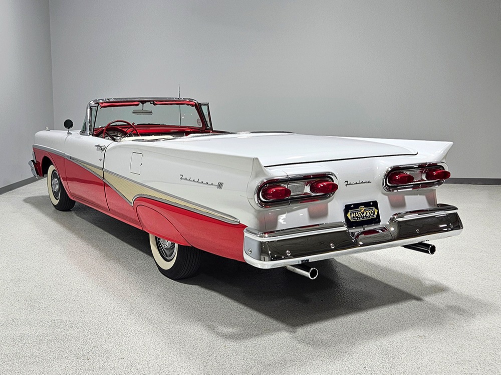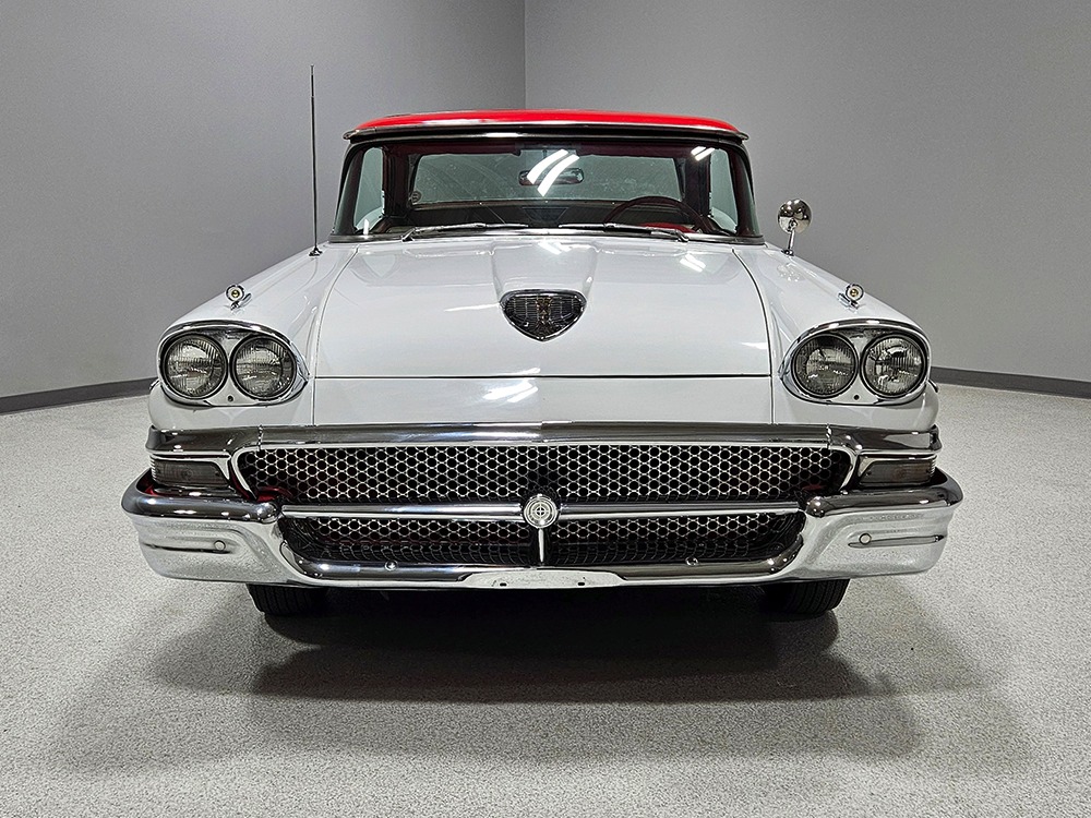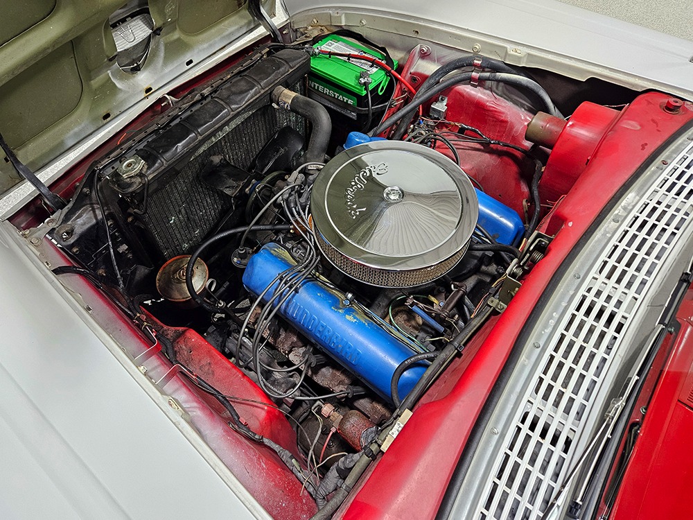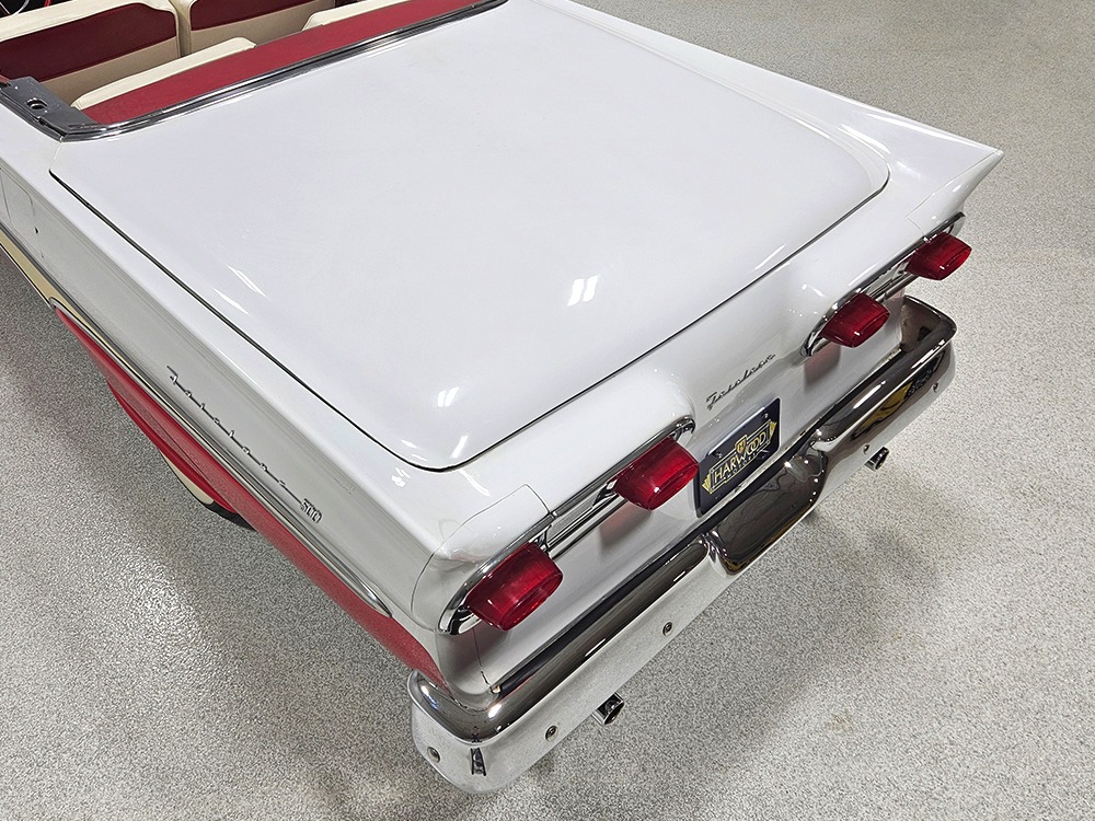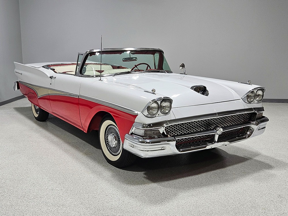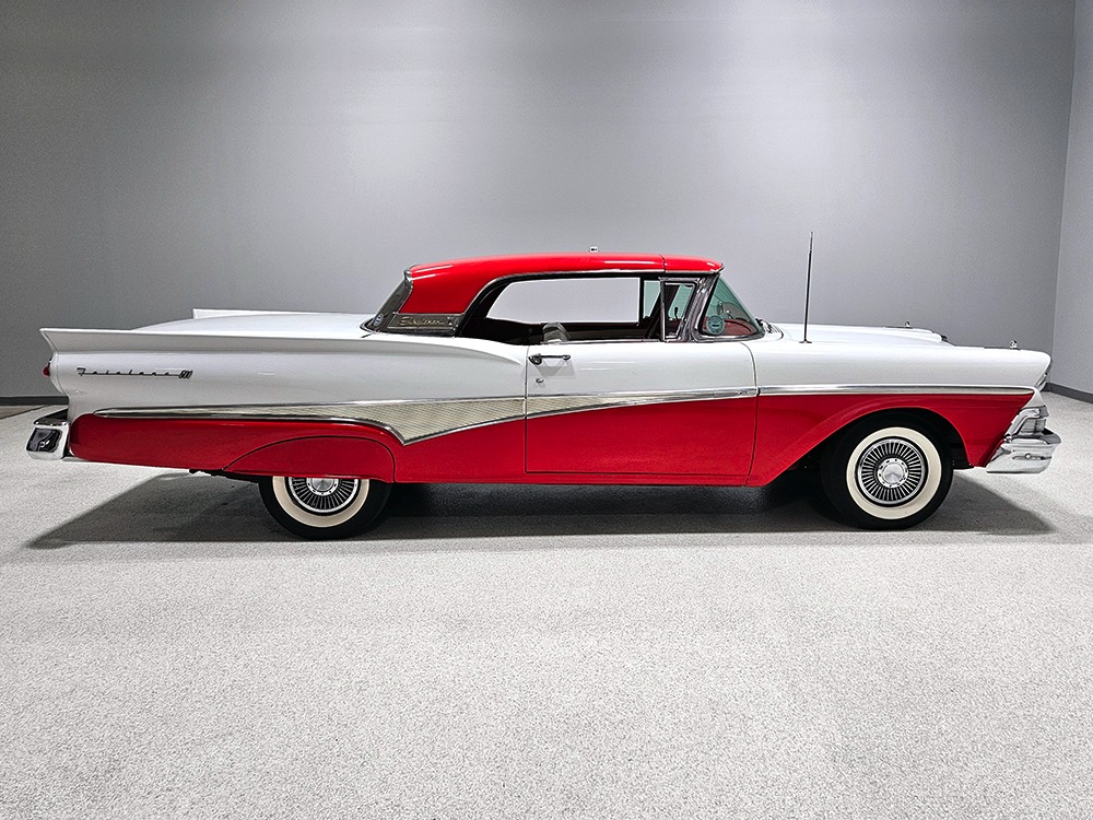 Travel is easy with Ford’s all-new-for-1958 G-code 332 cubic inch V8. Rated at 265 horsepower with a 4-barrel carburetor, it’s a good match for the Skyliner’s mass, which isn’t insignificant. Nevertheless, the strong-running FE motor never seems to work very hard and makes great V8 sounds as it goes about its business. It starts easily and after a few seconds settles into an easy idle that you can hear but not feel. It’s also finished in Ford Blue engine enamel with a chrome air cleaner and “Thunderbird” valve covers. Power steering is a nice addition on a 4200-pound convertible and most of the fittings and hardware are correct Ford pieces. Most Skyliners used Ford’s 3-speed Cruise-O-Matic automatic transmission, and that’s what you’ll find in this one as well. It’s really the right choice, and with 2.69 gears out back, it remains an effortless highway cruiser. Ford’s X-frame is incredibly robust for the big convertible and it’s in great shape with no signs of accident damage in its past. There are floor patches in the lower rear trunk, which is where water tends to collect in these cars and you won’t find many that haven’t been patched in this area. It doesn’t present any issues today and the important areas are quite solid, including the rocker areas and floors. A newer dual exhaust system with just the right rumble to it gives the Skyliner just a bit of an attitude. Also note that the brakes have been serviced, the power steering doesn’t make any unpleasant noises, and it sits on right-sized G78-14 wide whitewalls that are ideal for a 1950s cruiser.